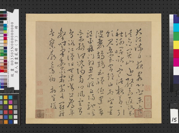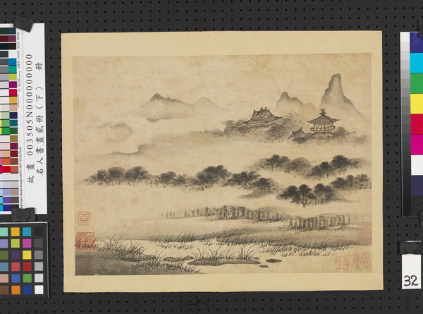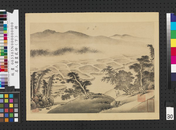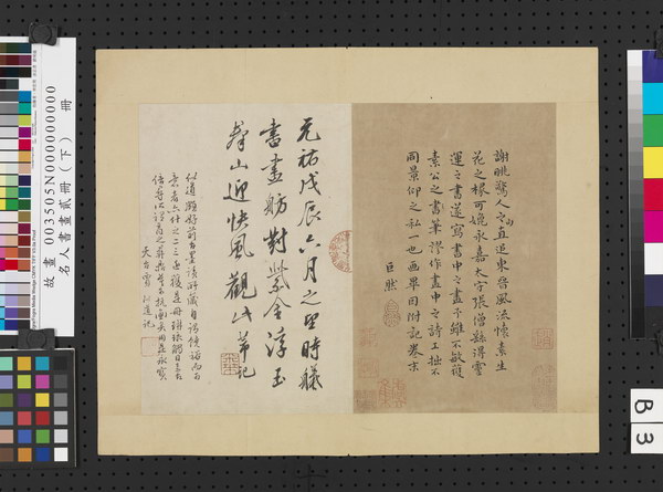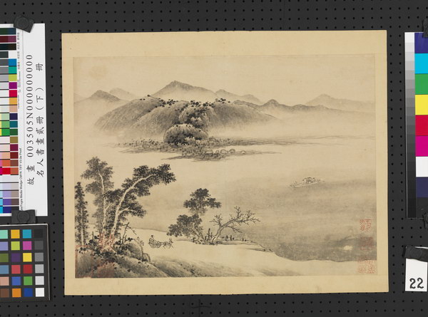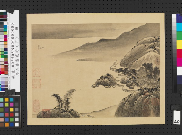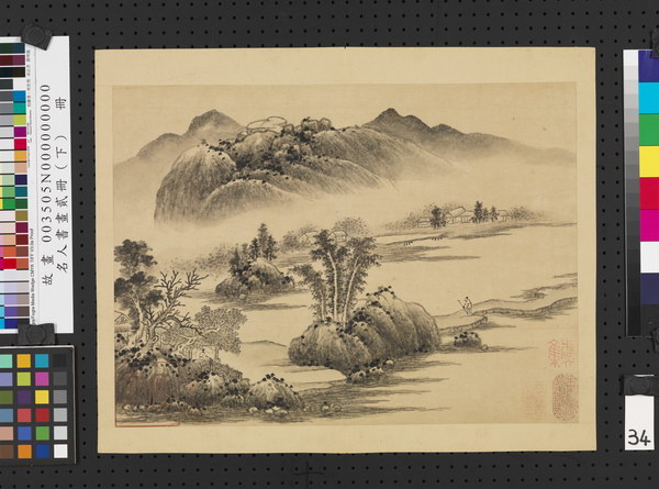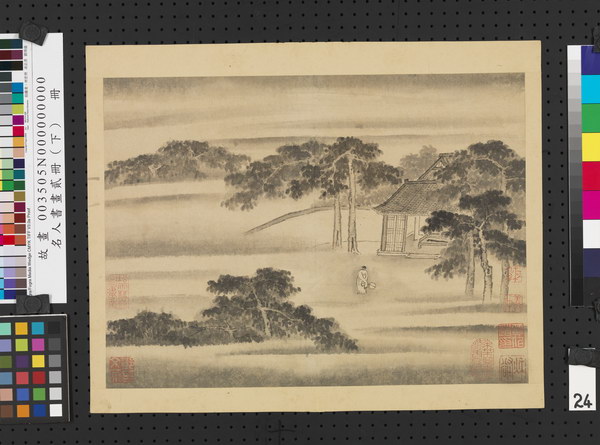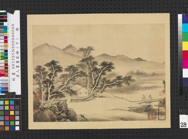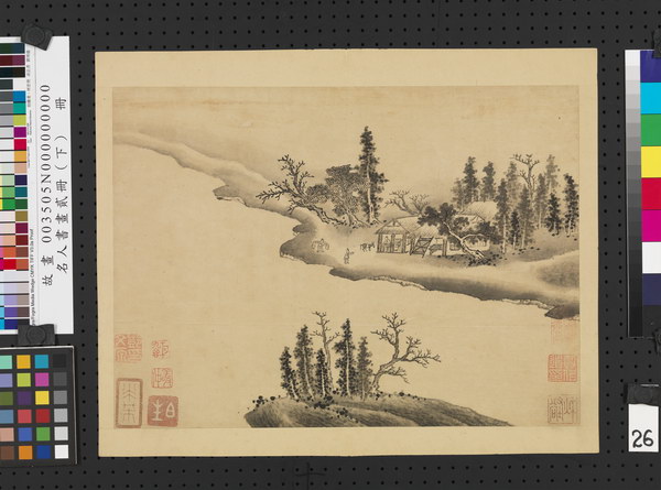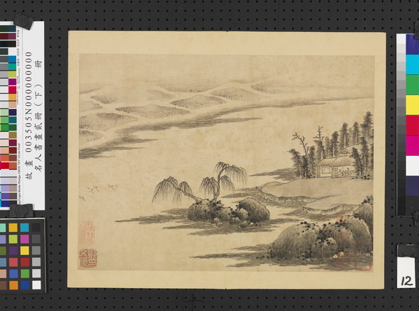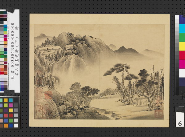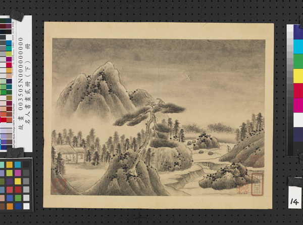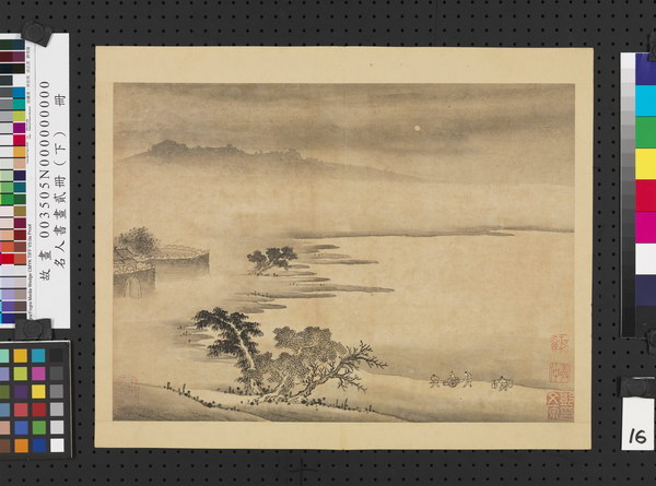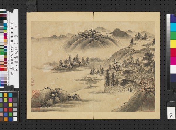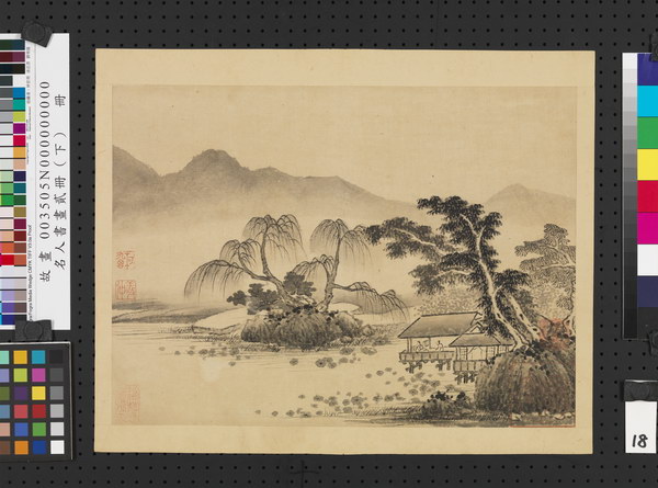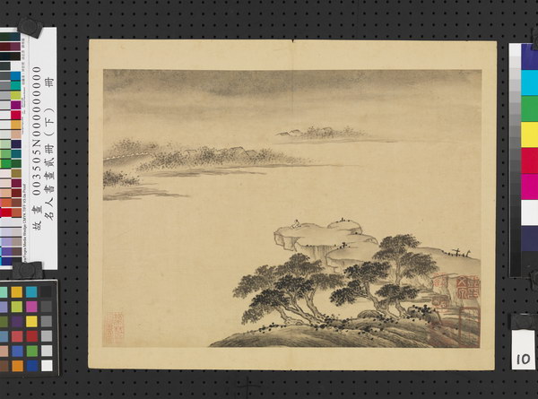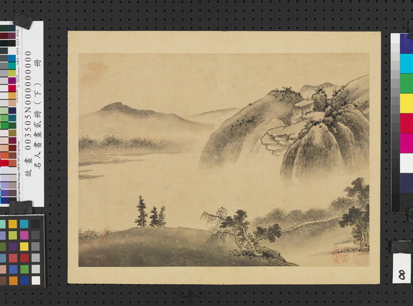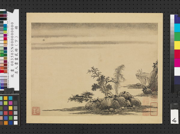传南朝梁张僧繇画谢灵运诗意。此套分上下两册,应为明人绘制托名之作,一页书诗,一页诗意画。