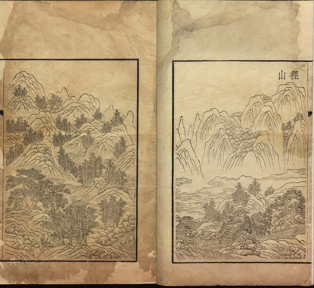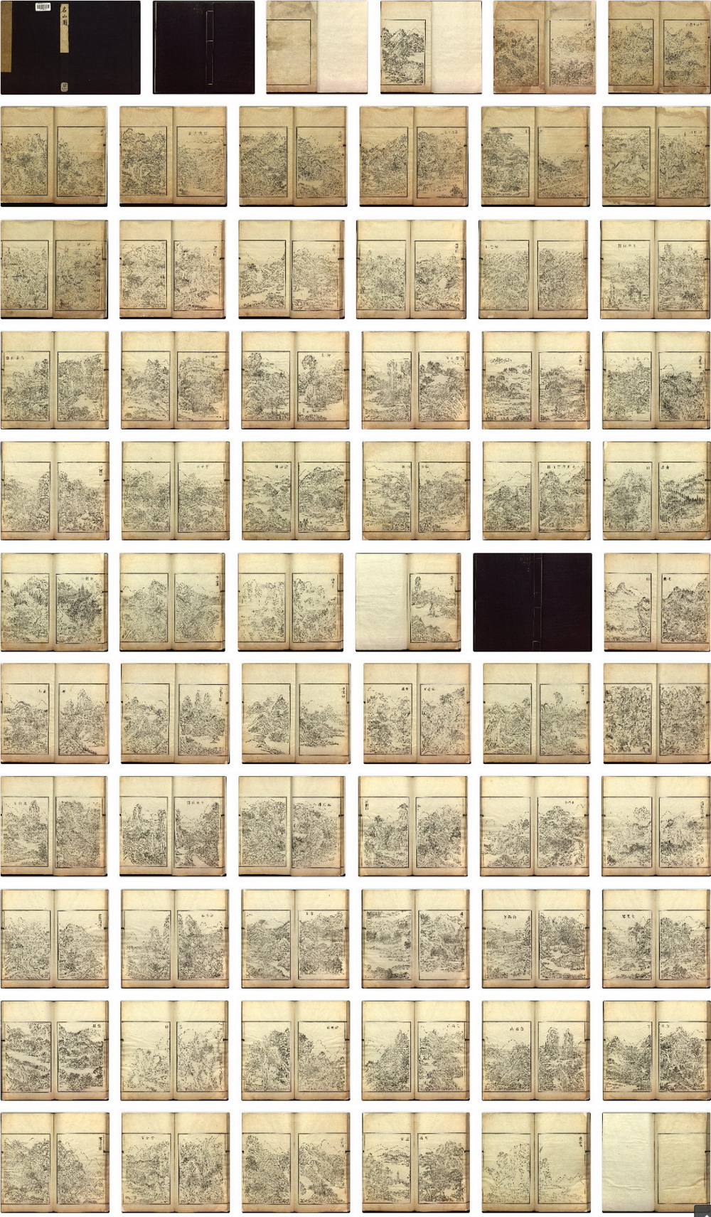 这部山水作品原无书题,是一部木刻印刷杰作,在著名的中国山水志中占有重要地位。此作品为残本,上册有30面,下册31面。有些左上角和右上角记录了中国名山的名称,有些不记名,还有一些有奇峰、溪流、名胜和花园的名称。