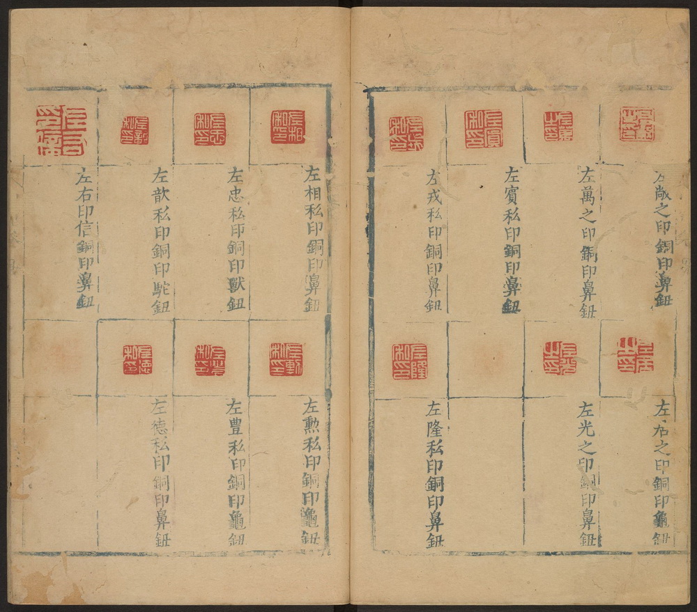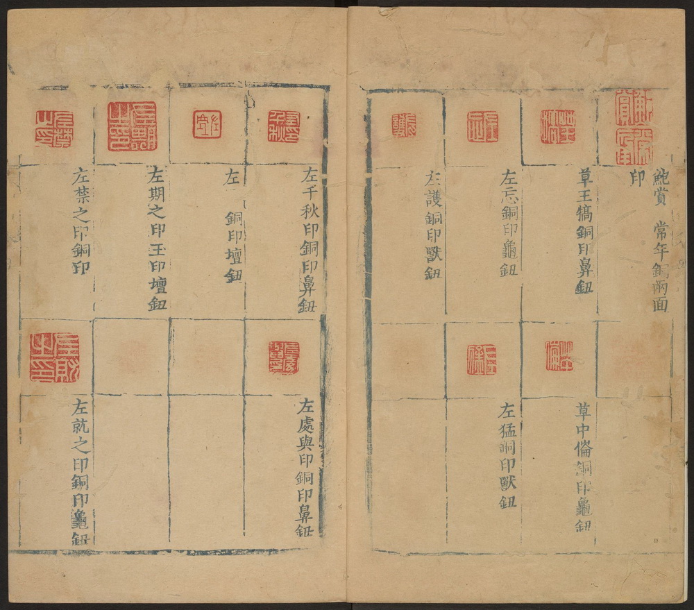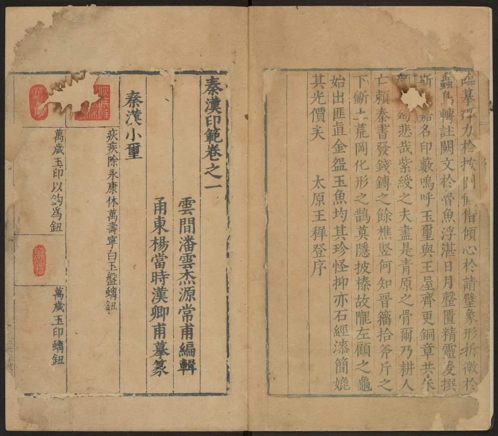 明末摹刻印谱之风盛行,万历年间潘云杰与陆鑨辑摹《秦汉印范》六卷,内杂部分所藏古铜印,共收印2600余方。由当时名家苏宜、杨当时同摹,印虽略逊干秦汉真印,却比木版《印薮》强。