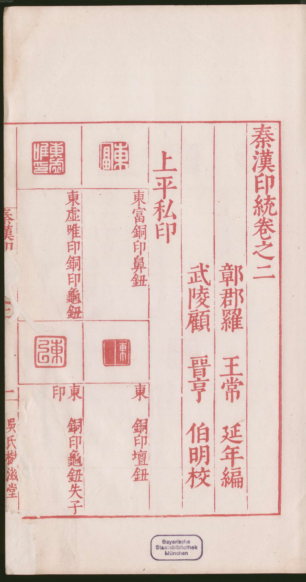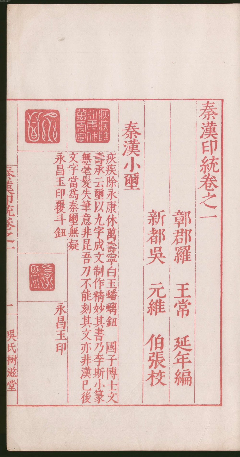 秦汉印统,内容包括战国时期铜质姓名私印、两汉魏晋南北朝铜质官印与含肖形印在内的私印。此本八卷罗王常编,吴元维、顾晋亨同校,龚善长刻。此本版心中镌书名及卷次,下镌”吳氏樹滋堂”;卷端题”鄣郡羅王常延年編,新都吳元維伯張校”;卷一末镌”萬曆歲丙午春王正月望日新都吳氏樹滋堂繡梓”,又题”吳郡張珮之書刻”;卷八末镌”長洲龔善長刊”。