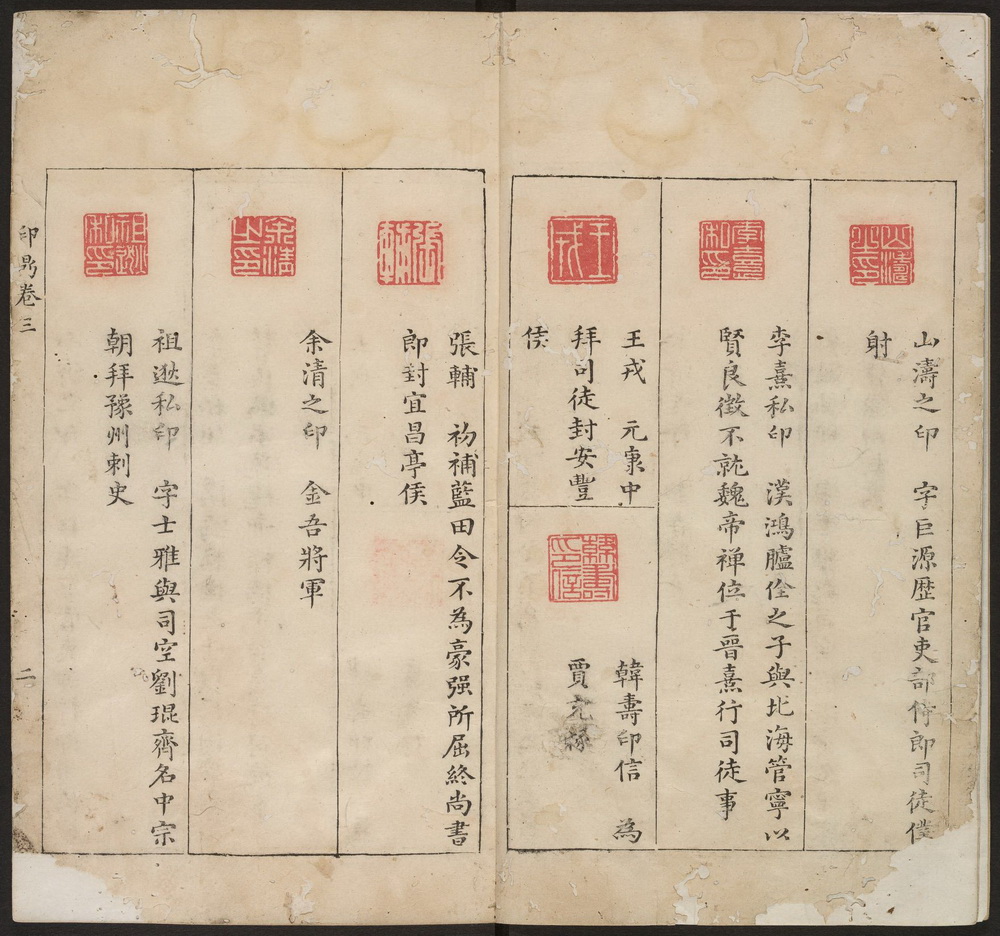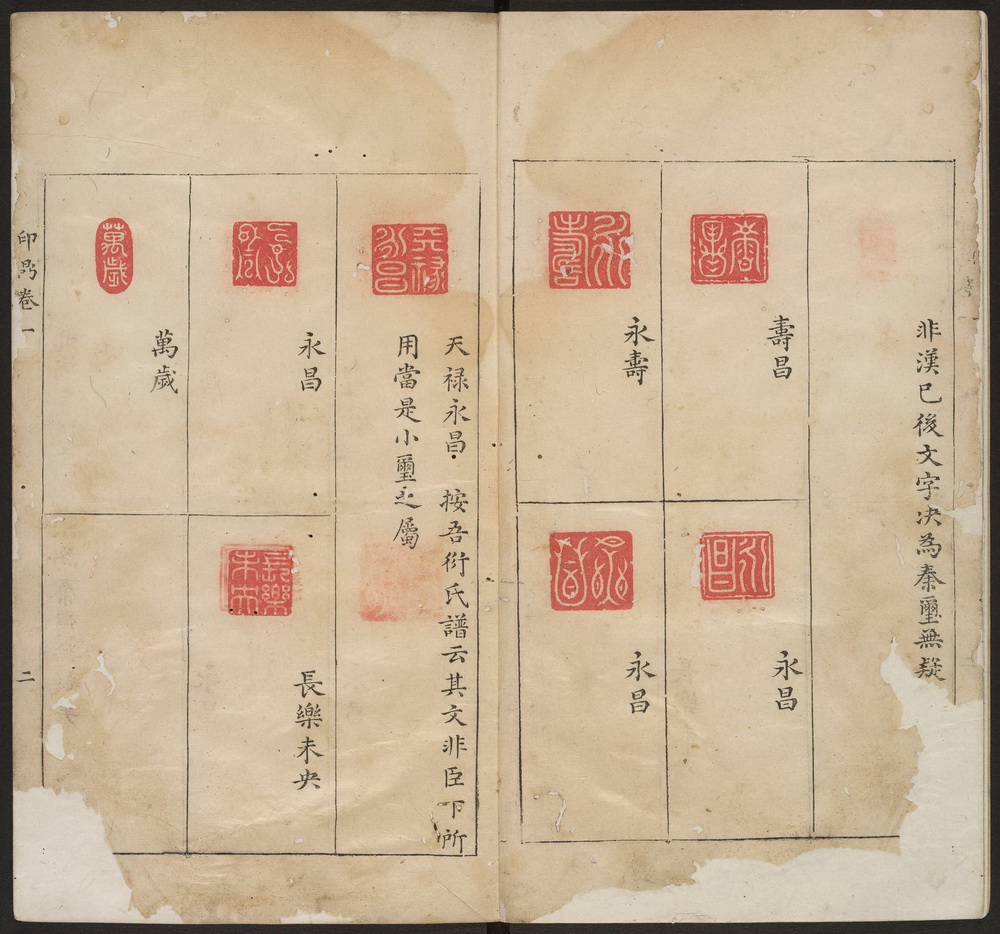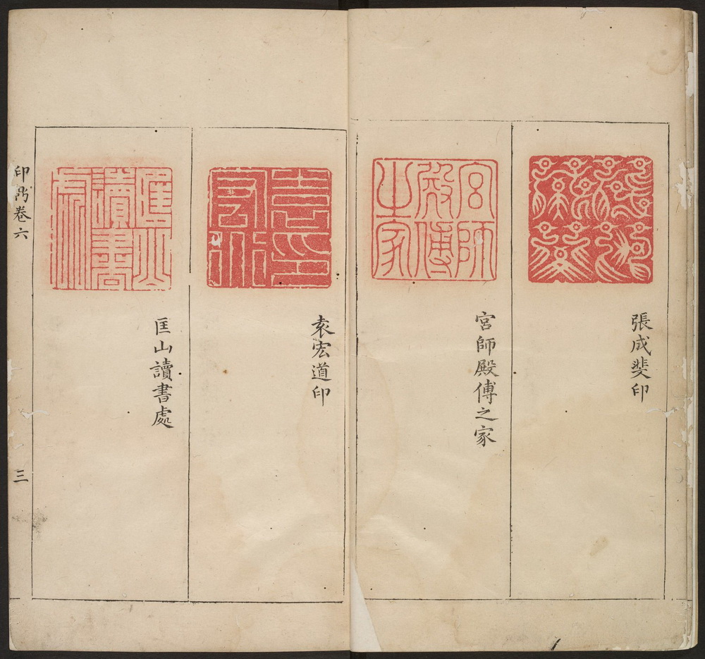 《石鼓斋印鼎》,又名《印鼎》,共九卷。明代余藻(其斋堂为石鼓斋)摹辑集秦至明历代玺印录成此谱。墨格,每面四印至六印,分上下格。有朱继祚序及余藻自序。