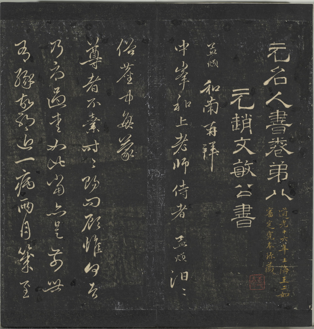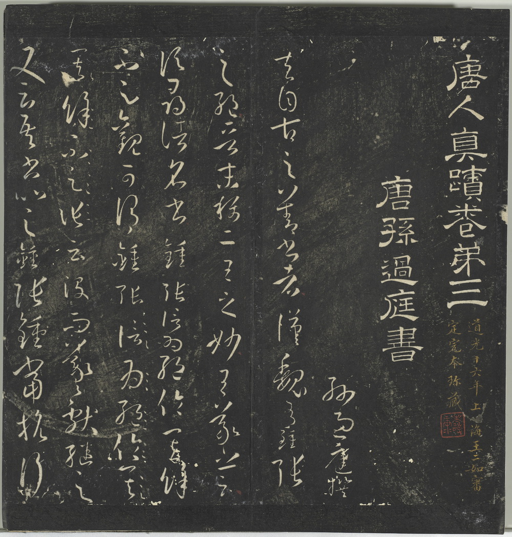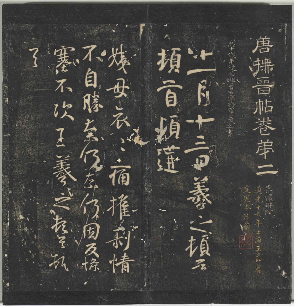 此《停云馆帖》由明代书法家文徵明及其子选录的一部丛帖,得名于其父文林建造的停云馆。全帖共十二卷,收录法帖百余种(书家八十多人),包含晋至元代的名迹及明人书法作品。刻石自明嘉靖十六年至三十九年 ,共一百二十一石。此为清道光十六年上海王二如审定完本珍藏明拓本(应为明代章文翻刻拓本)。