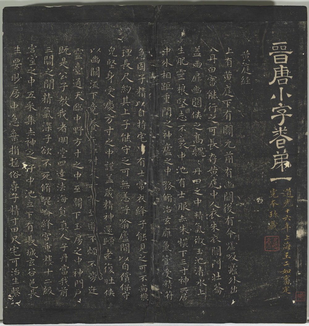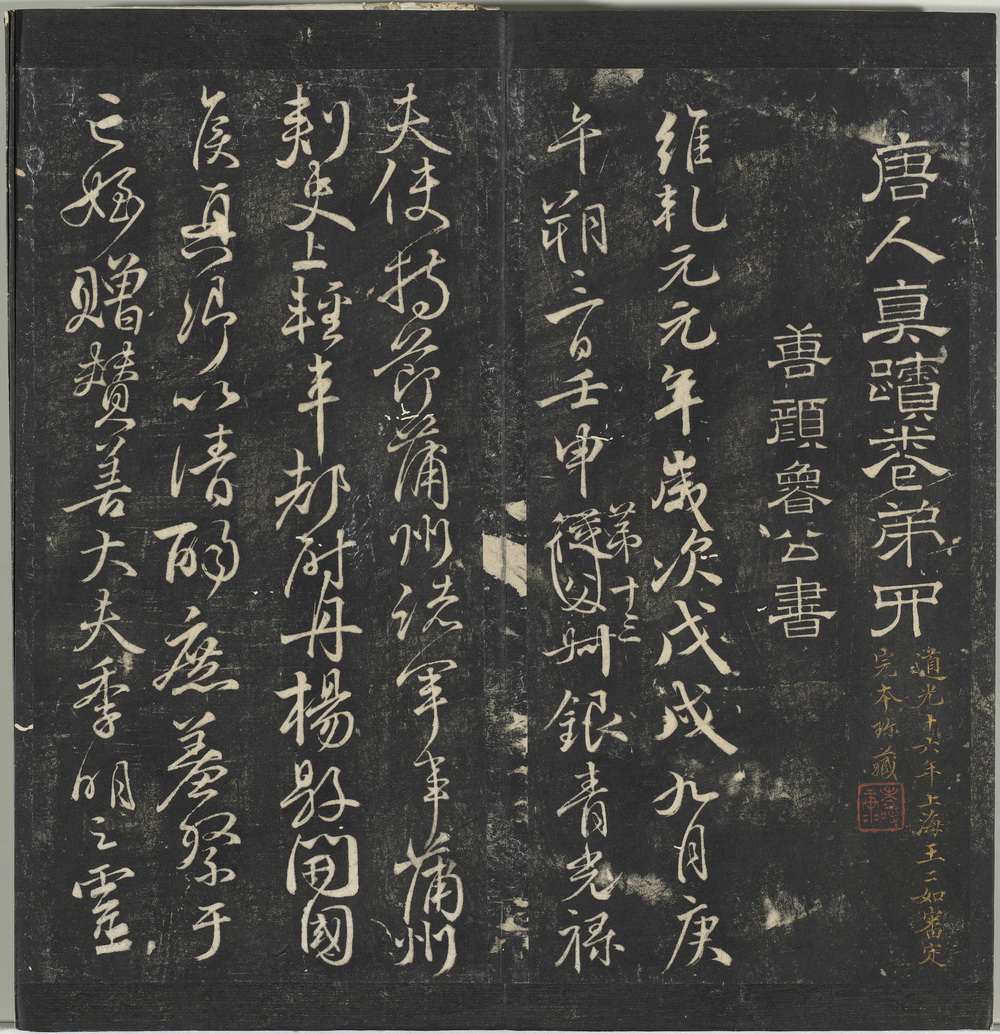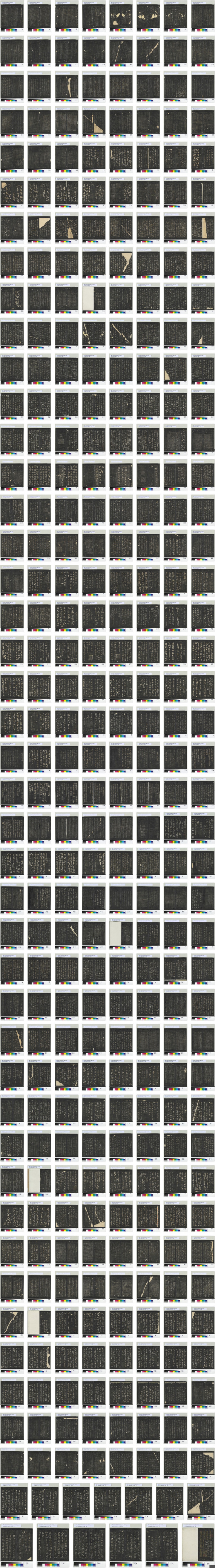 此《停云馆帖》由明代书法家文徵明及其子选录的一部丛帖,得名于其父文林建造的停云馆。全帖共十二卷,收录法帖百余种(书家八十多人),包含晋至元代的名迹及明人书法作品。刻石自明嘉靖十六年至三十九年 ,共一百二十一石。此为清道光十六年上海王二如审定完本珍藏明拓本(应为明代章文翻刻拓本)。