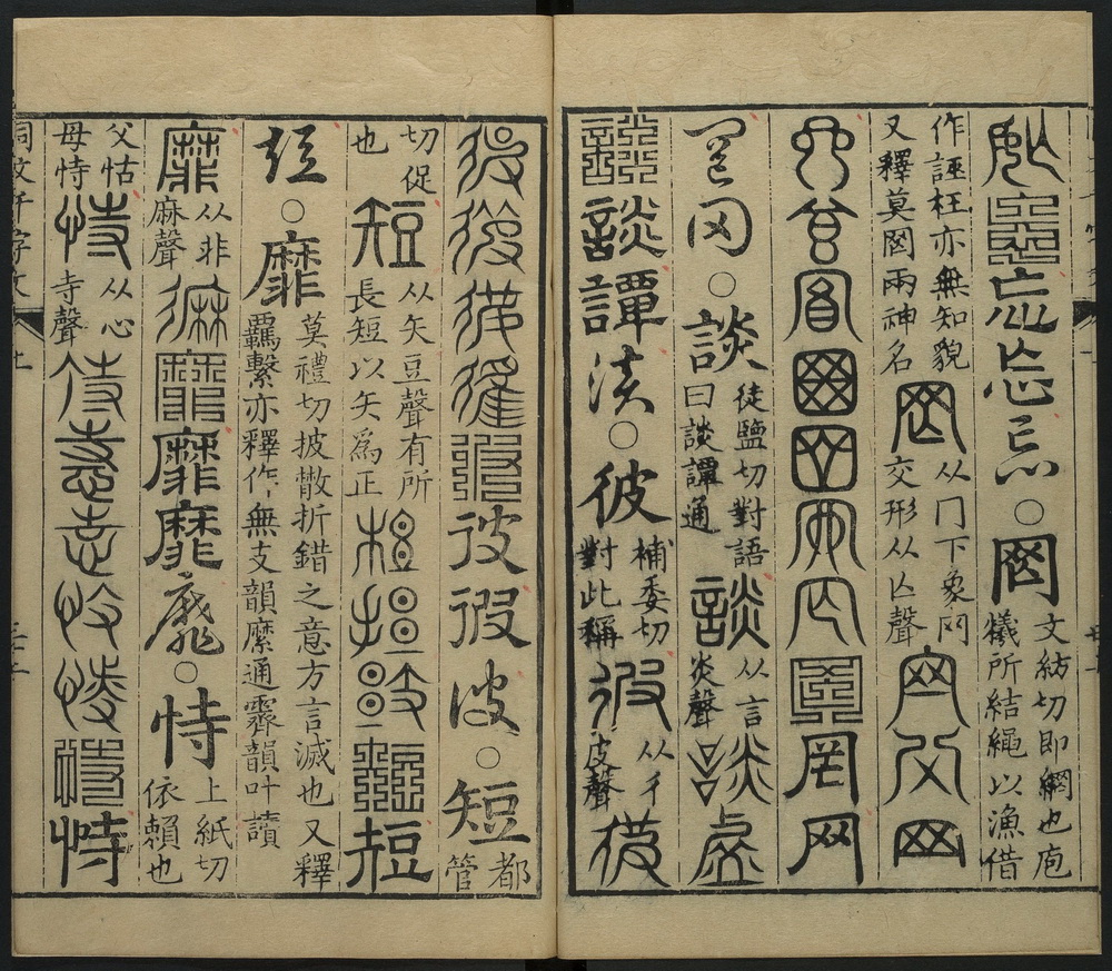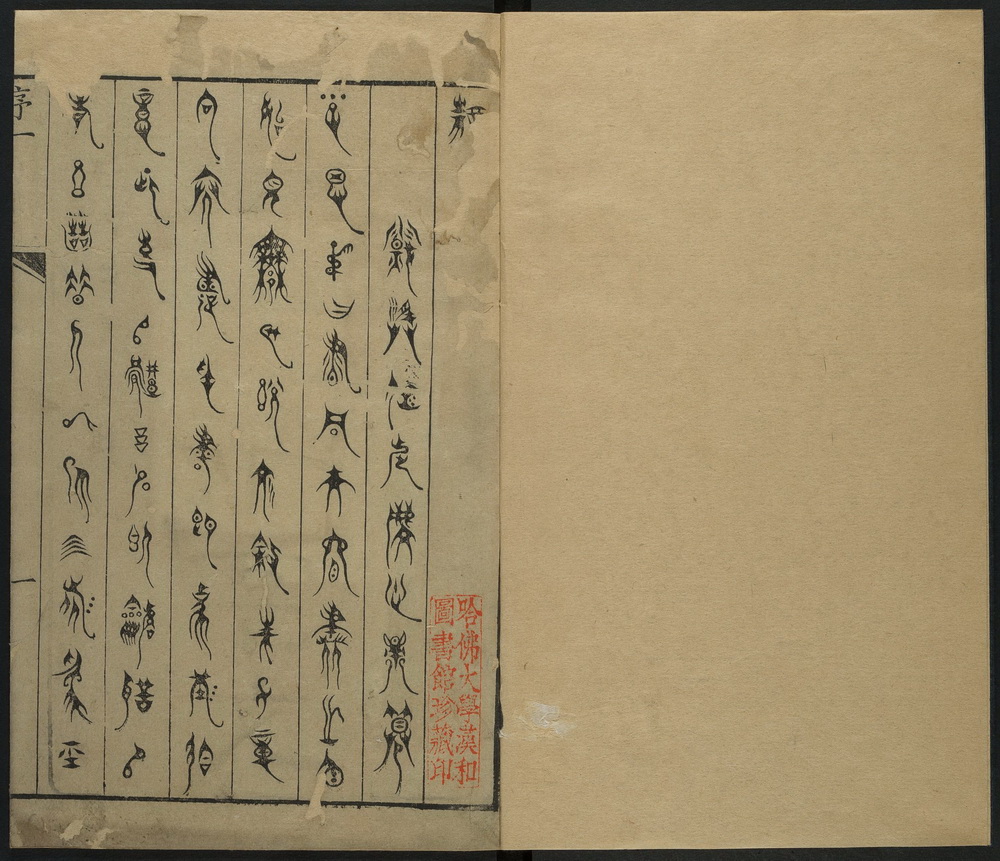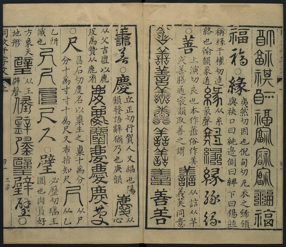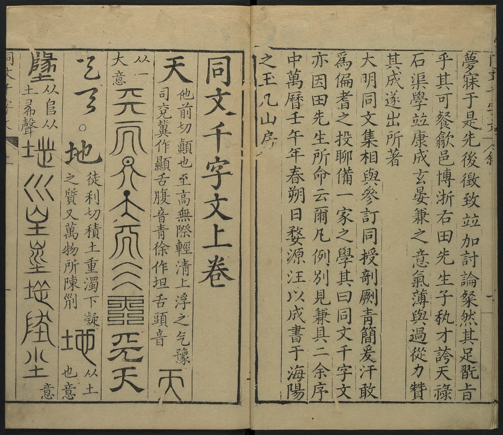 《千字文》是南朝梁周兴嗣所作的一首长韵文,形式为四言韵文,首尾连贯,每四字一句共1000字,字不重复。《千字文》是中国早期的蒙学课本,由于涵盖了天文、地理、自然、社会、历史等多方面的知识,是启蒙和教育儿童的最佳读物,也是一部生动优秀的小百科。《千字文》流传了1400多年表明,它既是一部流传广泛的童蒙读物,也是中国传统文化的一个组成部分。本资料五行十字,四周单边,白口单鱼尾,书口下间有刻工,框高 20.5 x 13厘米。版心镌有黄池、黄錤、三洋等刻工姓名。