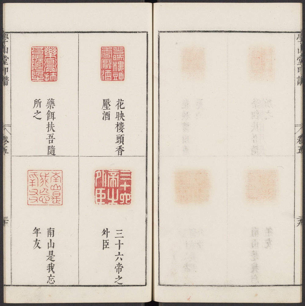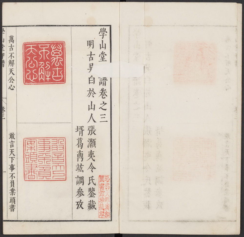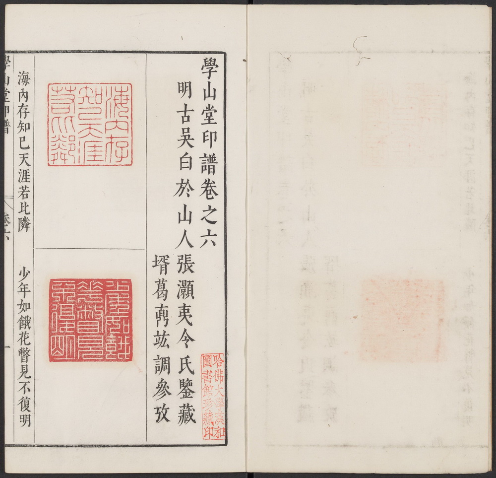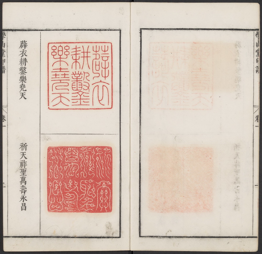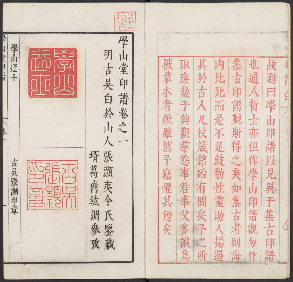 《学山堂印谱》为明末张灏编辑,葛鼒竑调参集当时代篆刻家作品而成。全书共八卷,共汇集五十余家所镌刻子史成语闲章而成,每页二至四印,收录印数达二千余钮,前附诸家(董其昌、陈继儒等)序、跋、题辞和诸家学山记题咏。