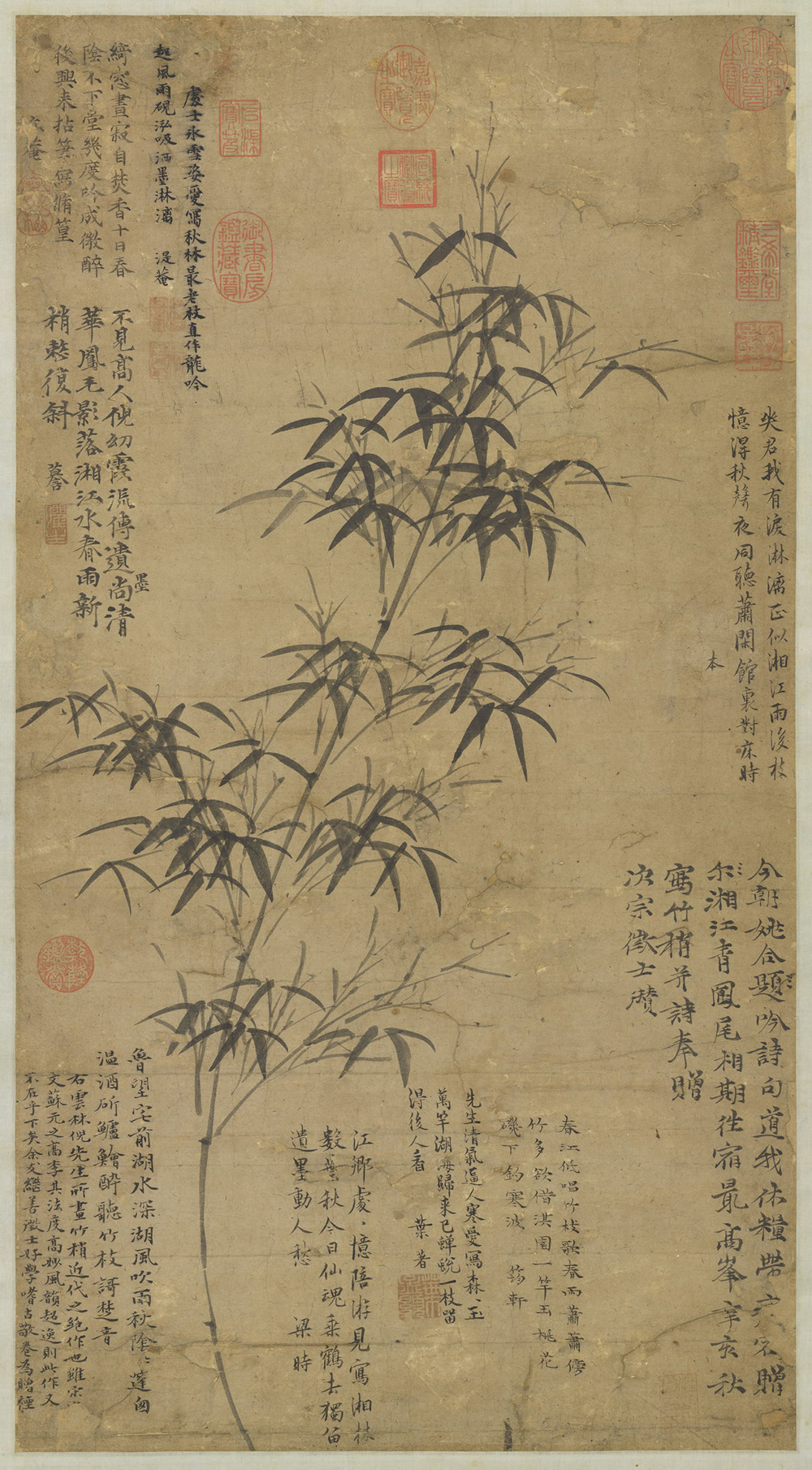 本幅写新篁侧出,竹叶俱呈弧状,不写雨而雨意盎然。幅左题句言及:「哭君我有淚淋漓,正似湘江雨後枝。」元代文人画思想鼎盛,画家多假物象暗寄故国之思,复因逸笔简率,时人乃得于画幅空处题赞抒怀,益增作品画外之趣。此帧墨竹题语多达十则,即为文人画的具体印证。