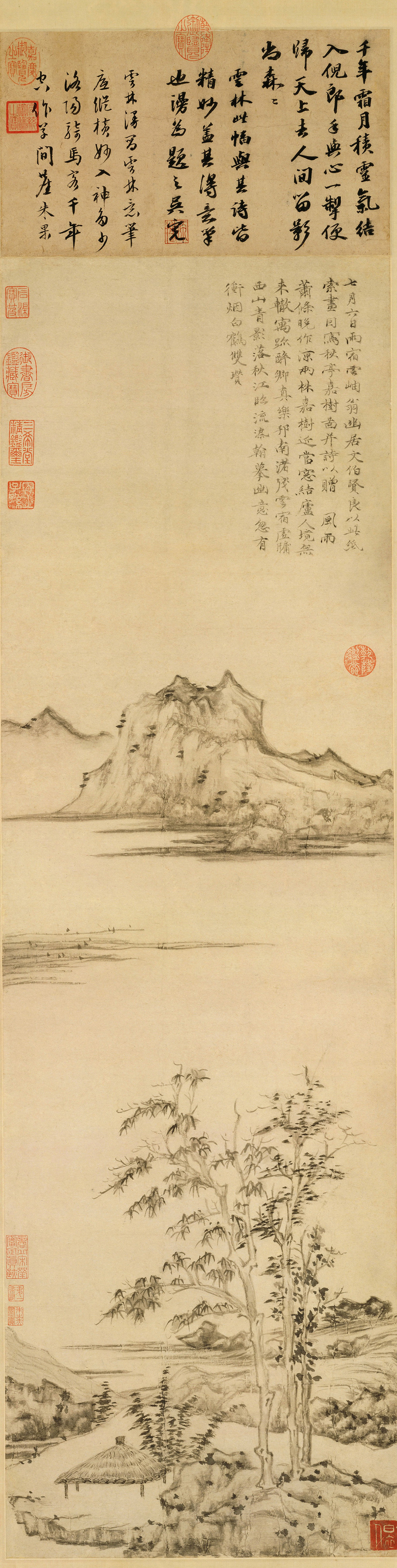 图中绘平坡远岫,草亭嘉树,广阔的江面上露出汀渚一角,幽静雅洁,仿佛笼罩在一片月色之中。画面取三段式构图,用笔尖峭秀逸,树干皆双勾,稍事皴染,树叶点法富于变化。墨色较为干淡,仅以浓墨点苔,提出精神,为沉寂的画面融入了些许生气。
