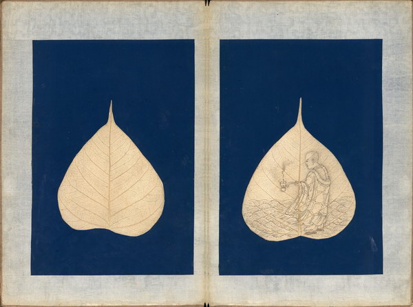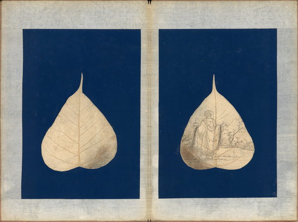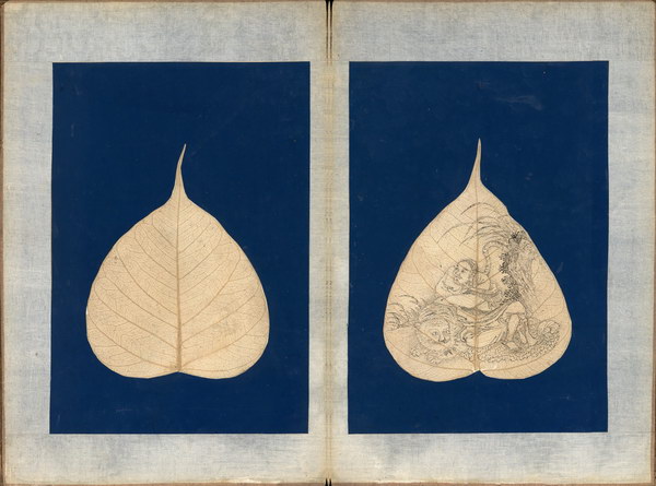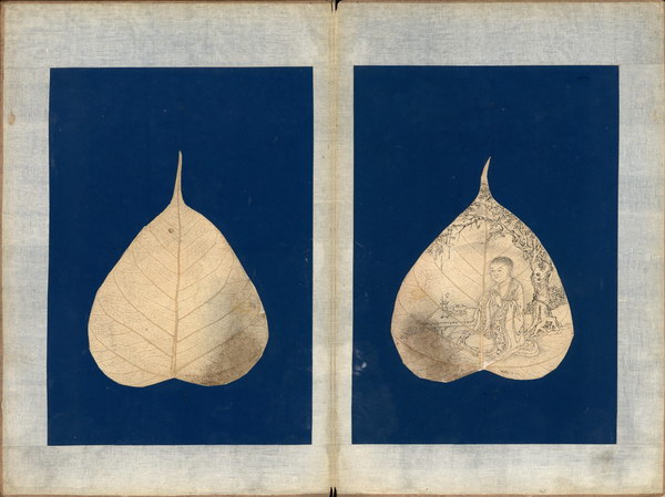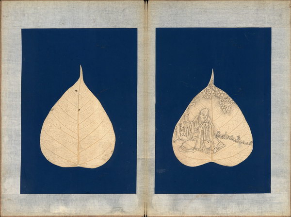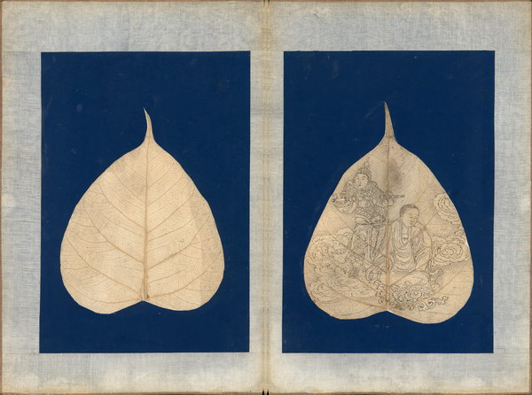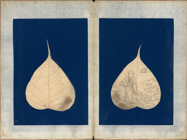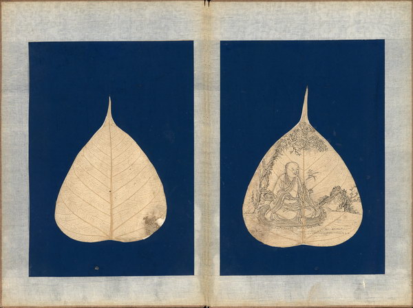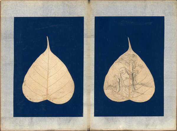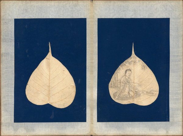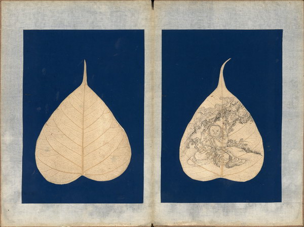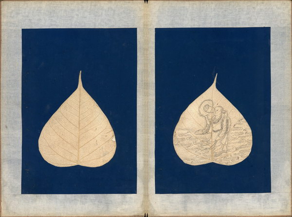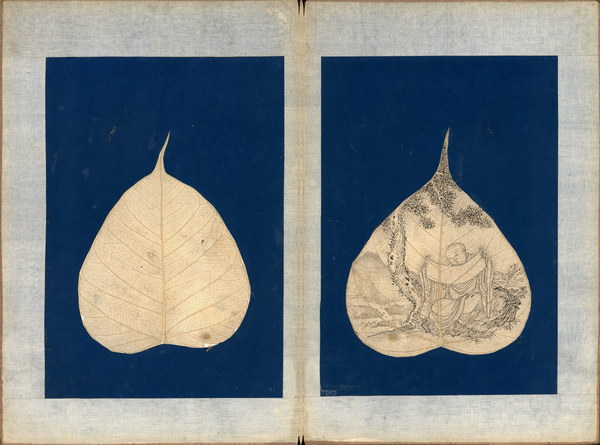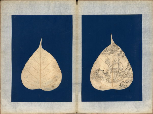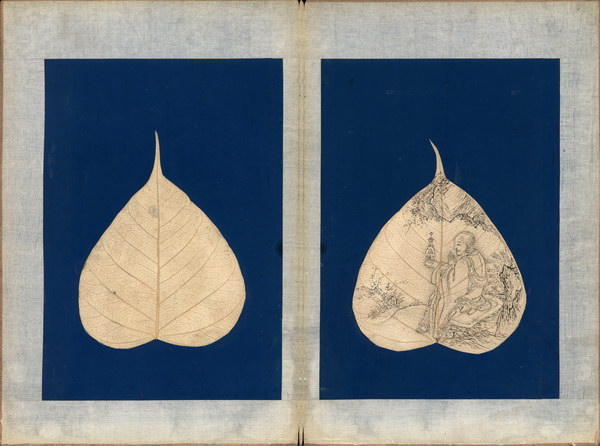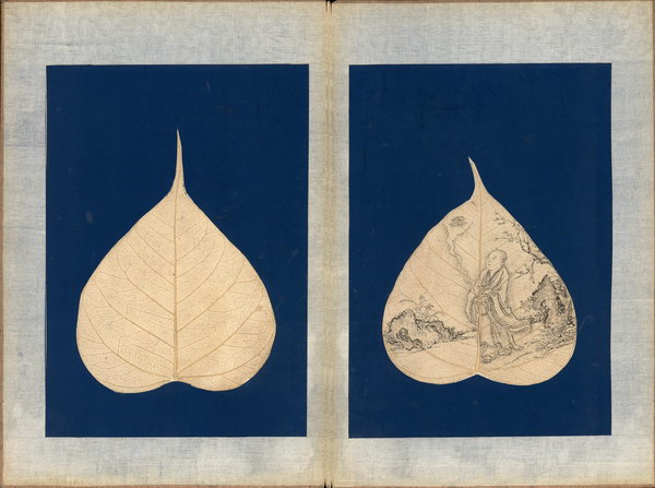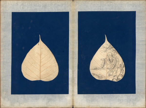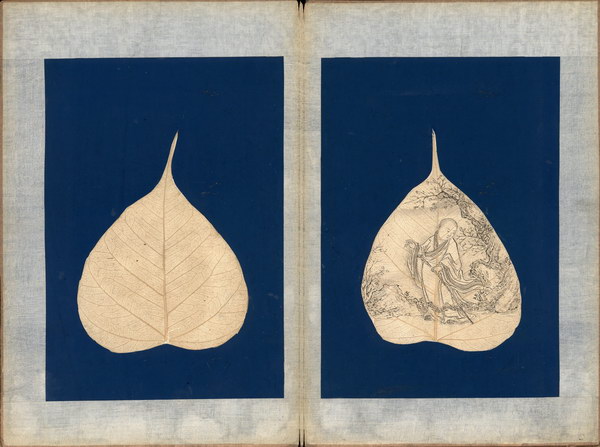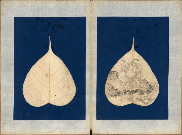 此画册以十八罗汉题材,以菩提树叶为绘制素材媒介。全冊共十九帧,前为墨绘十八罗汉,末为韦陀。每帧左墨绘一尊罗汉,右为空白叶子。