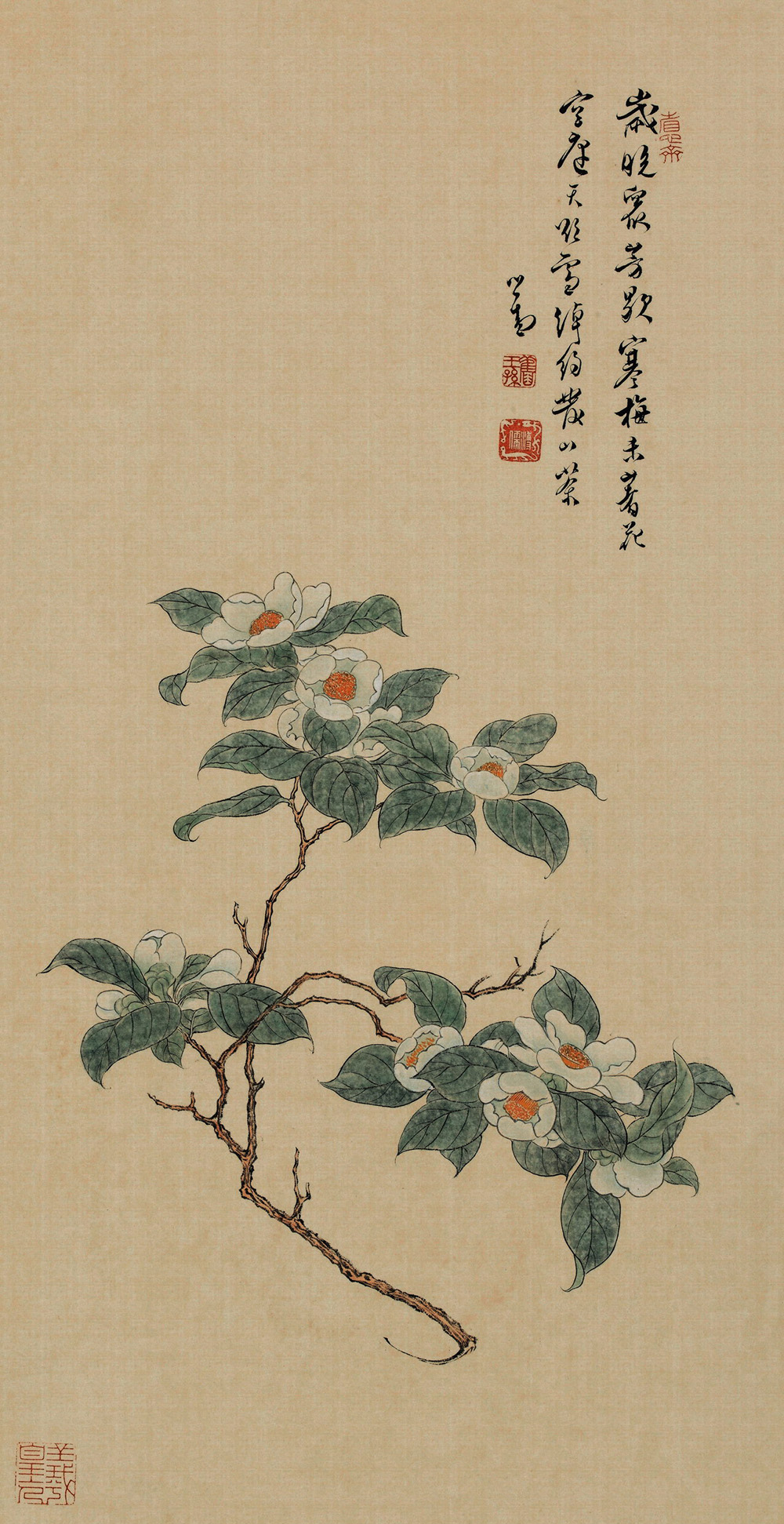 绘折枝山茶花一枝,单层花瓣以青白晕染,桔色花蕊娇艳,墨绿晕染花叶,再以细线钩勒叶脉;枝杆干枯而细劲,历经风霜傲立。画面上端题诗一首:岁晚众芳歇,寒梅未着花。空庭天欲雪,绰约发山茶。