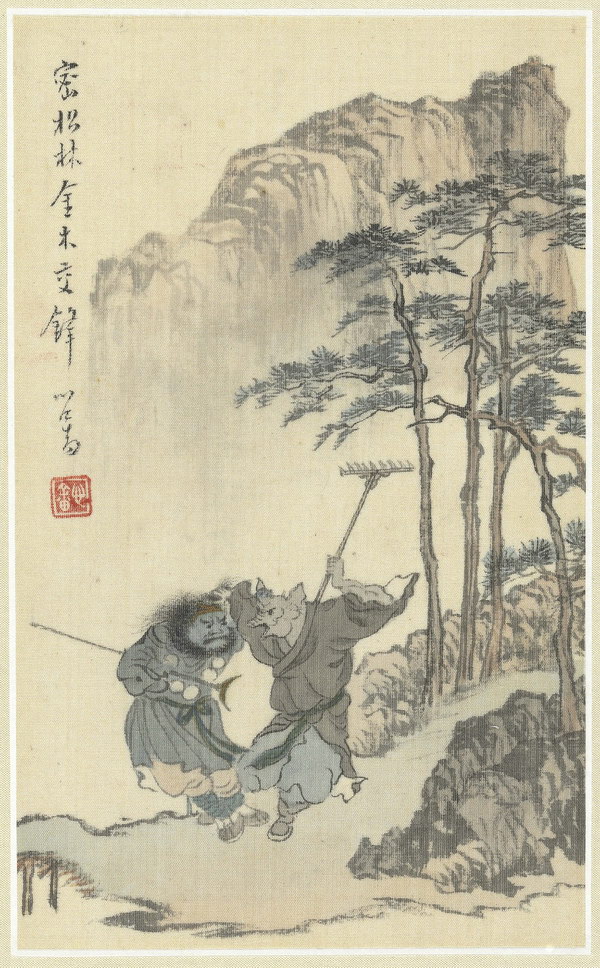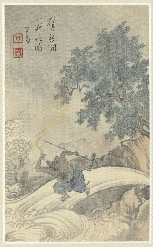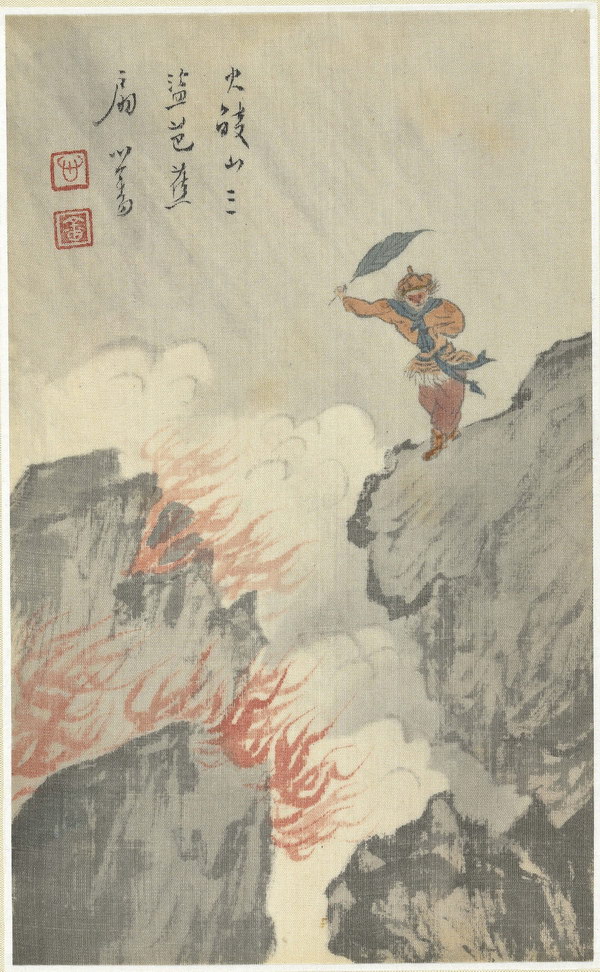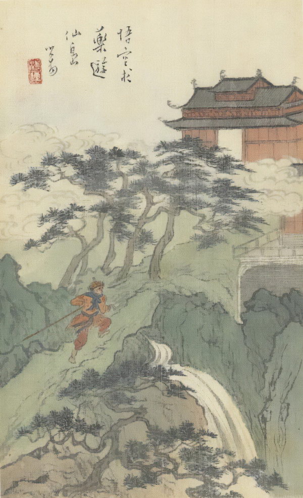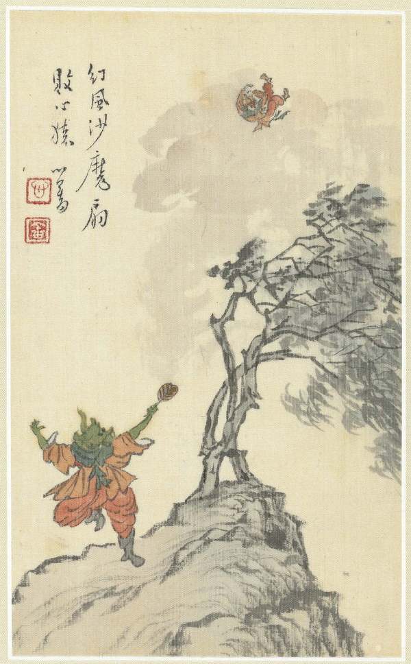 溥儒非常爱读《西游记》,曾数度绘成小品集册。本册共12幅,作于1952年,时57岁。各幅先后,并未依循吴承恩章回小说《西游记》的顺序,而是随兴所至,自由重组画家感兴趣的故事情节。由于布局简约,笔调活泼生动,虽然有些人物与京剧的角色扮相,不无契合之处,但比起通俗小说的插图绘本,另有一番高洁脱俗的文人气质。