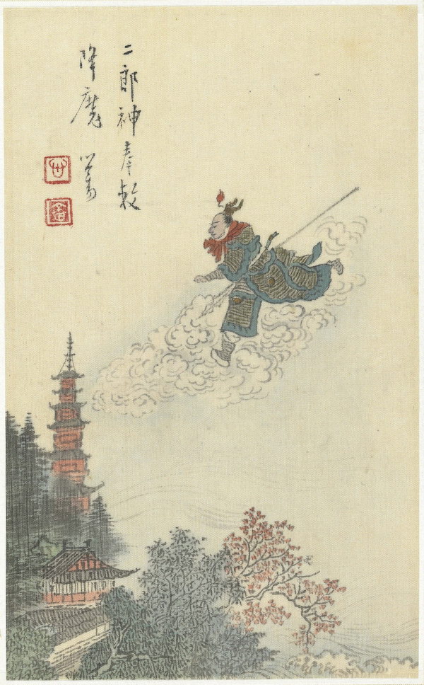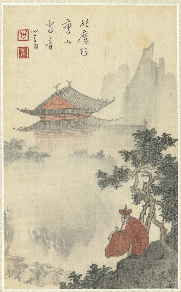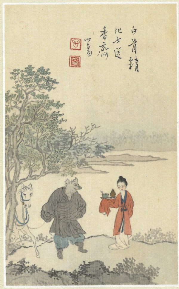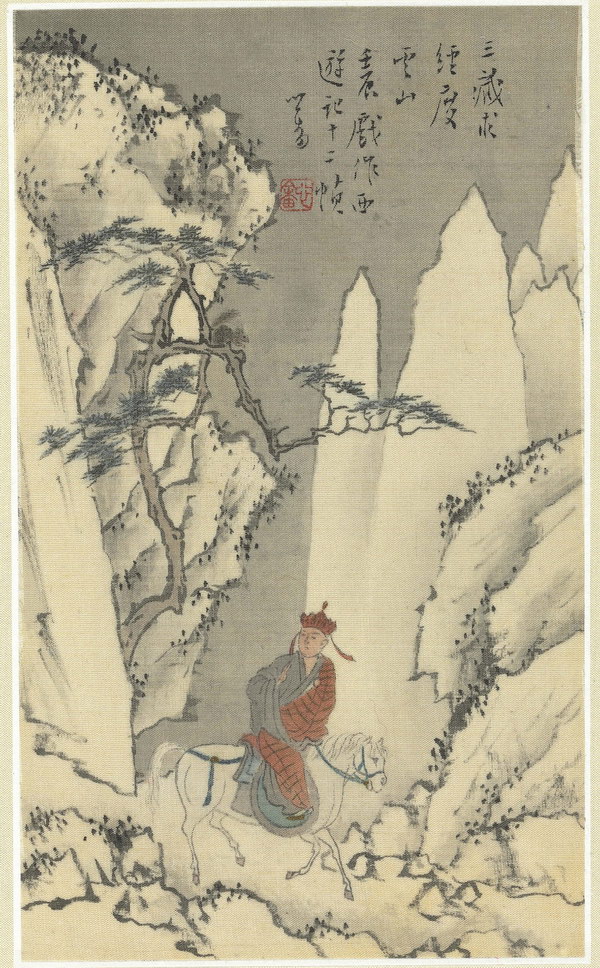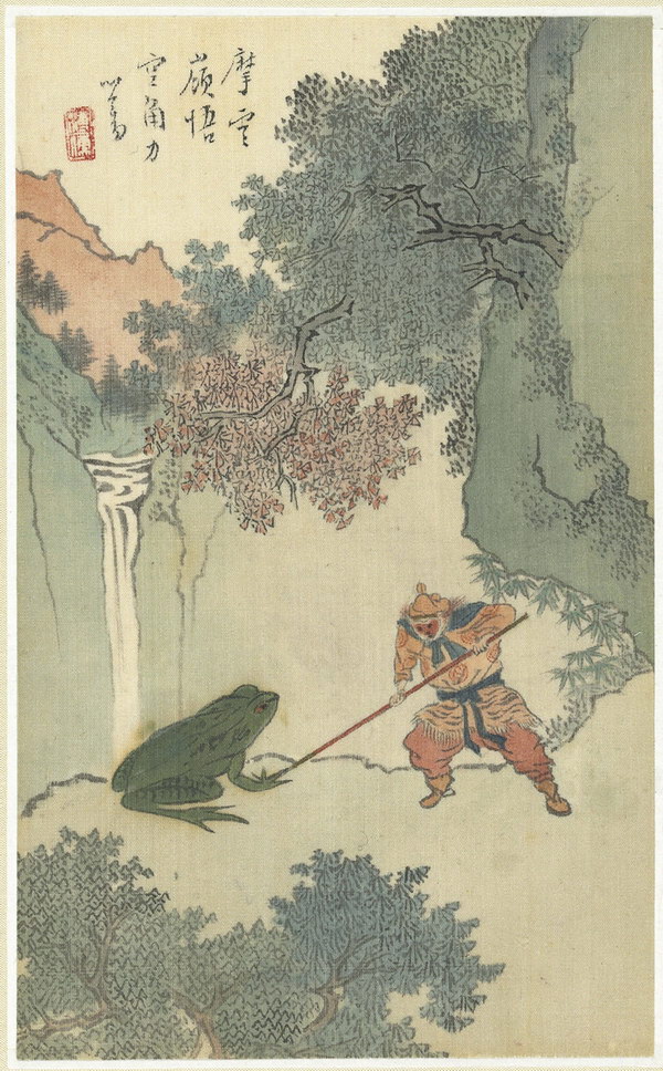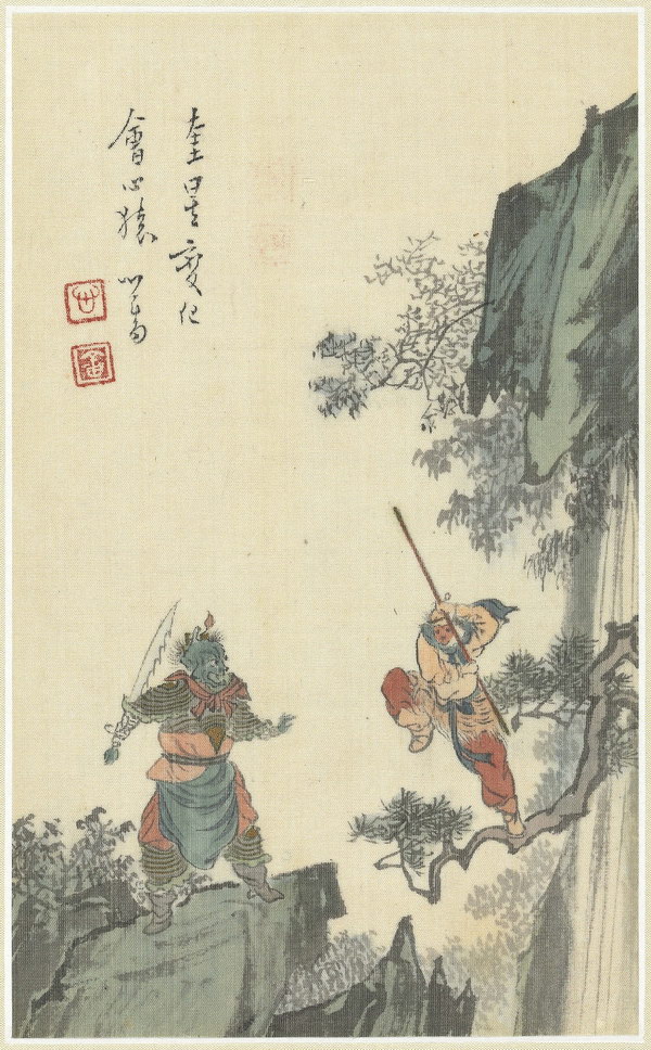 溥儒非常爱读《西游记》,曾数度绘成小品集册。本册共12幅,作于1952年,时57岁。各幅先后,并未依循吴承恩章回小说《西游记》的顺序,而是随兴所至,自由重组画家感兴趣的故事情节。由于布局简约,笔调活泼生动,虽然有些人物与京剧的角色扮相,不无契合之处,但比起通俗小说的插图绘本,另有一番高洁脱俗的文人气质。