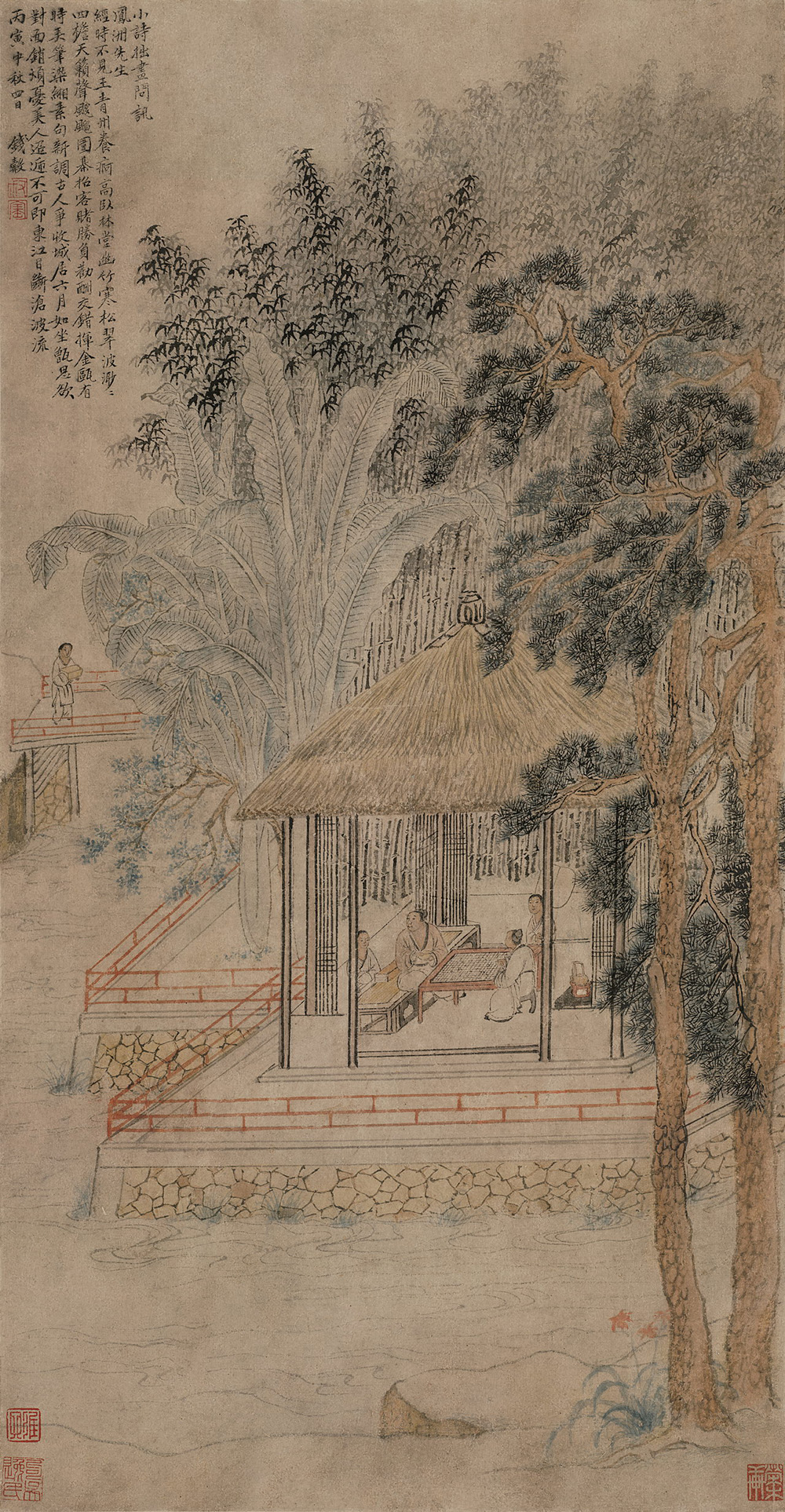 款识:小诗拙画问讯凤洲先生。经时不见王青州,养疴高卧林堂幽。竹寒松翠波渺渺,四檐天籁声飕飕。围棋招客赌胜负,劝酬交错挥金瓯。有时弄笔染缃素,句新调古人争收。城居六月如坐甑,思欲对面销烦忧。美人迢递不可即,东江目断沧波流。丙寅中秋四日,钱。