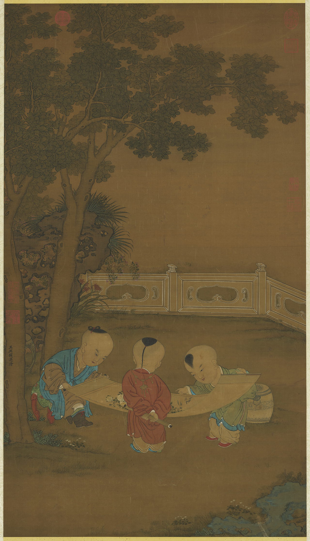 本幅描绘庭院一角,有两株梧桐傍石而生,桐荫下,三名童子聚精会神的观赏著画。轴中画的花禽,分别是香椽与喜鹊,与三 “元” 送 “喜” 谐音。三元指状元、会元、解元,故本图有科考高中之吉祥寓意。