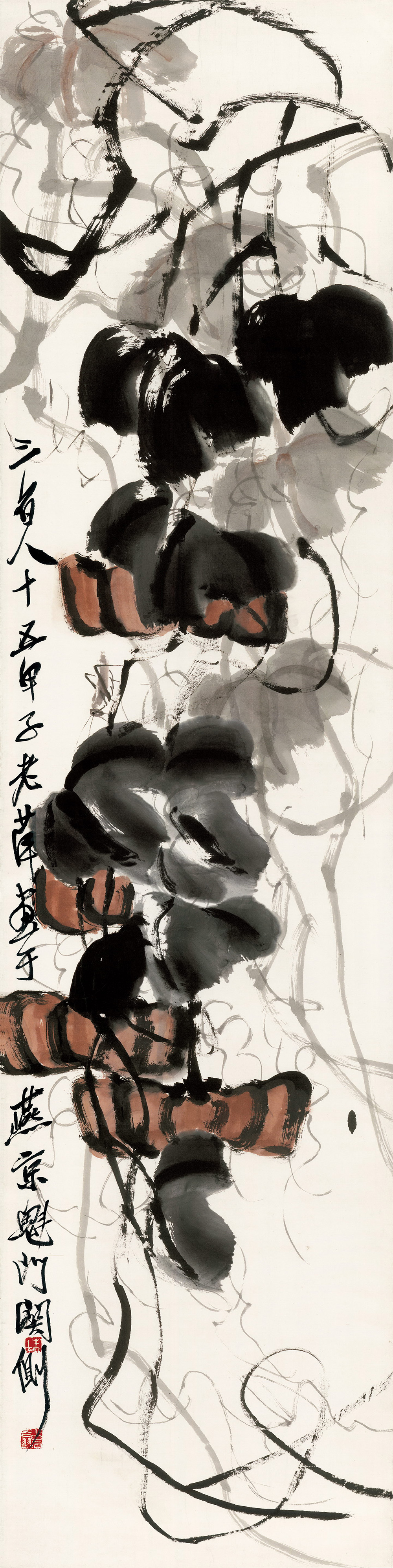 《金瓜图》中的“金瓜”即南瓜,是齐白石钟爱的绘画对象之一。南瓜在中国文化中象征着丰收与富足,齐白石通过这一形象表达了对生活的热爱与向往。同时,南瓜形态圆润饱满,线条简洁明快,非常适合用来表现齐白石追求的“简约而不简单”的艺术理念。