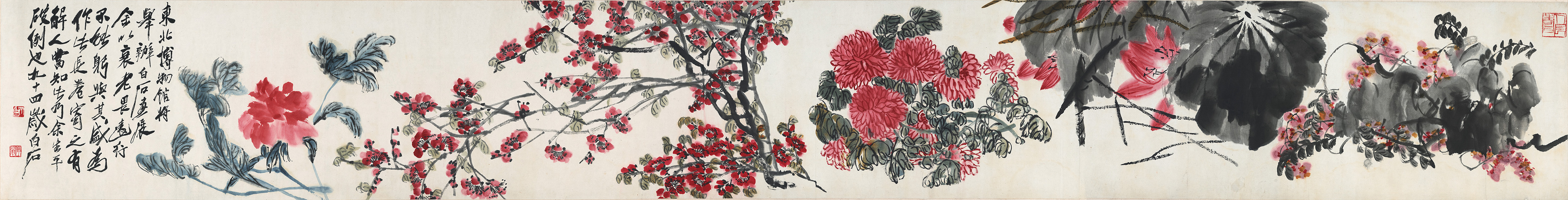 款识:东北博物馆将举办白石画展,余以衰老畏远,不能躬与其盛,为作此长卷寄之。有解人当知,此乃余生平破例也。 94岁白石。