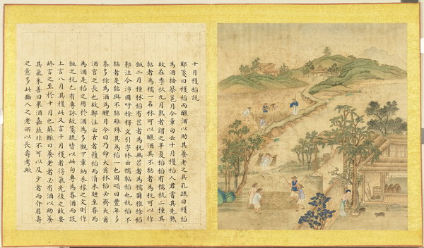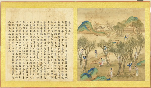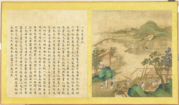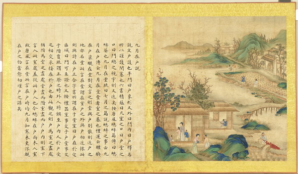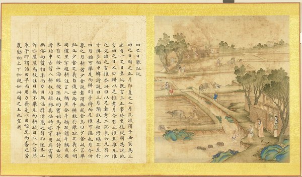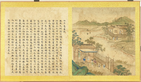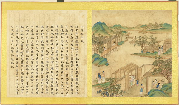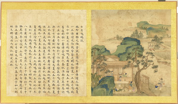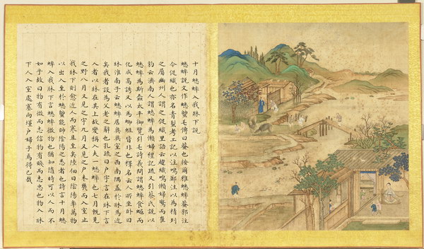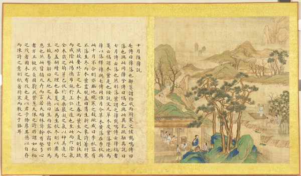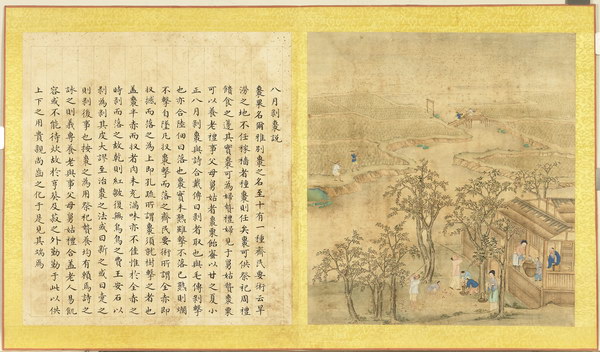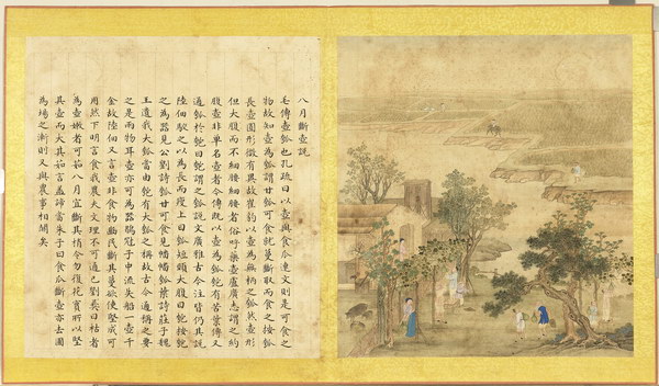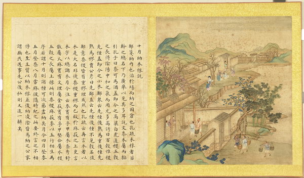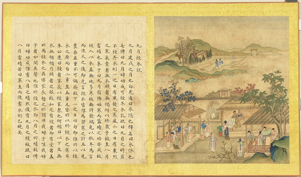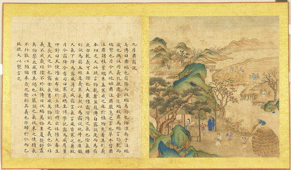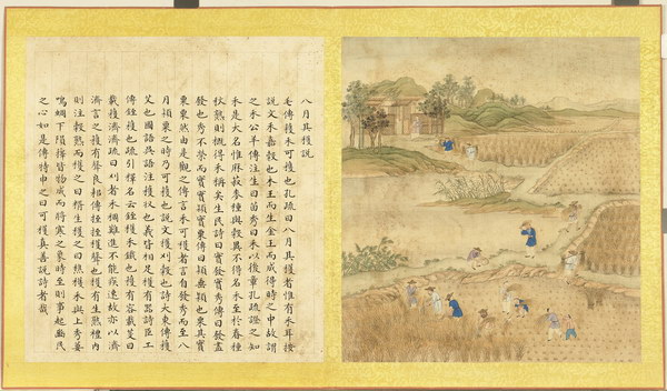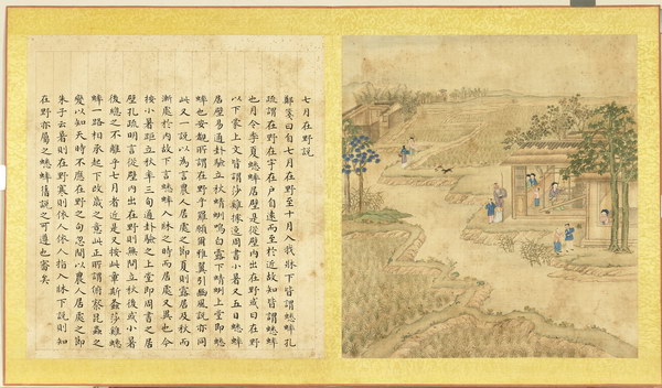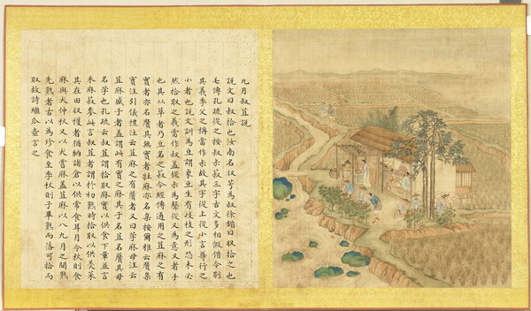 描绘《诗经·国风》中《豳风·七月》中所记叙周代时一年四时的农事劳作,如打猎、凿冰、修理农具、耕种、祭祀、采桑、纺织、获稻、打枣、授衣、修理室宇、筑场圃、纳粮等。画册共三十六幅,按月分图,每图配以张师诚图说。