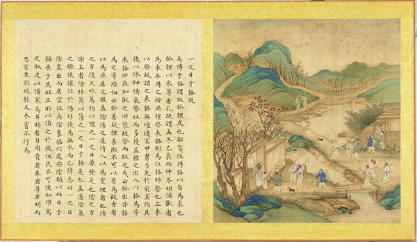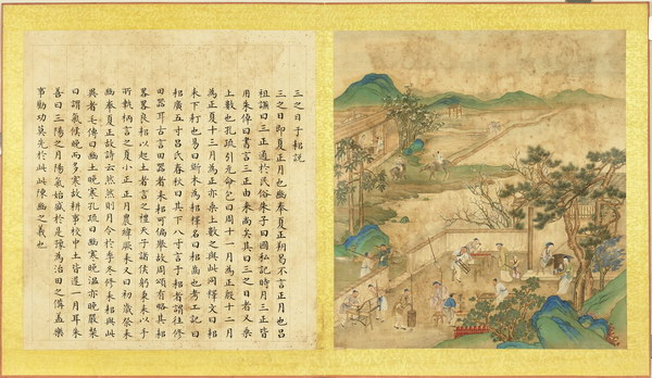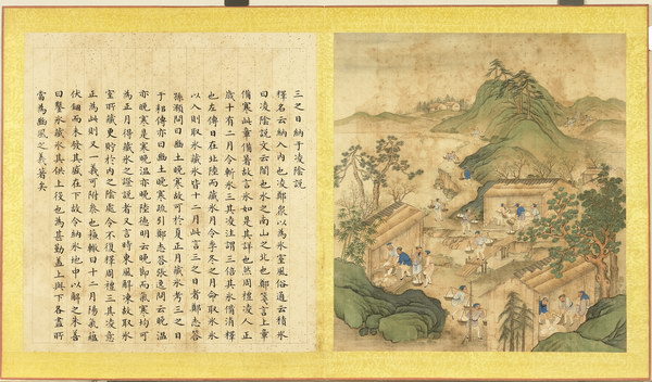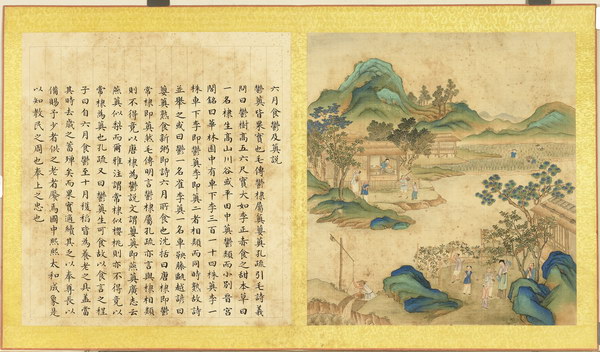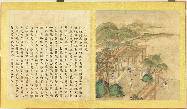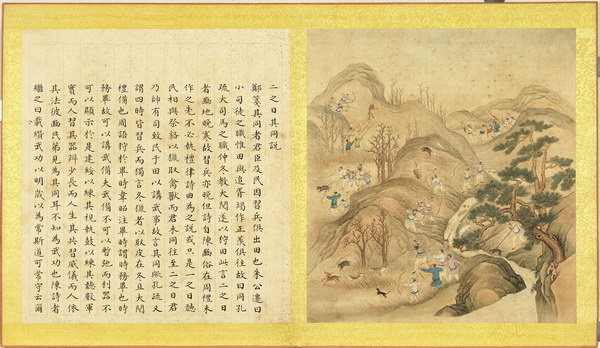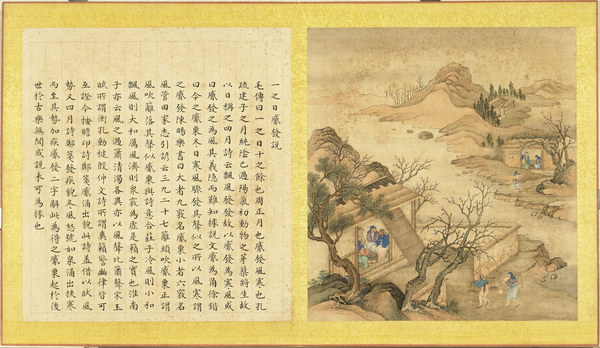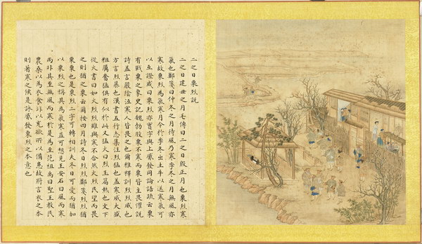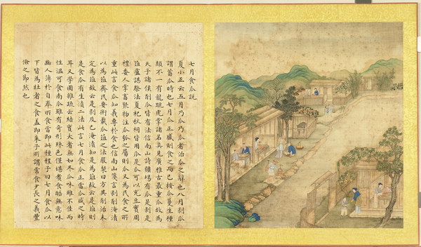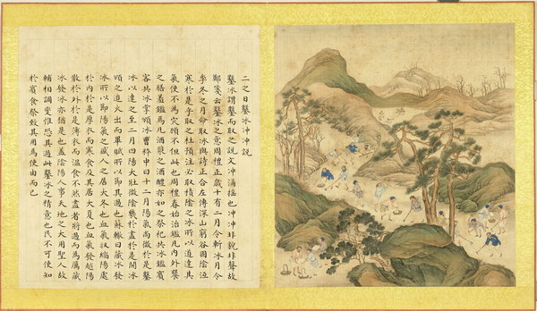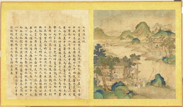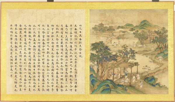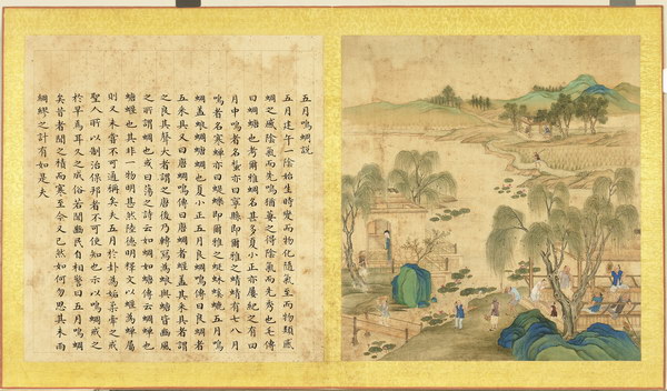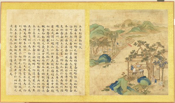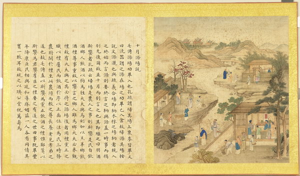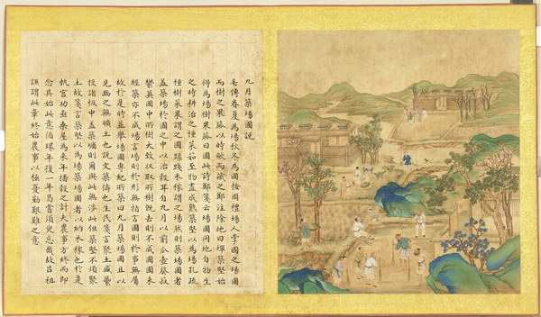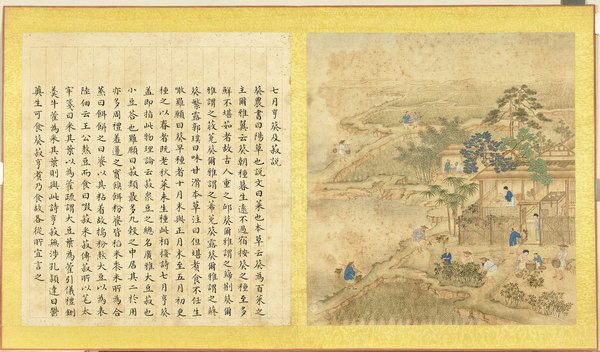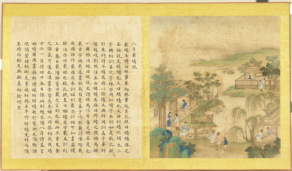 描绘《诗经·国风》中《豳风·七月》中所记叙周代时一年四时的农事劳作,如打猎、凿冰、修理农具、耕种、祭祀、采桑、纺织、获稻、打枣、授衣、修理室宇、筑场圃、纳粮等。画册共三十六幅,按月分图,每图配以张师诚图说。