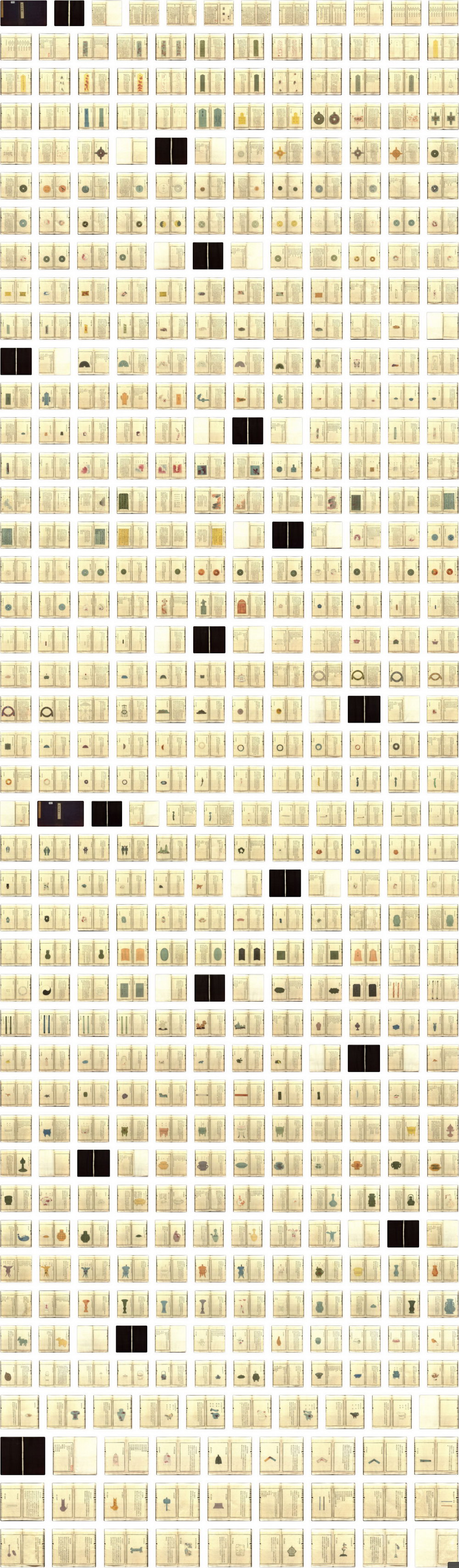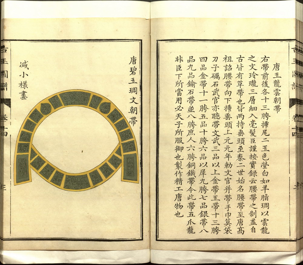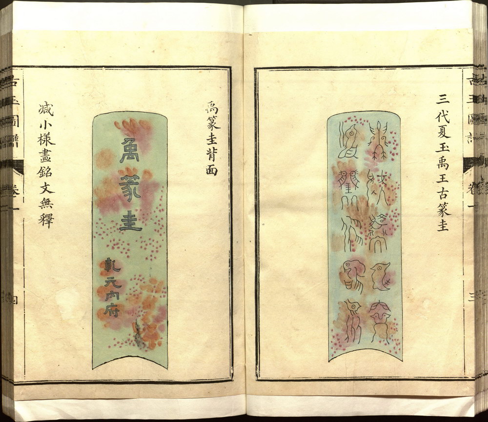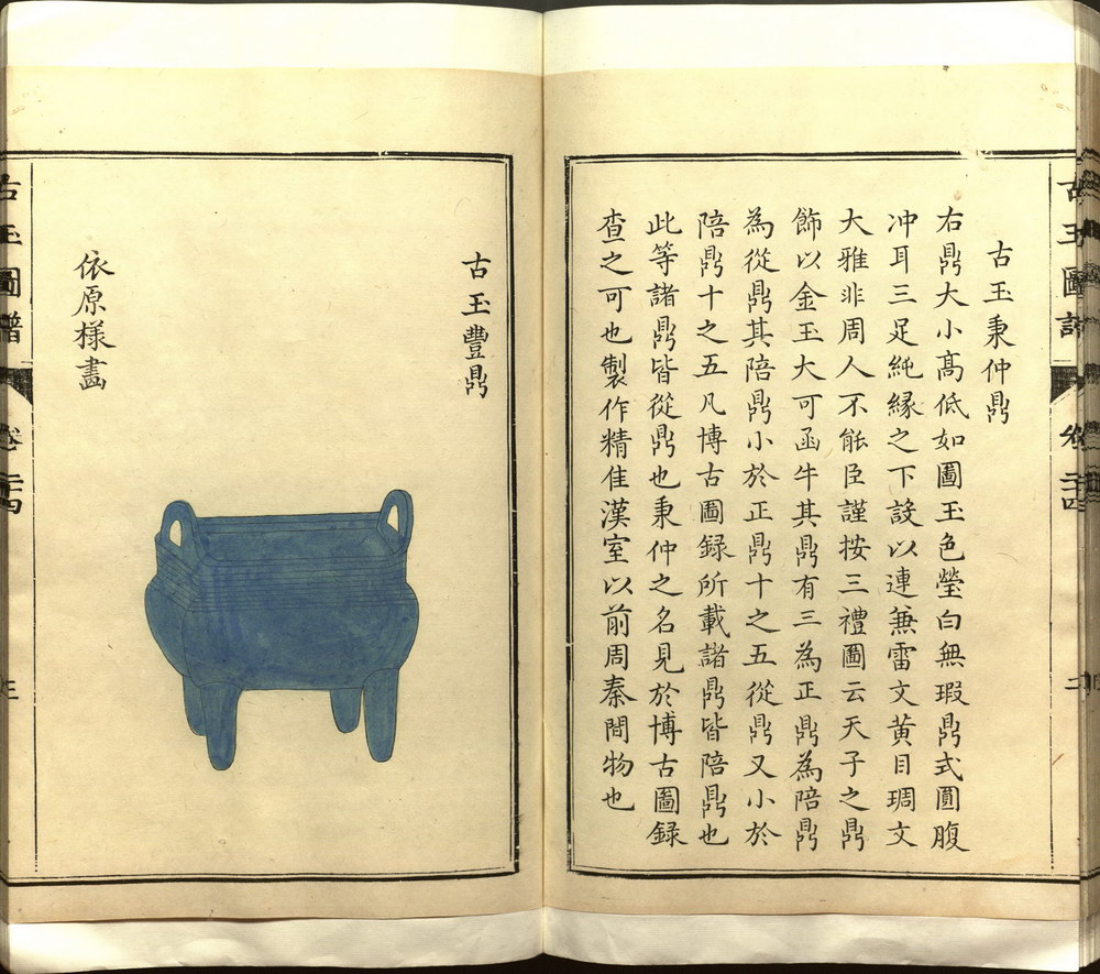 《古玉图谱》旧题宋代龙大渊等奉敕撰,全书共三十二卷,分为国宝部、压胜部、服御部、文房部、鼎彝部、彛器部、乐器部,记载了南宋高宗时期皇宫中所藏玉器,每器附图一或二,附文一篇,叙其尺寸、形制、纹饰及器用等。