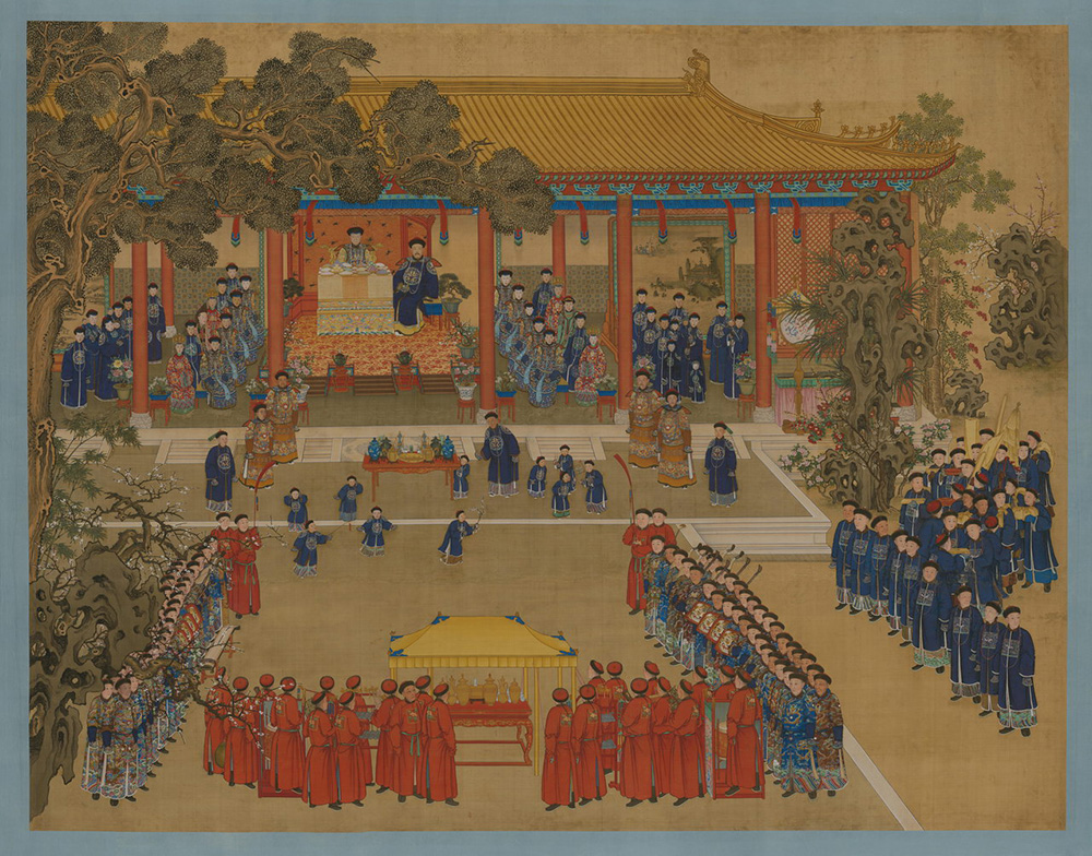 该画描绘了乾隆为母亲崇庆皇太后祝寿的场景,人物众多,色彩丰富,使用了多种矿物颜料。