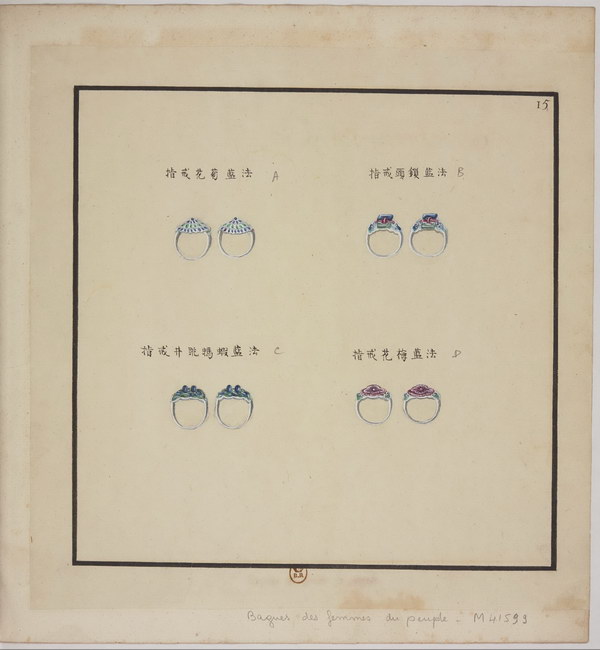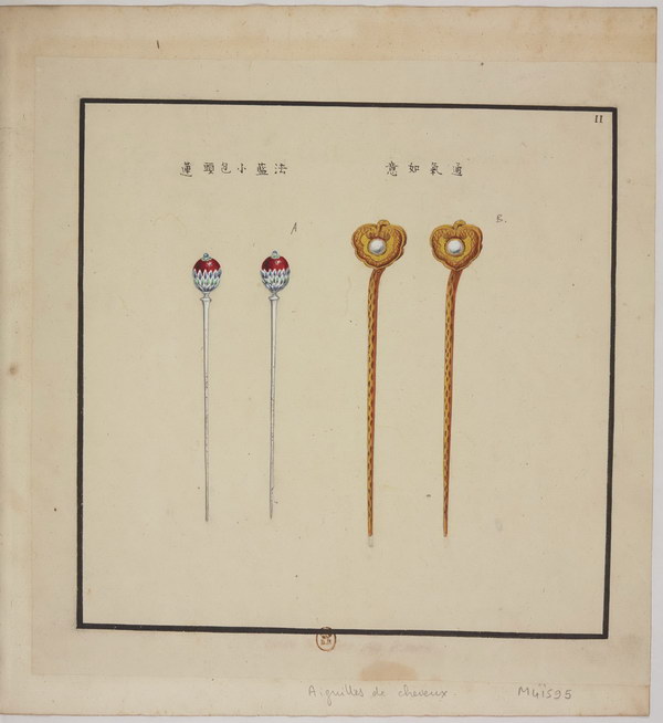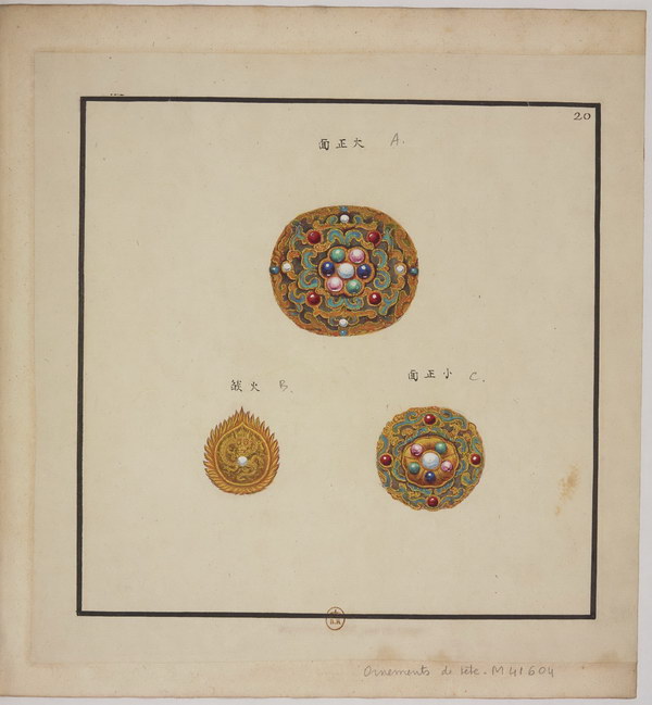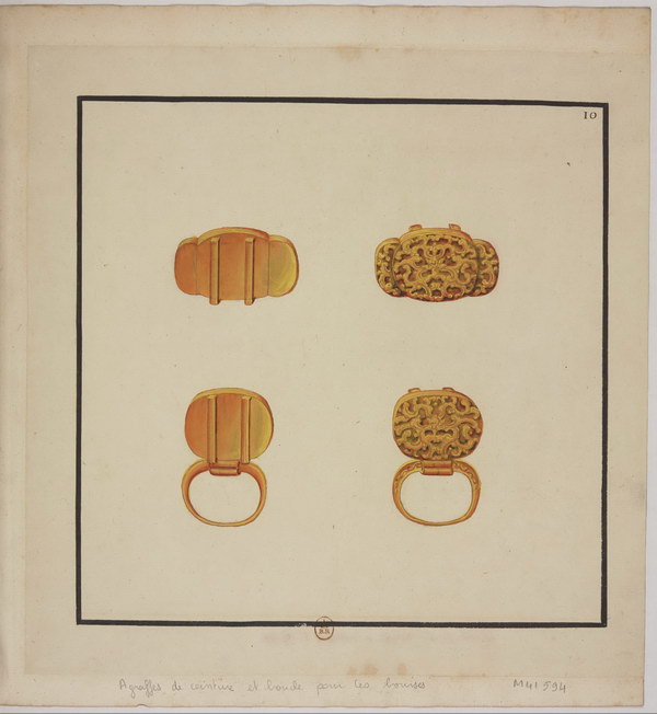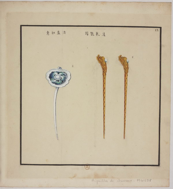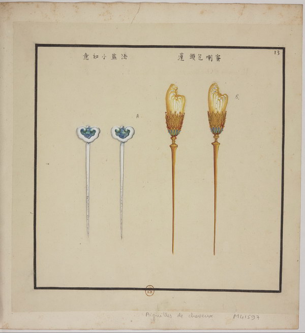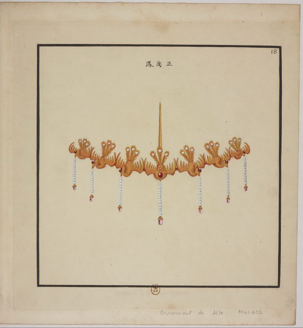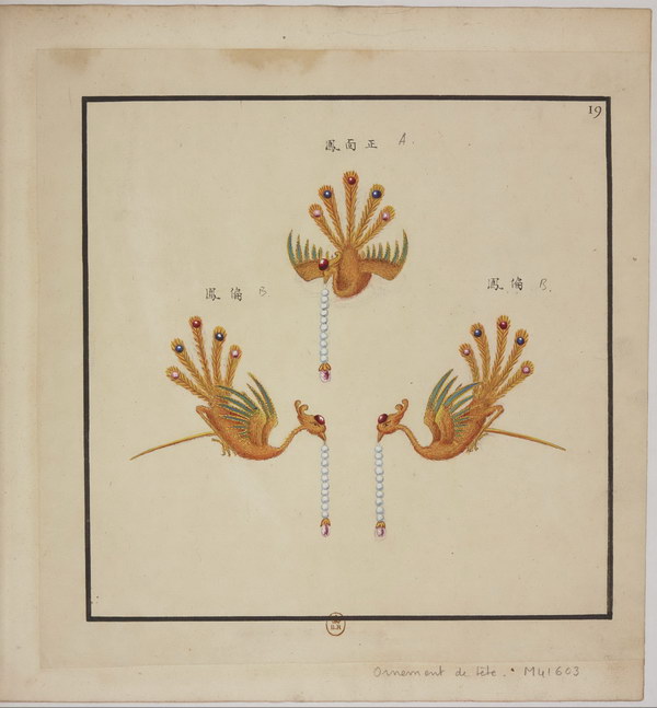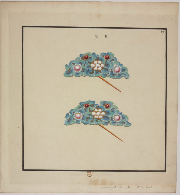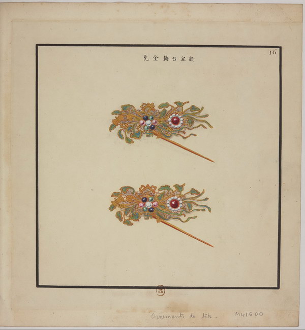 此画册包含19幅,约59件彩绘佩饰与头饰:扣带钉饰,钗、坠子、戒指等。Recueil d’agraffes et de différents ornements de tête des dames chinoises