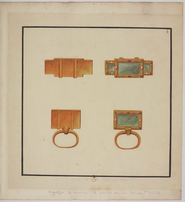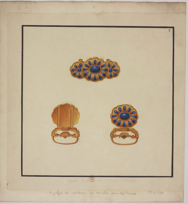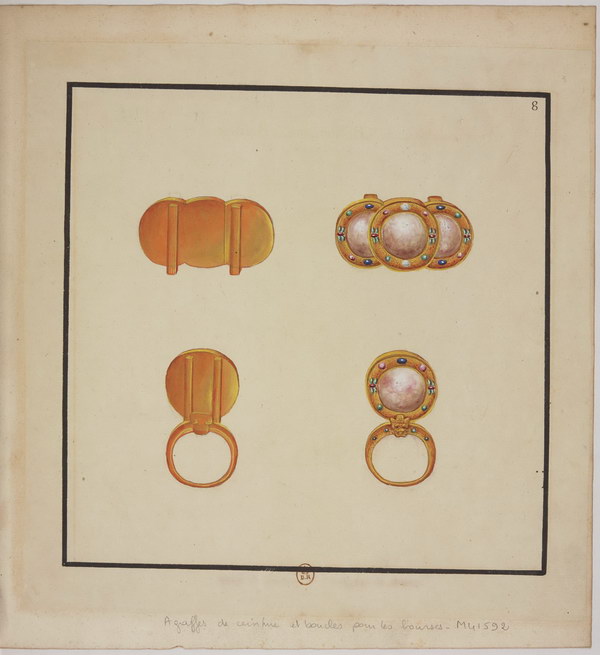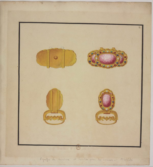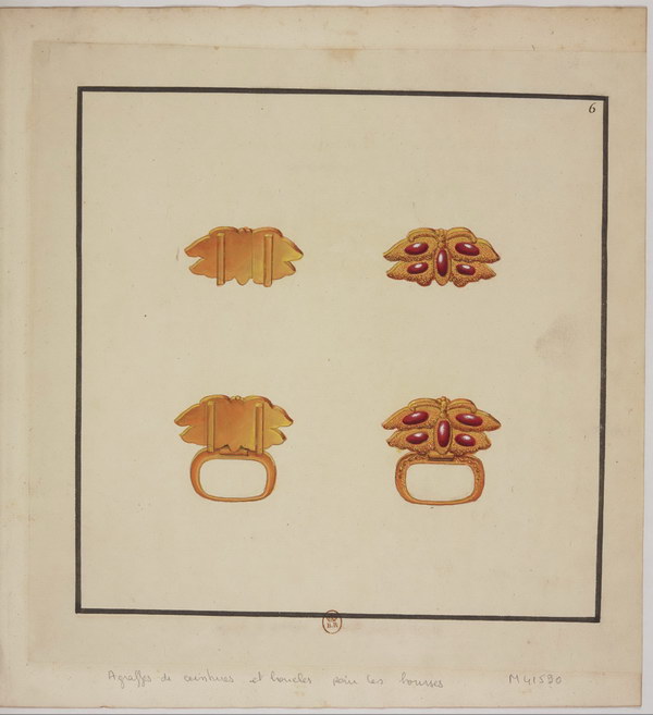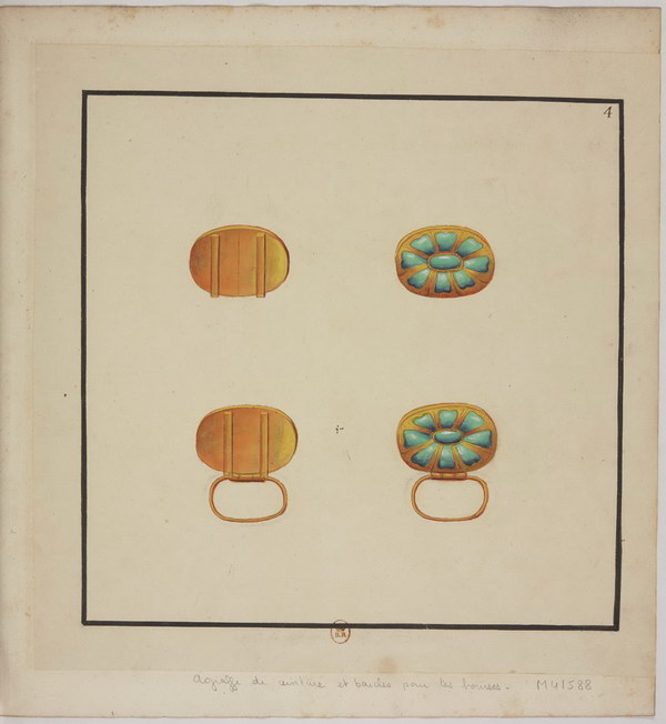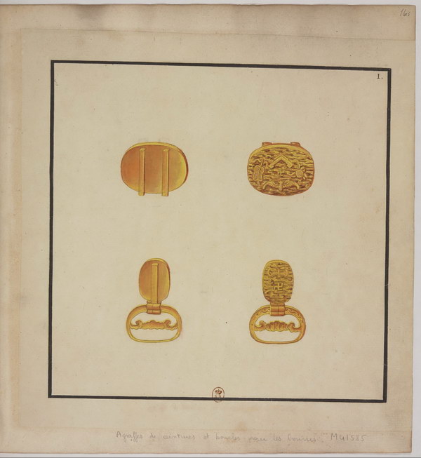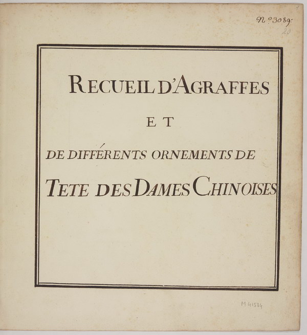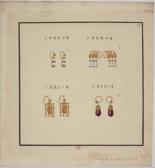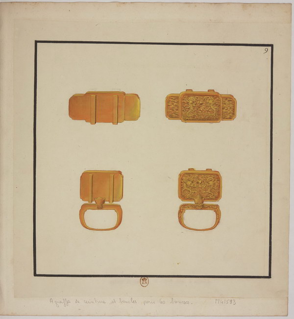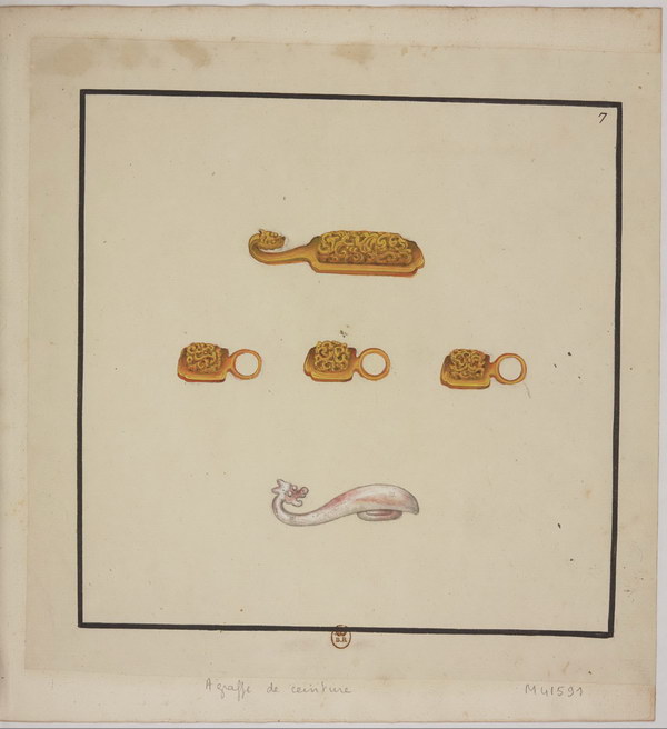 此画册包含19幅,约59件彩绘佩饰与头饰:扣带钉饰,钗、坠子、戒指等。Recueil d’agraffes et de différents ornements de tête des dames chinoises