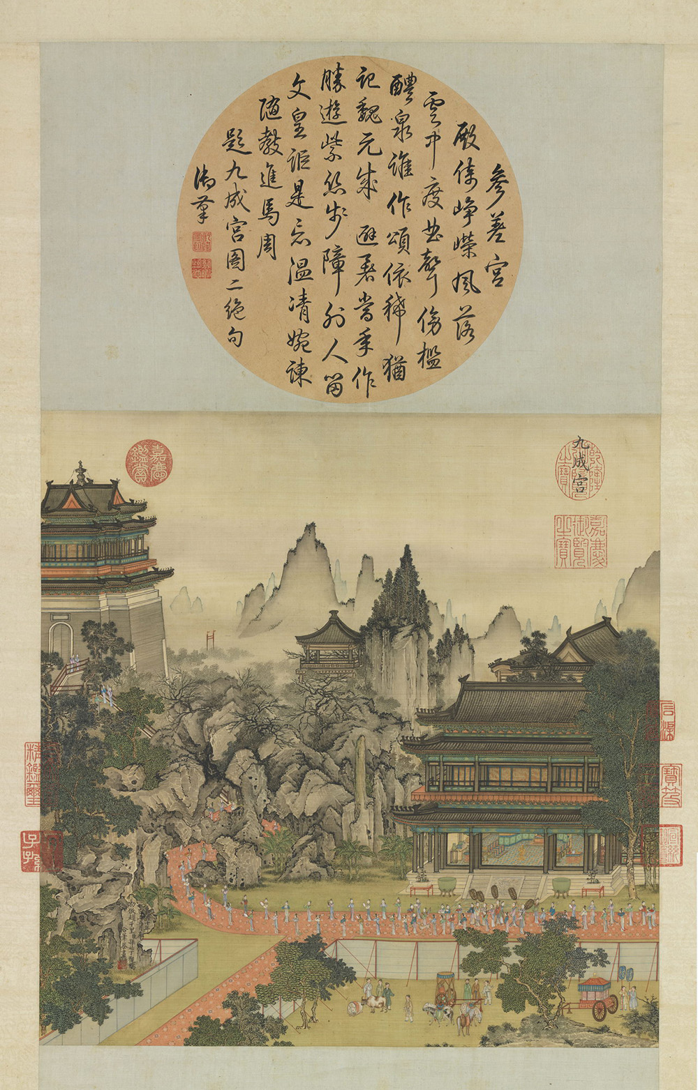 鉴赏跋:诗塘:参差宫殿倚峥嵘。风落云中度曲声。傍槛醴泉谁作颂。依稀犹记魏元成。避暑当年作胜游。紫丝歩障外人留。文皇讵是忘温凊。婉谏随教进马周。题九成宫图二绝句。御笔。(印记:乾隆宸翰、几暇临池)