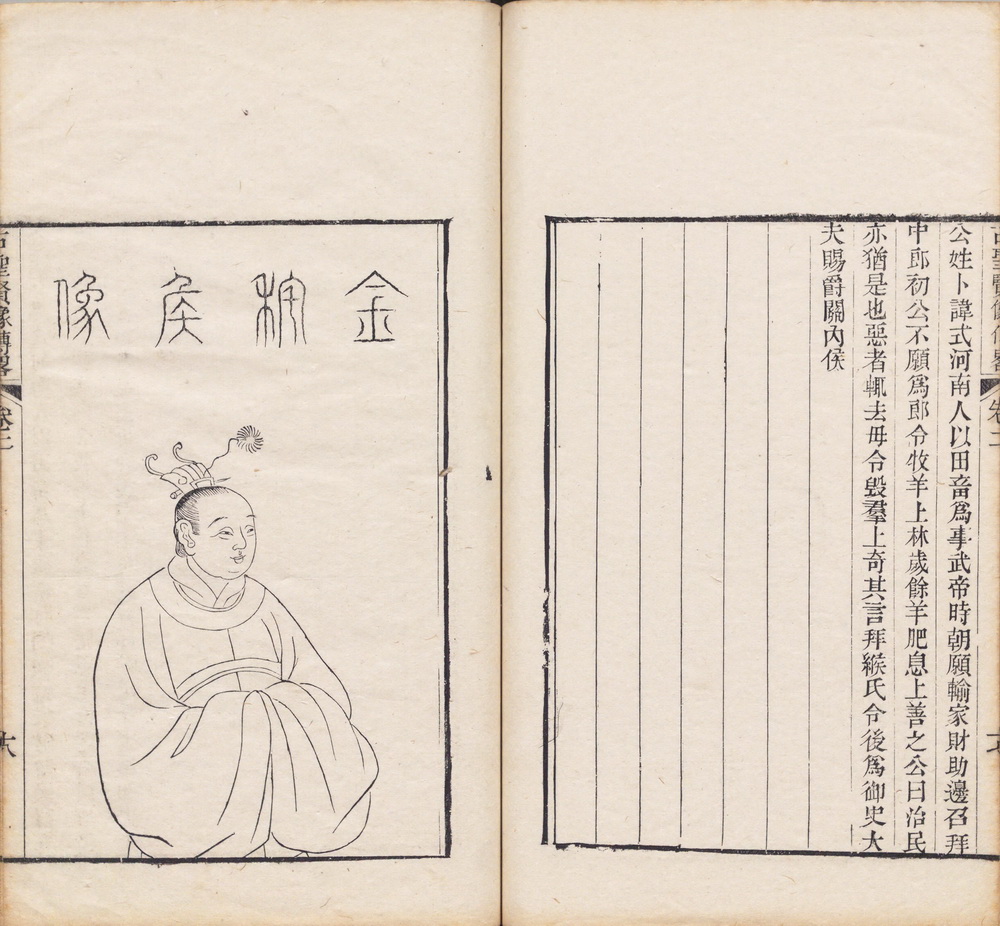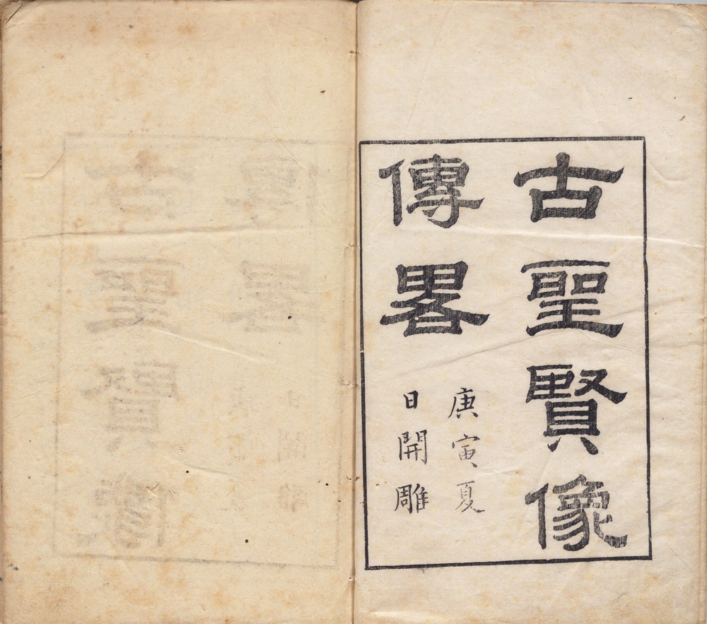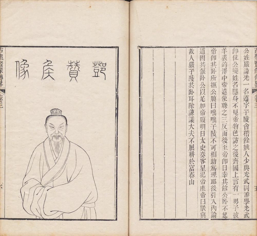 《古圣贤像传略》由清代顾沅辑录,孔莲卿绘像。全书共十六卷,收录自上古仓颉、后稷至明代陈子龙、冒襄约四百多幅人物画像,每人一图一传,摹绘精细。图均为半身像,图正上方为小篆书人物称号,次页为人物小传。卷一:上古三代,卷二+卷三:汉,卷四:汉、三国,卷五:晋、南北朝、隋,卷六、卷七:唐,卷八:唐、五代,卷九至卷十一:宋,卷十二:金、元,卷十三至卷十六:明
