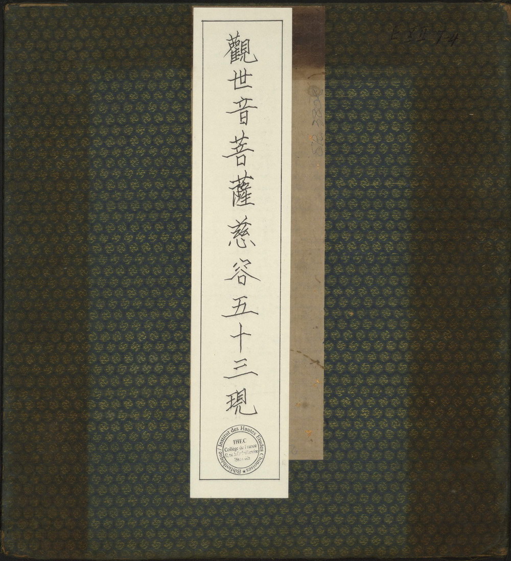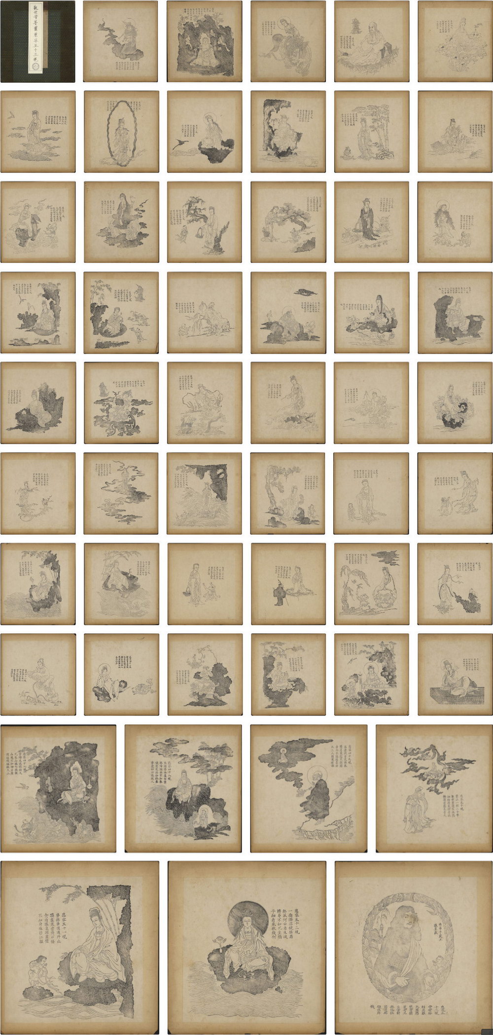《观世音菩萨慈容五十三现》画册绘者未知。其中描绘了普陀梵音洞大士示相五十三种(多为女相,并融入善财童子),前附护法韦陀一幅,每幅附赞诗。