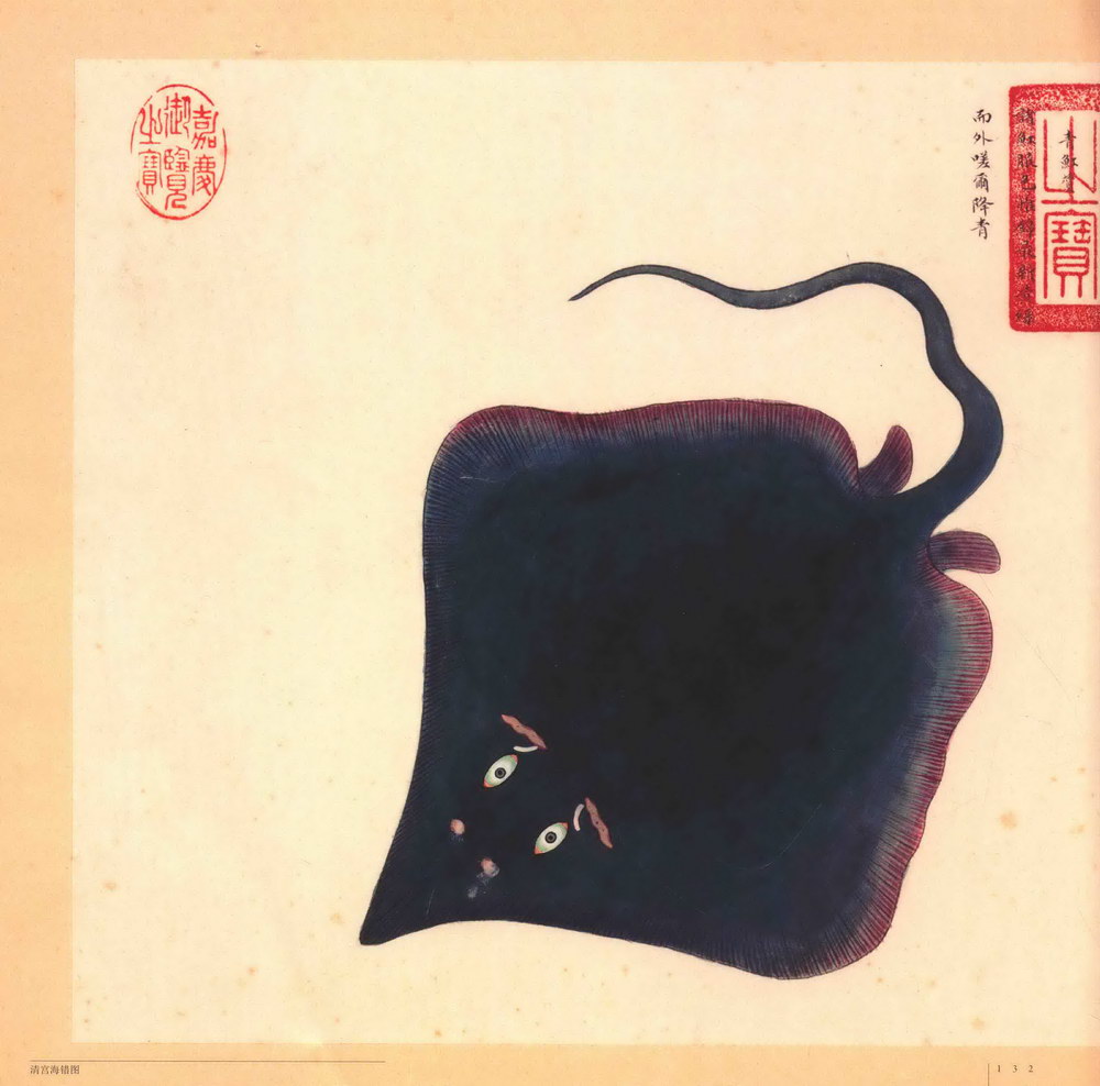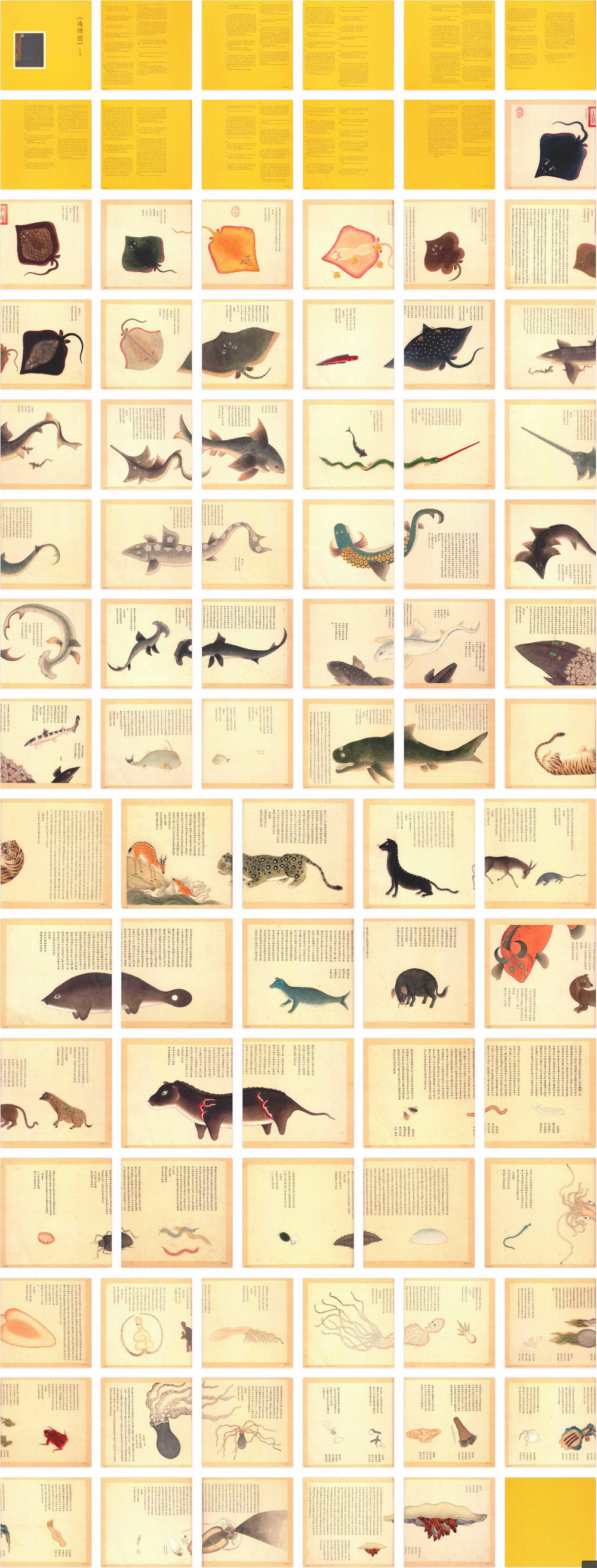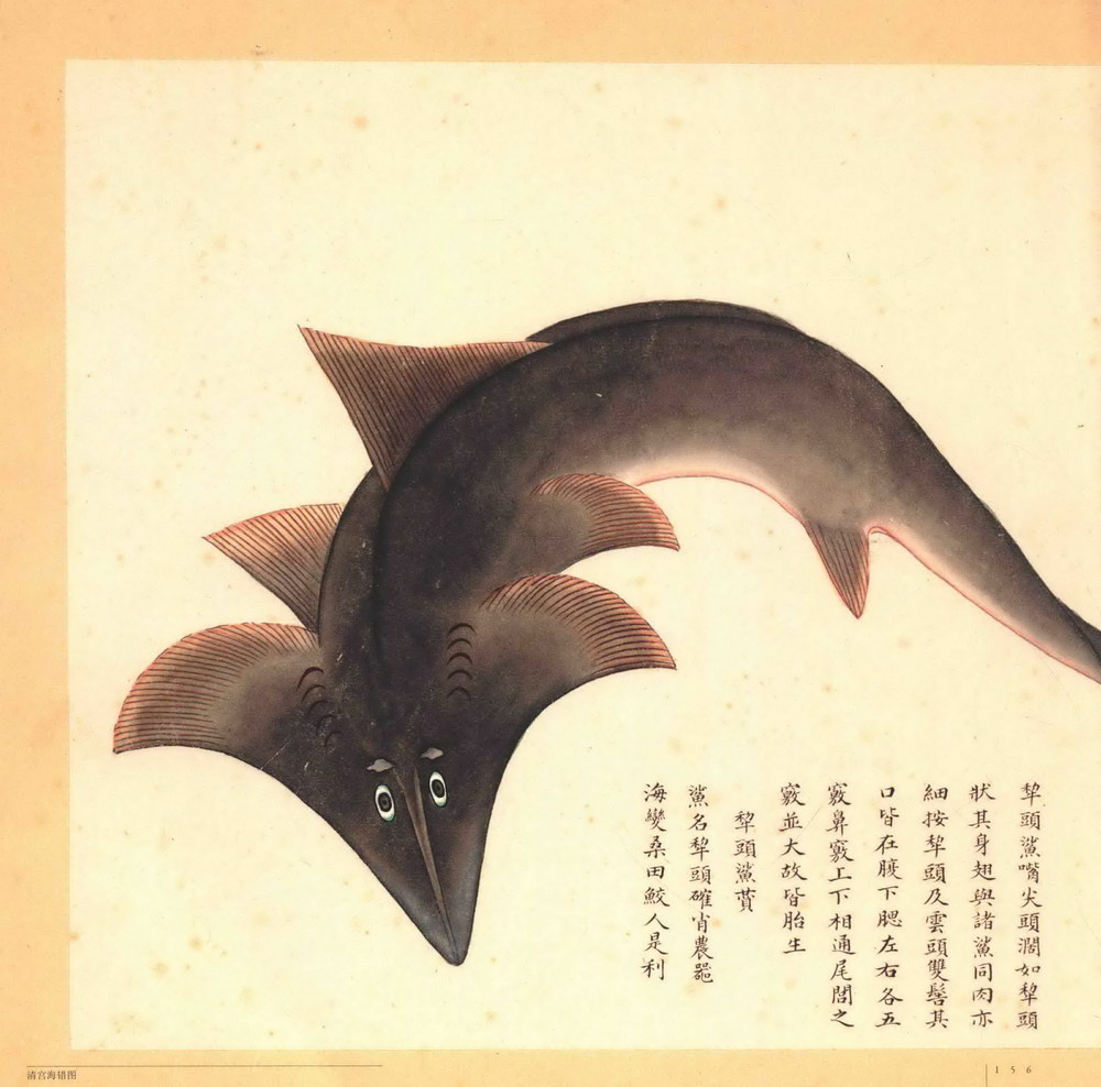 第第二册:共三十七开,主要描绘鲨鱼类,如:青头鲨、剑鲨、锯鲨、梅花鲨、潜龙鲨、黄昏鲨、犁头鲨、白鲨、猫鲨、鼠鲨、虎鲨等,其他还有海豹、海驴、海獭、海马、海蚕、海蜈蚣、海蜘蛛等。《海错图》由清代画家兼生物爱好者聂璜绘制。全套共四册共描述了三百多种生物,还记载了不少海滨植物,算是一本古代的海洋生物图鉴。所绘每一种物种的空隙处,辅以文字说明介绍所绘物象的名称由来,以及产地、物性特征等,再配以小赞一首。