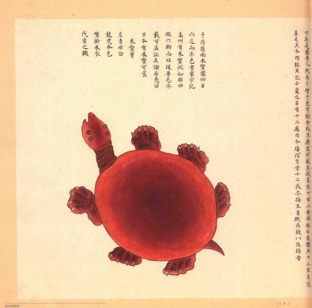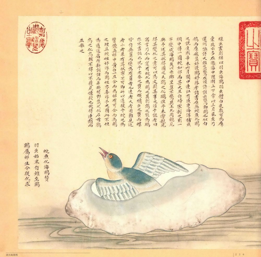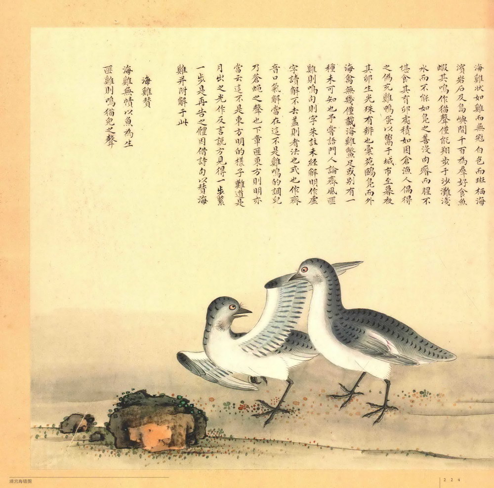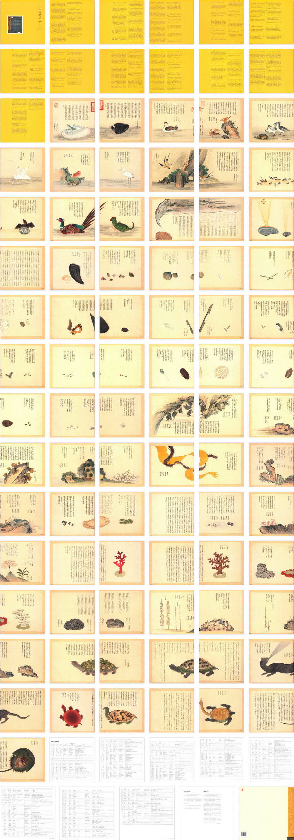 第三册:共三十九开,主要描绘海鹅、海鸡、海鹄、火鸠、燕窝、金丝燕、海市蜃楼、珠蚌、马蹄蛏、剑蛏、巨蚶、紫菜、吸毒石、海盐、珊瑚树、石珊瑚、三尾八足神龟等。《海错图》由清代画家兼生物爱好者聂璜绘制。全套共四册共描述了三百多种生物,还记载了不少海滨植物,算是一本古代的海洋生物图鉴。所绘每一种物种的空隙处,辅以文字说明介绍所绘物象的名称由来,以及产地、物性特征等,再配以小赞一首。