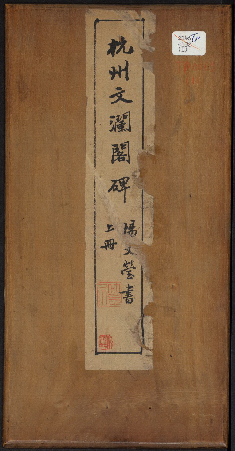 杭州文澜阁主楼的东侧建有一小碑亭,四方攒尖顶,面积只有6.25平米。亭内石碑正面刻有光绪帝亲题“文澜阁”三个字。碑背面刻有1879年秋谭钟麟调任浙江巡抚加兵部尚书衔时,奏请的匾额。此碑文由乾隆撰,谭钟麟正书。