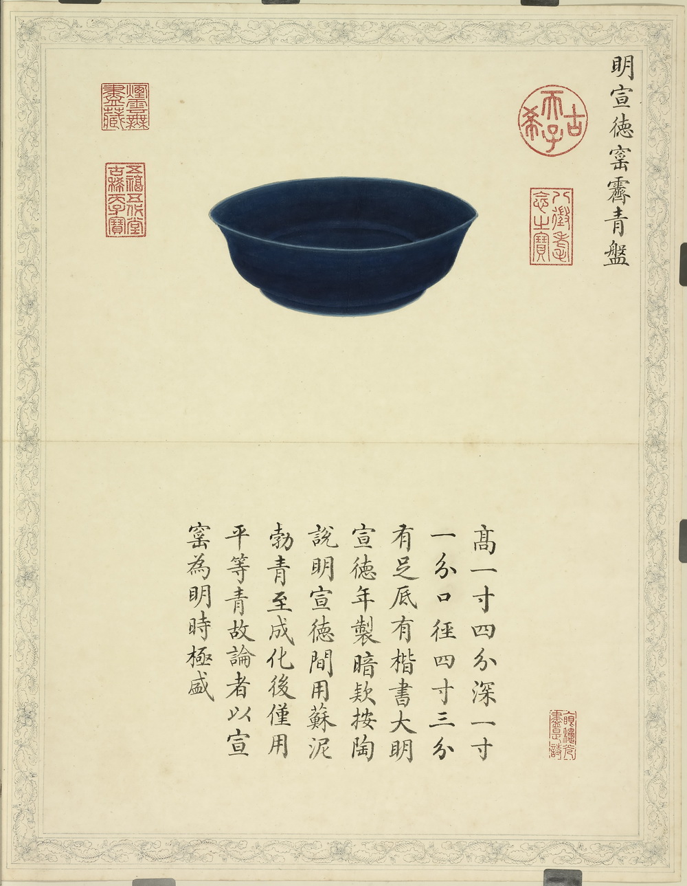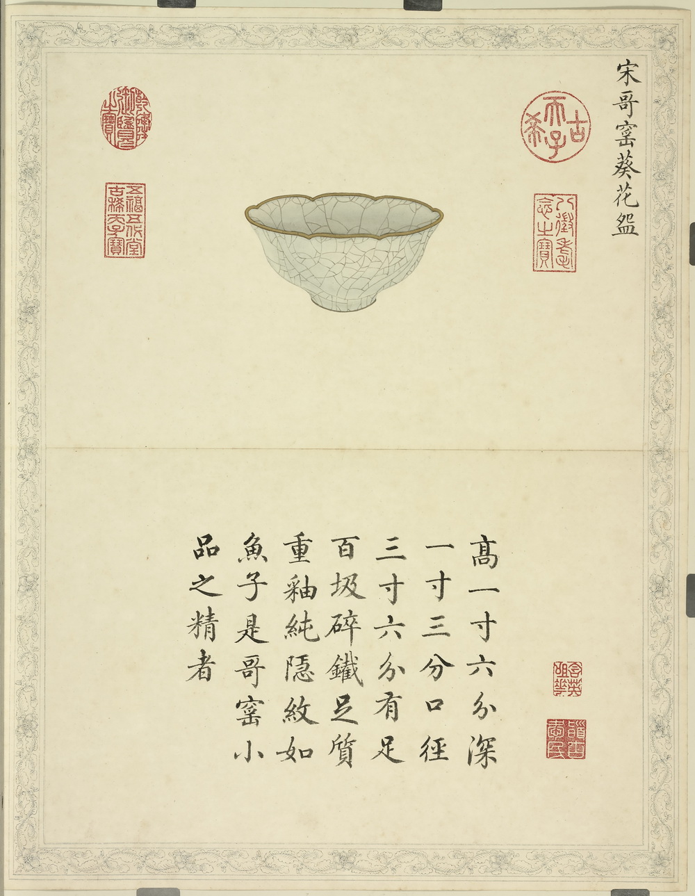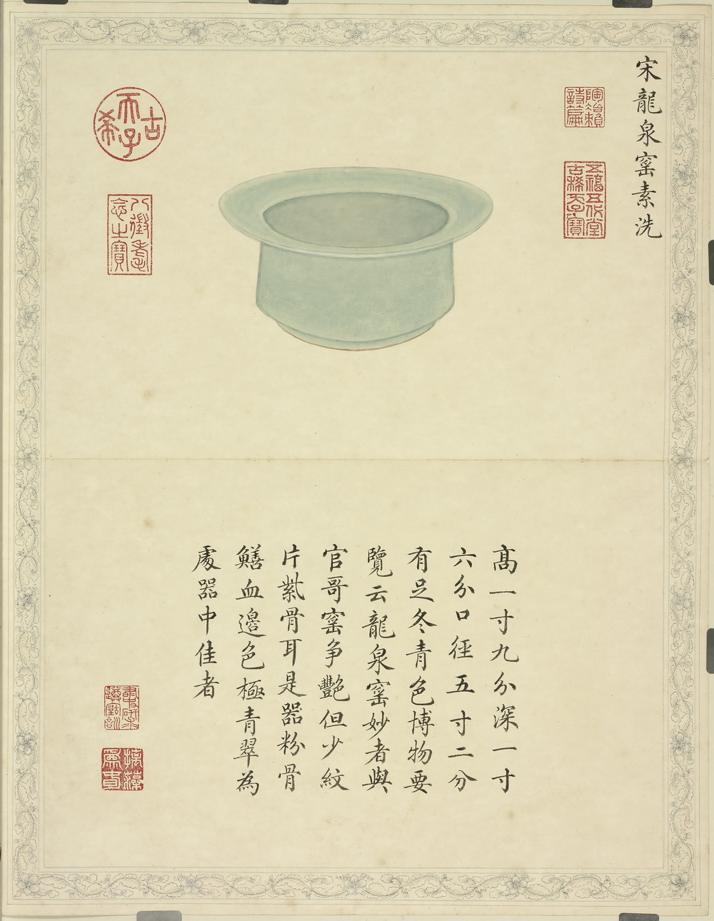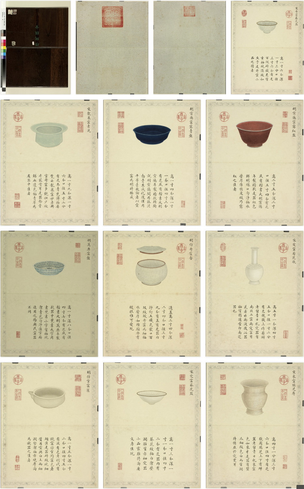 由大清康熙皇帝亲自考定文物,降旨绘制的陶瓷图册。宋哥窯葵花盌、宋龍泉窯素洗、明宣德窯霽青盤、明宣德窯霽紅盌、明萬曆窯盤、明仿哥窯奩、宋定窯菊花瓶、明仿官窯匜、宋定窯葵花盌、宋象窯瑞芝尊