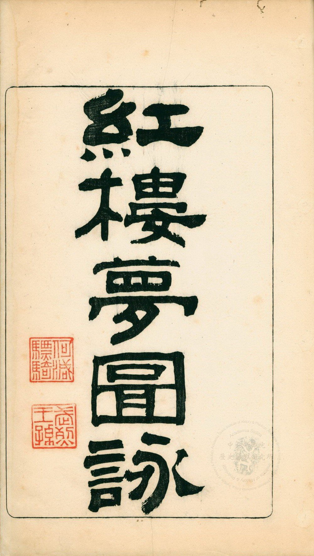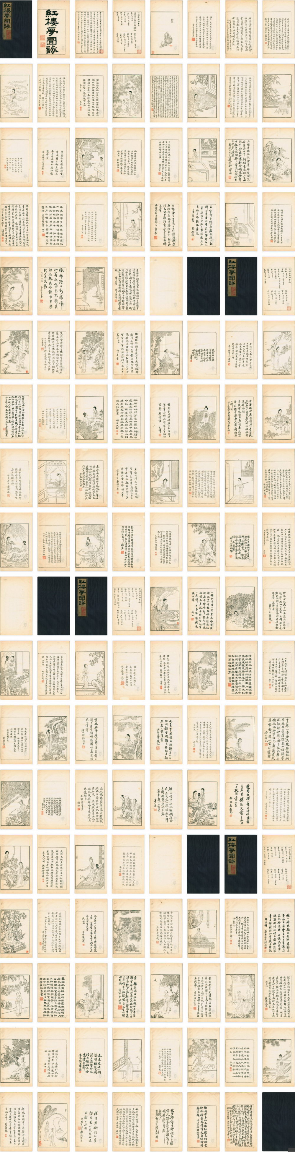 此内共绘刻五十幅图,每一幅图画之后都附有题词,各一至三篇不等,题词者三十四人,题咏七十五篇。绘制人物五十五人,第一幅 “通灵宝石绛珠仙草”,绘石头一颗及仙草一株,是书中唯一没有人物画像之图版,但以此隐喻红楼梦的二位主角贾宝玉与林黛玉的出现,以开红楼绮情故事之端起。