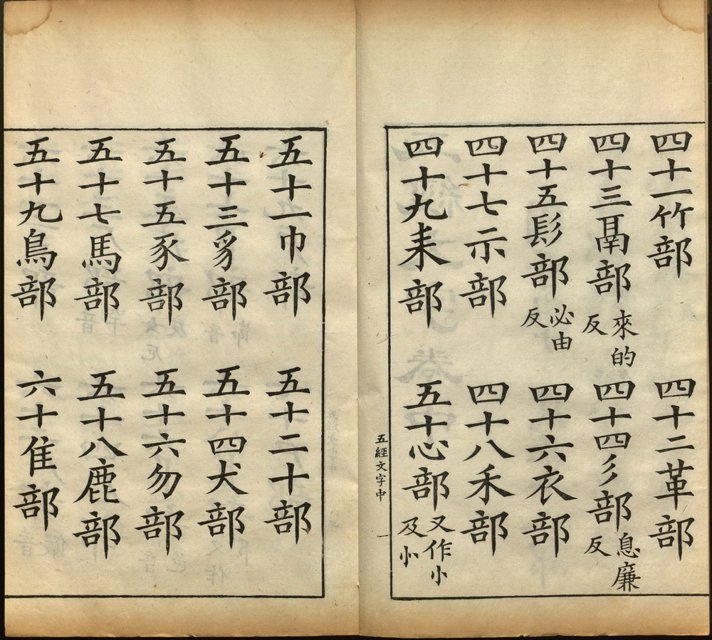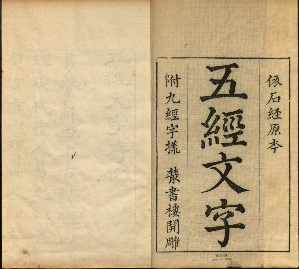 此《五经文字》三卷附九经字样,唐大历时期国子司业张参撰。其内容为辨正经传文字形体,所收文字除见于易、书、诗、礼、春秋五经的以外,也兼收《论语》、《尔雅》中的字。原书最初书于国学讲论堂东西厢屋壁。唐文宗间刻石经,附于九经之后。书名叶正中题”五經文字”,右上题”依石經原本”,左题”附九經字樣,叢書樓開雕”。正文卷端题”五經文字卷上”,下无署名。四周单边,白口无鱼尾,无竖栏,框高22.9宽15.0厘米。正文前有唐大历十一年(776)张参”五經文字序例”。末册为《新加九经字样》一卷,凡76部421字。卷前有唐玄度序。无藏印。
