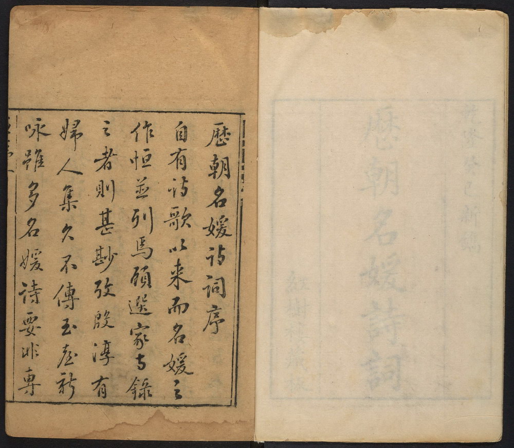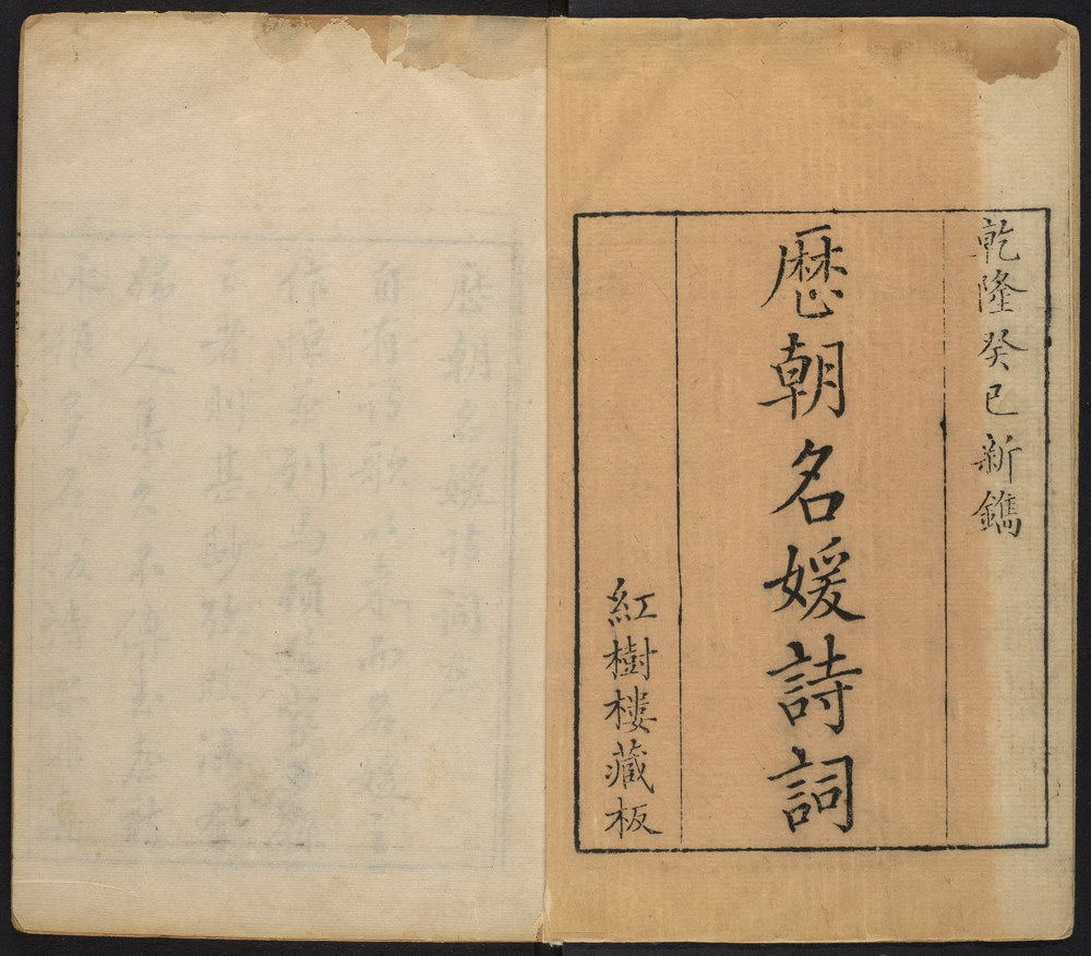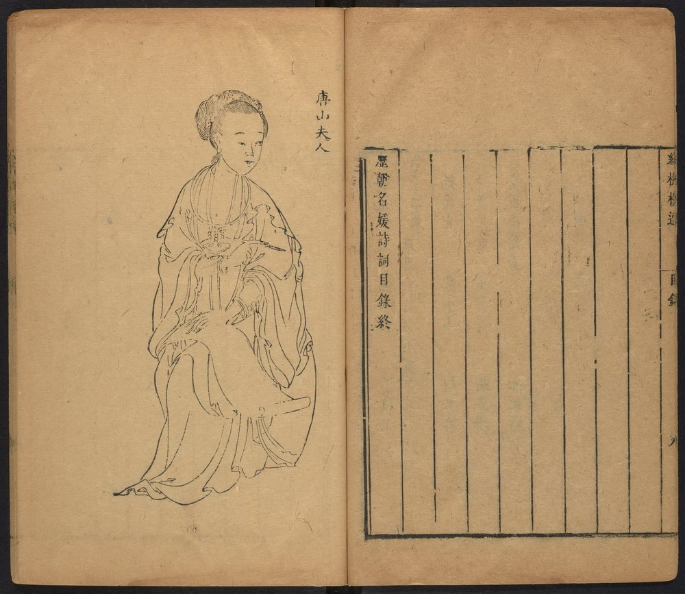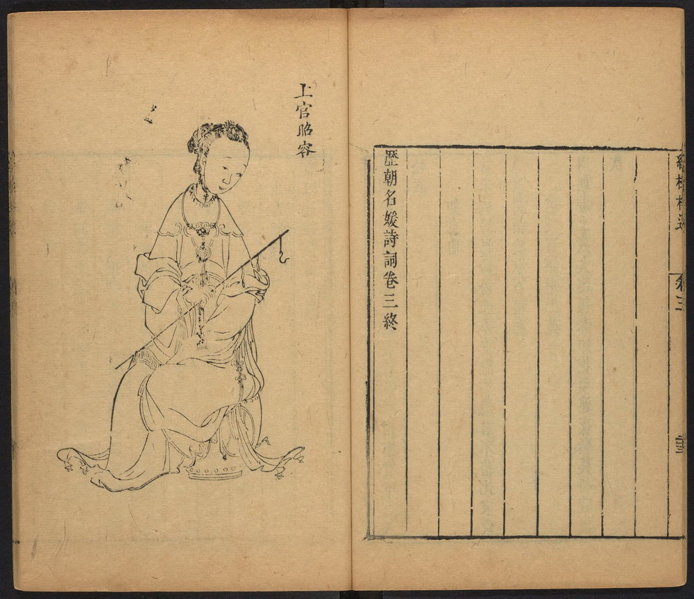 《历朝名媛诗词》为清代陆昶评选。全书共十二卷,内收王嬙、蔡琰、鱼玄机、薛涛、李清照等汉至元间两百余位名媛的诗词,共六百九十八首,以诗存人。诗词前附名媛绣像(共约五十七幅),又叙小传。人物目录:唐山夫人、虞姬、王嬙、班婕妤、赵飞燕、罗敷、卓文君、蔡琰、谢道韫、桃叶、绿珠、谢芳姿、子夜、青溪小姑、刘令娴、沈满愿、王玉京、木兰、莫愁、乐昌公主、胡太后、崔孃、吴绛仙、丁六孃、苏蕙、上官昭容、七岁女子、开元宫人、天宝宫人、宋氏姐妹(宋若昭、宋若宪)、江采苹、杨贵妃、杜羔妻赵氏、光威裒、鱼元机、李弄玉、薛涛、关盼盼、崔莺莺、步非烟、章台柳、红绡、花蘂夫人、黄崇嘏、汴梁宮人、蒨桃、朱淑真、黄孃、谢金莲、辽后、管夫人、阿盖主、孙蕙兰、李清照、孙夫人、王清惠、琴操。