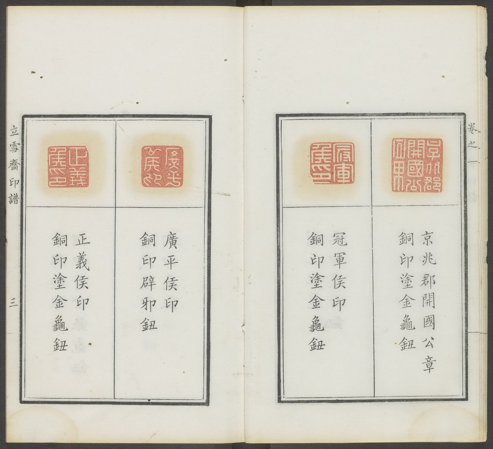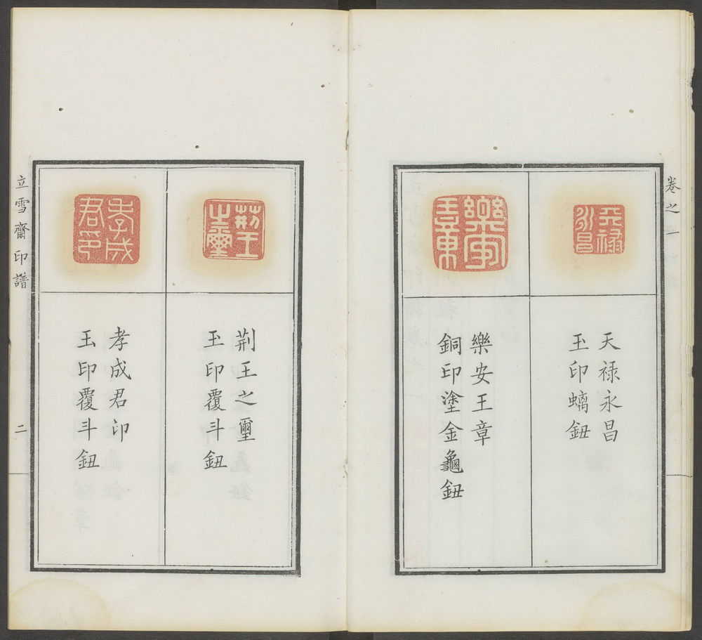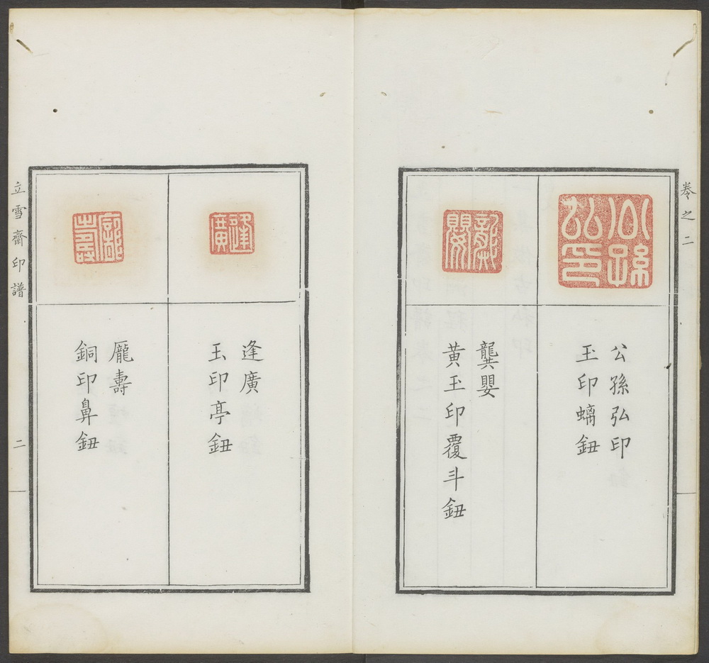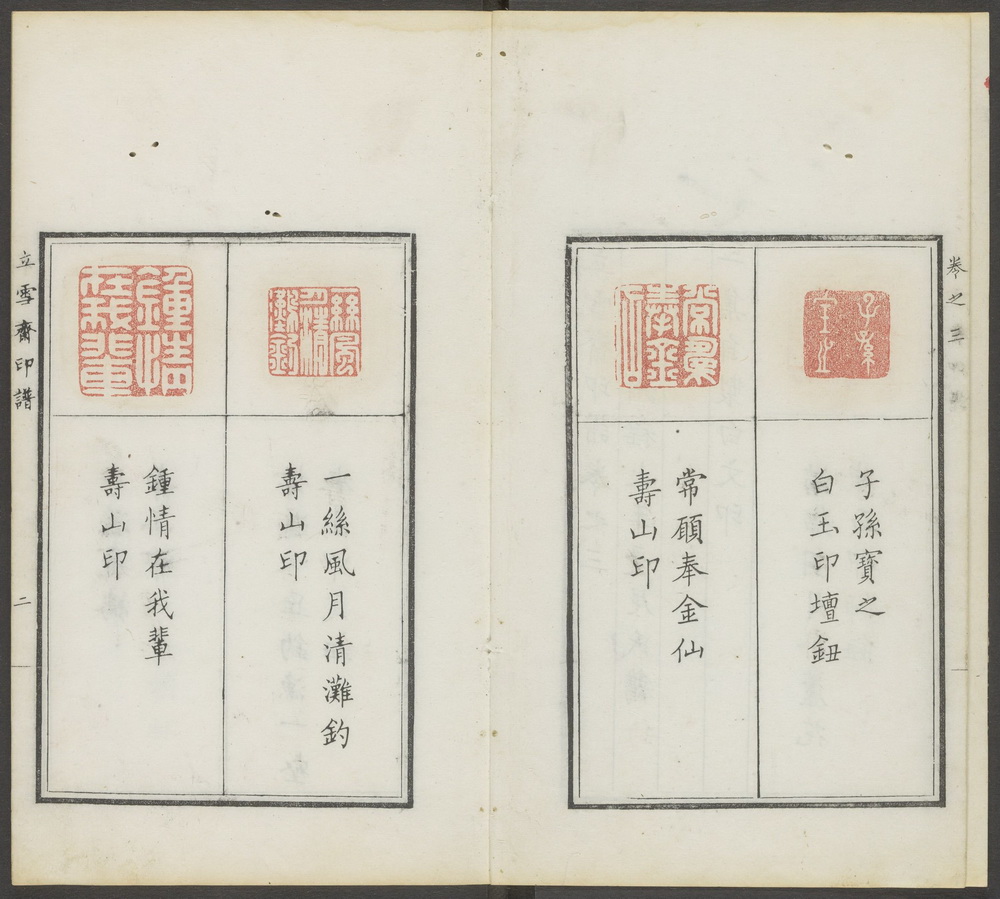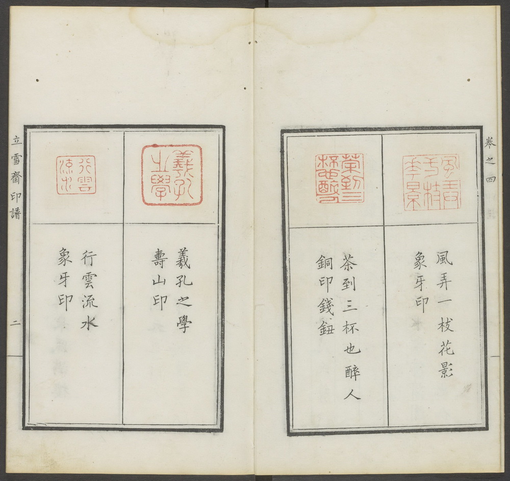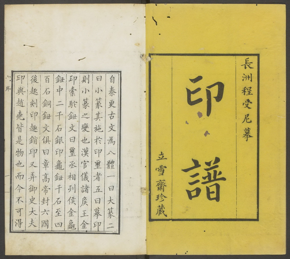 《立雪斋印谱》为明清时期篆刻家程大年摹辑。全书共四卷,分为:仿古官印、仿古私印、自制白文印、自制朱文印,共收印五百八十余方,有鹤西老人尤侗、亦山金天昭、明山湾钓徒郑鉽序,吕显标跋。