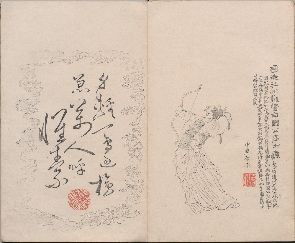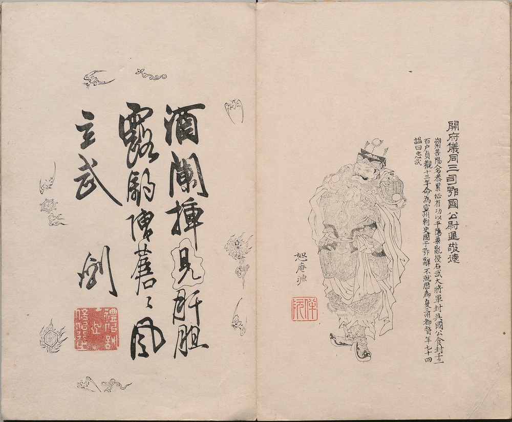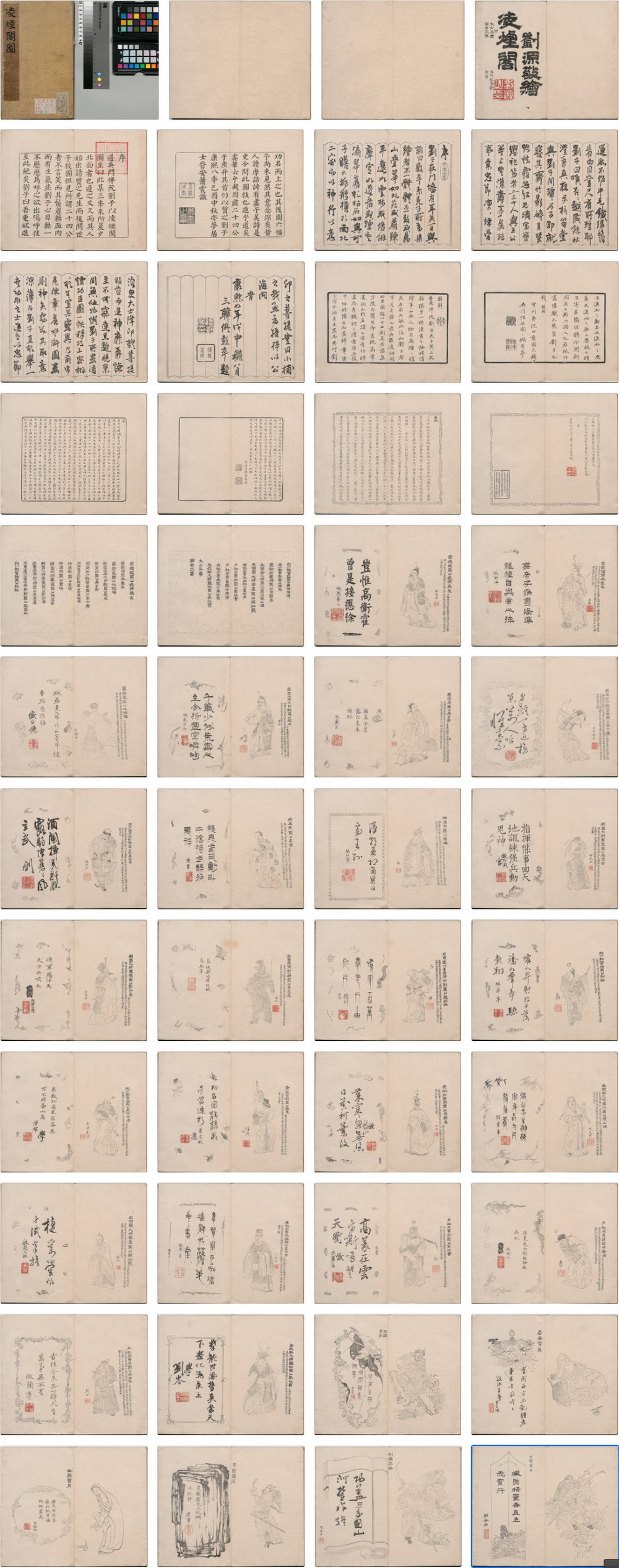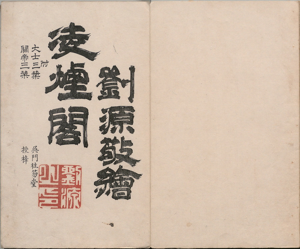《凌烟阁功臣图》由清代刘源绘制,名工朱圭镌刻。全书摹绘唐太宗时二十四位功臣人物画像,始于:长孙无忌。终于:秦叔宝。后附大士及关帝像各三幅。每像都附题赞,题赞纹饰有秦砖汉瓦、钟磬鼎彝、刀剑法器、书砚琴瑟等。