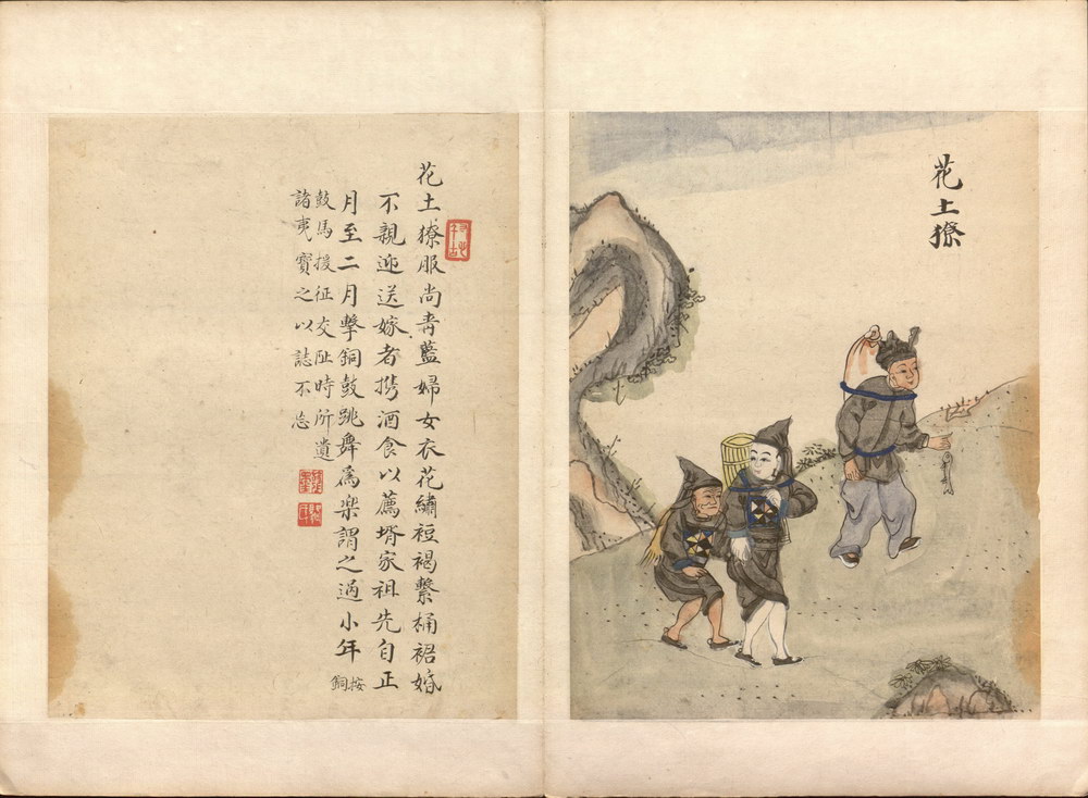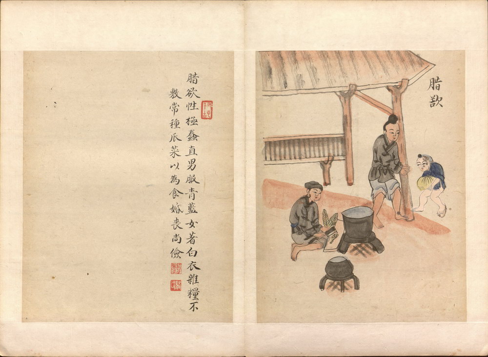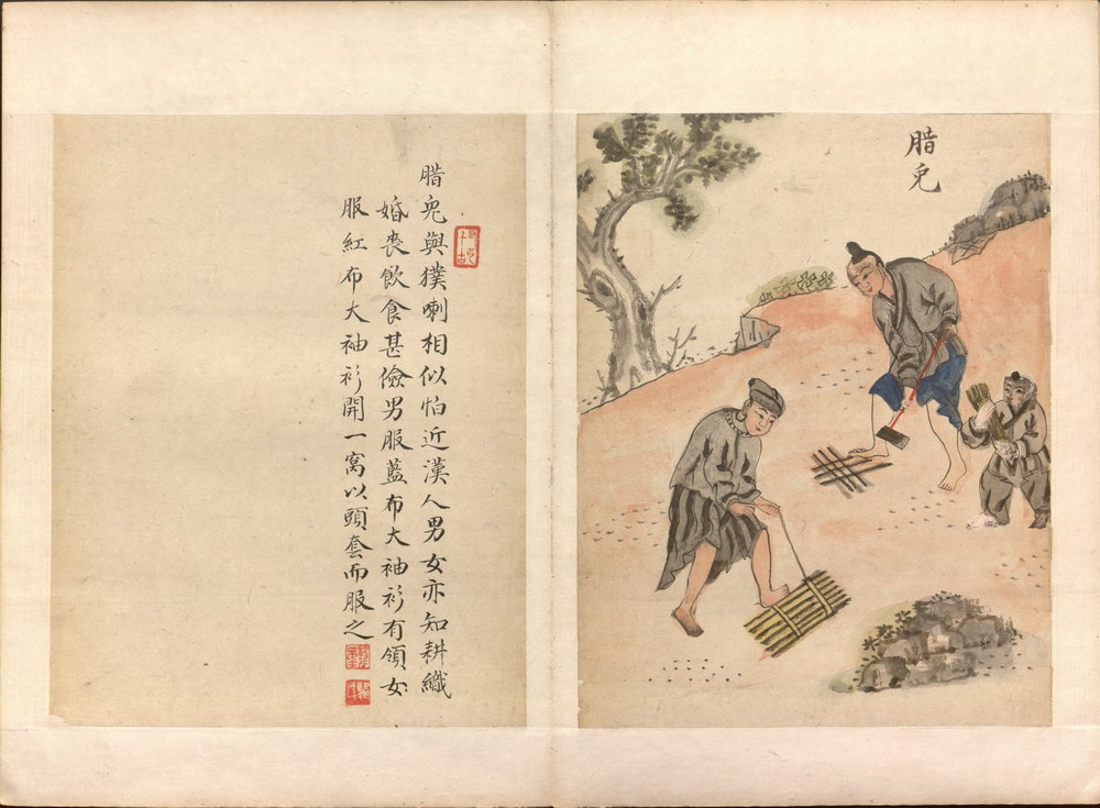 关注苗族原住民生活;此书列苗族各分支,上下册各十八种,总三十六图,水墨彩绘。第一卷,右叶彩绘,左叶风俗注解;第2卷,无注释的彩绘。