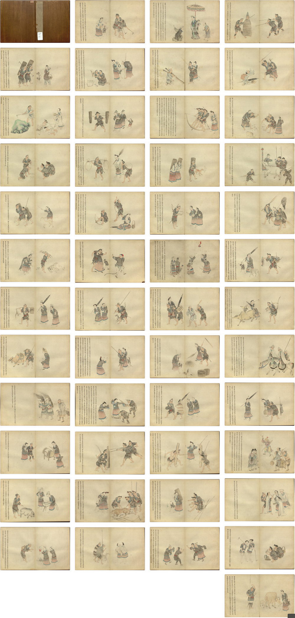 此书列苗族各分支,总四十八图,水墨彩绘,左右对开成一图。右图左文,图绘人物各类活动,描绘颇精,施色层次分明;文述概况,记地理风俗习惯,间及历史及与中原关系。