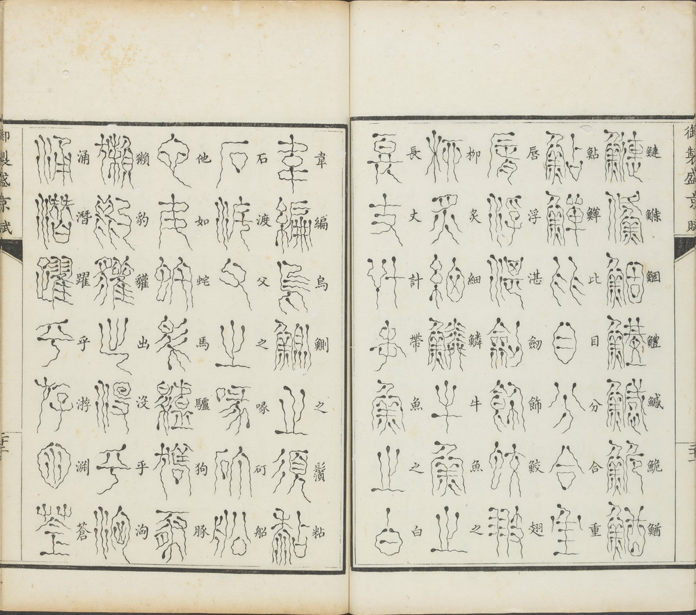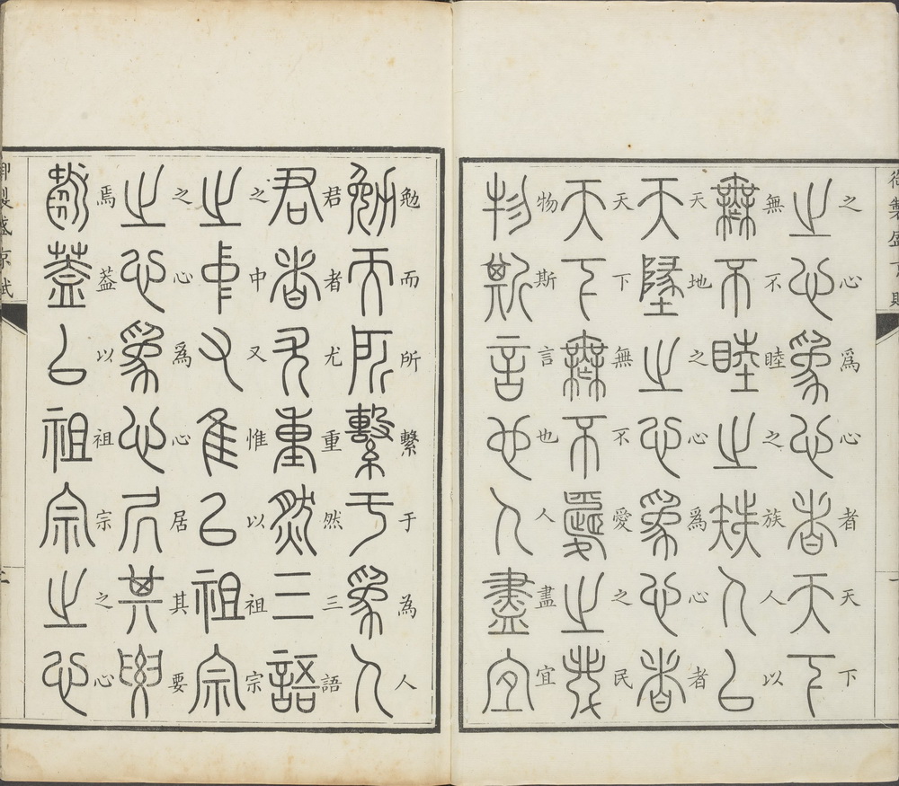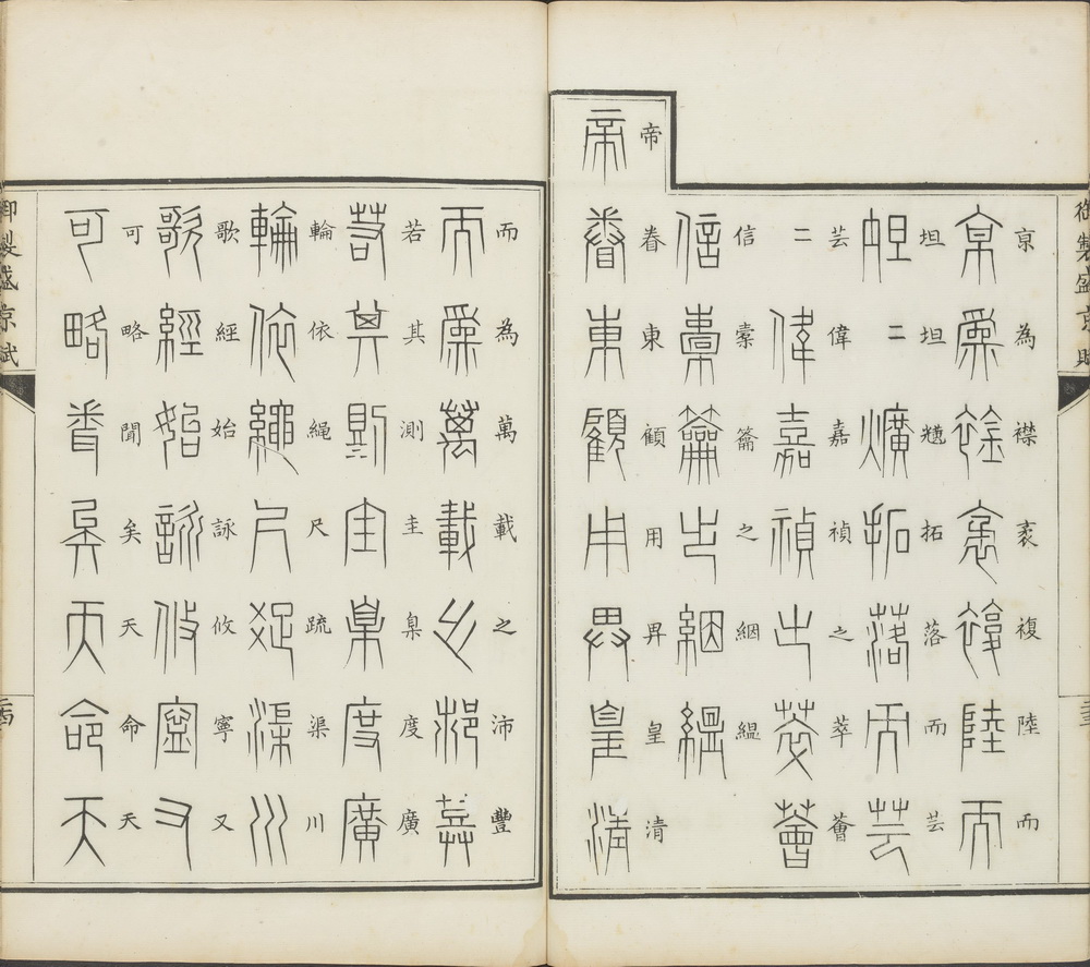 《御制盛京赋》由清高宗弘历撰,傅恒等编校,共含篆文三十二体。此哈佛大学图书馆藏本存十五种:大篆、倒薤篆、垂云篆、垂露篆、转宿篆、麟书篆、鸾凤篆、龙书篆、龟书篆、鹄头篆、鸟书篆、科斗篆、缨络篆、悬针篆、刻符篆。每部后面都附有 “篆书缘起”,考述该种篆体的创制或流转的情况。钤印:綠漪書屋章。