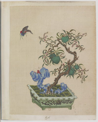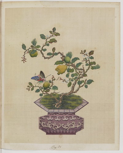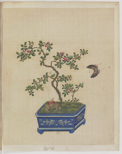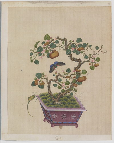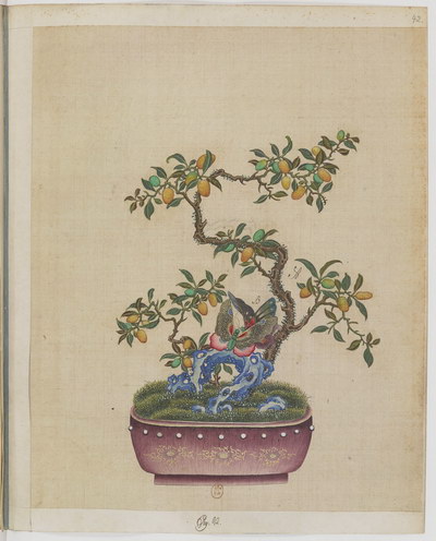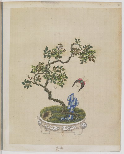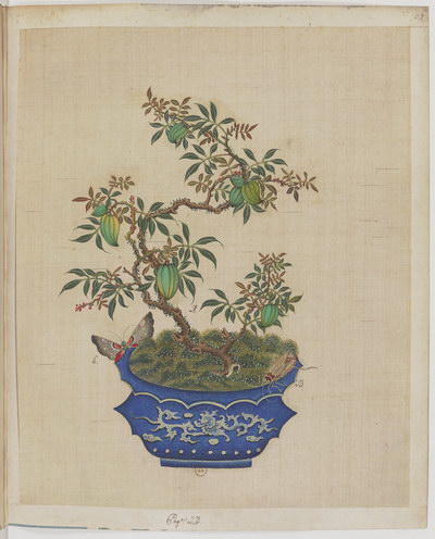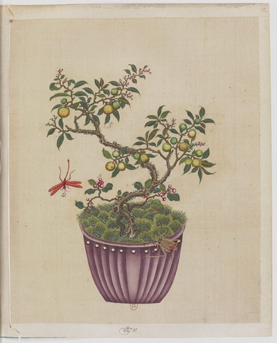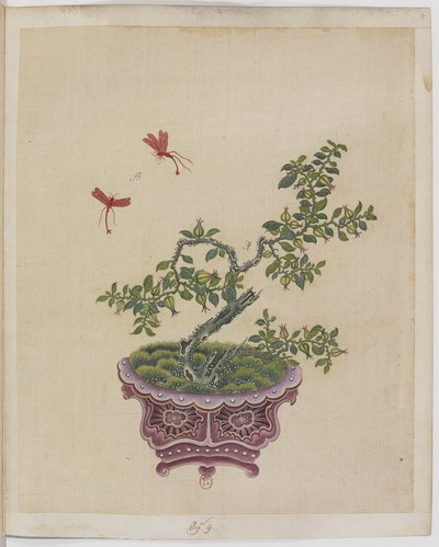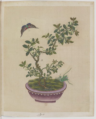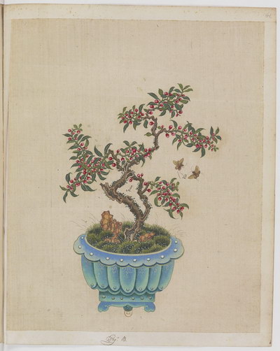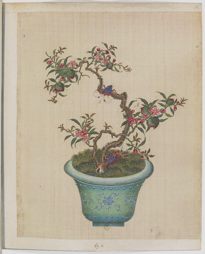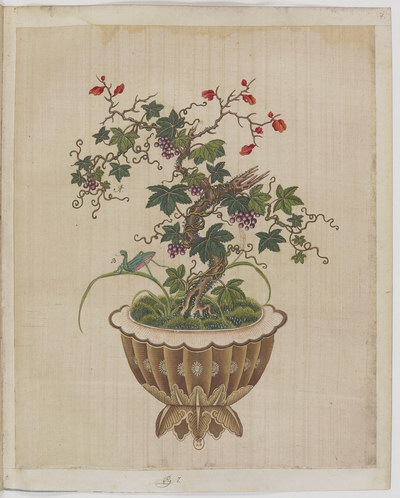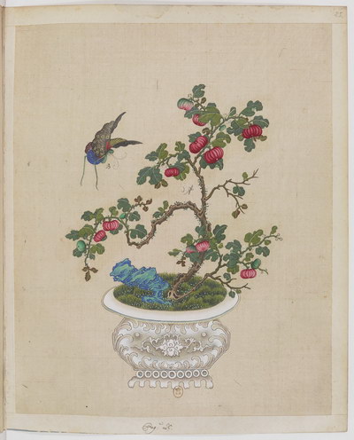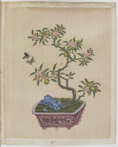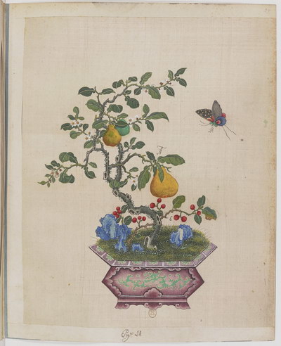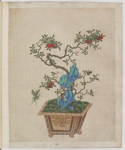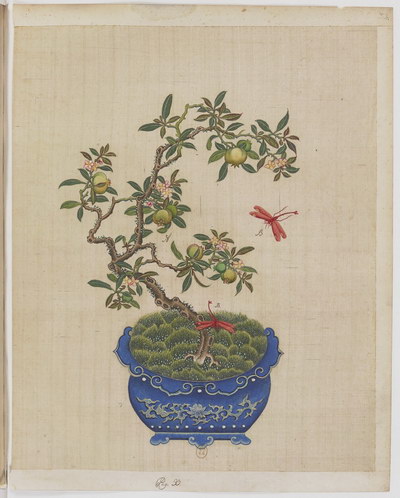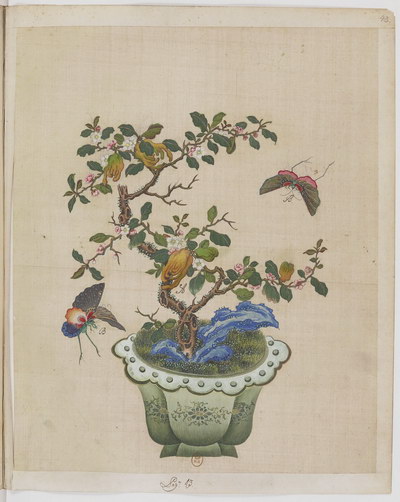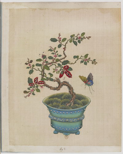 这两册《Fleurs.oiseaux et insectes》(盆景花鸟图册)外销画大约绘制于十八世纪(中国),书内包含插图一百幅:上册以鸟类、花卉为题材营造的中式盆景图样五十幅,下册以昆虫、果木为题材营造的中式盆景图样五十幅。