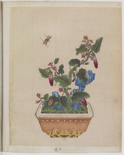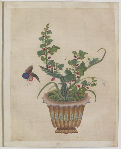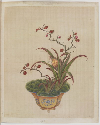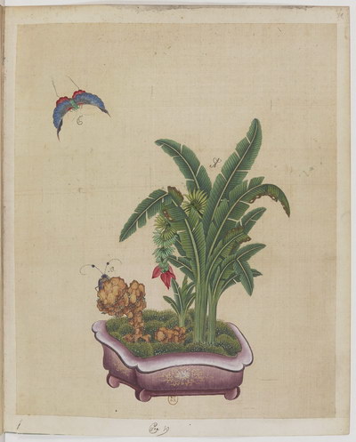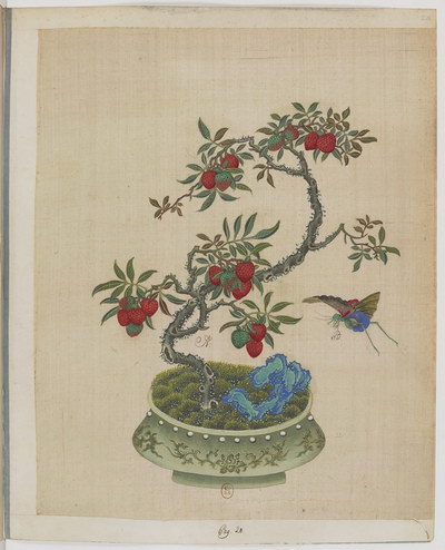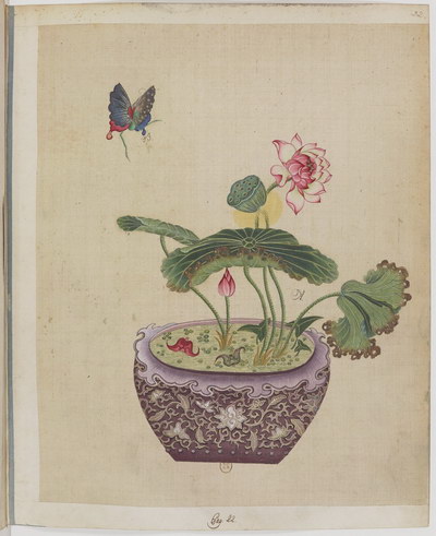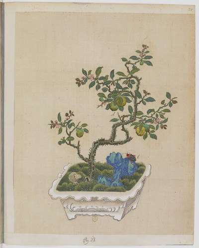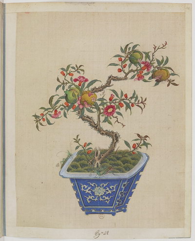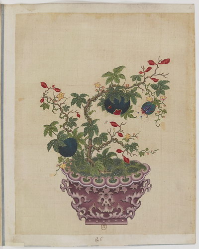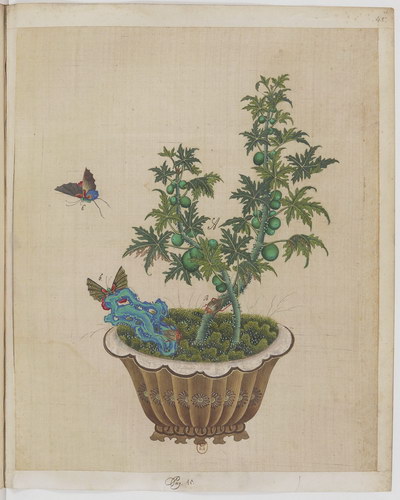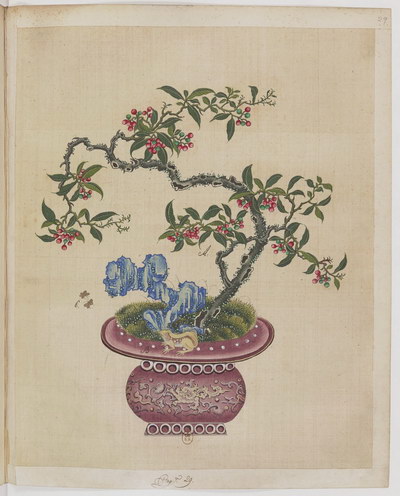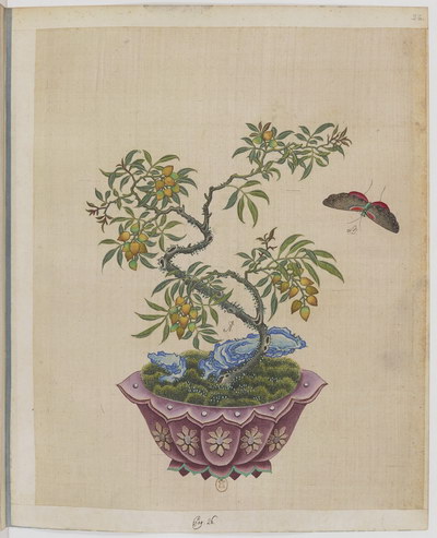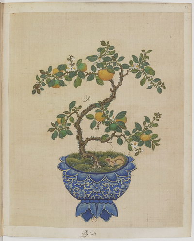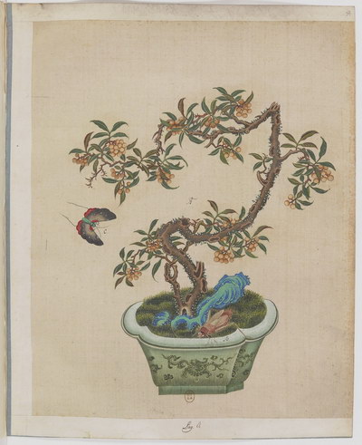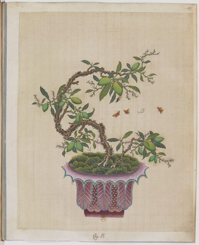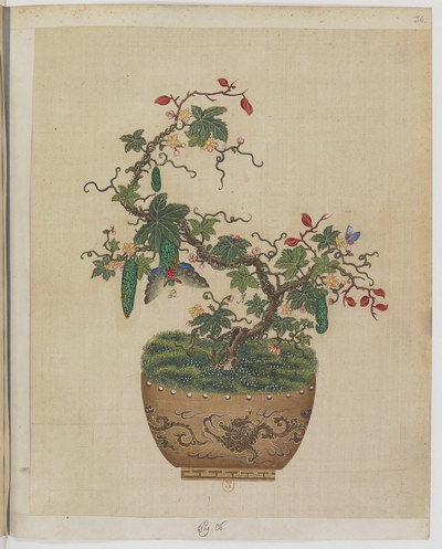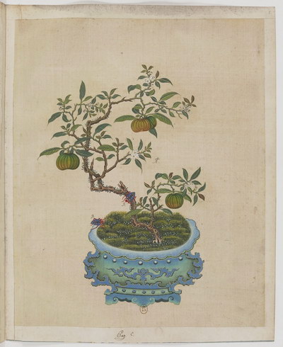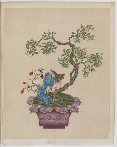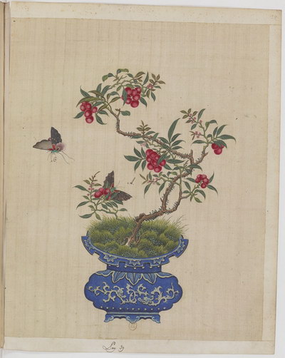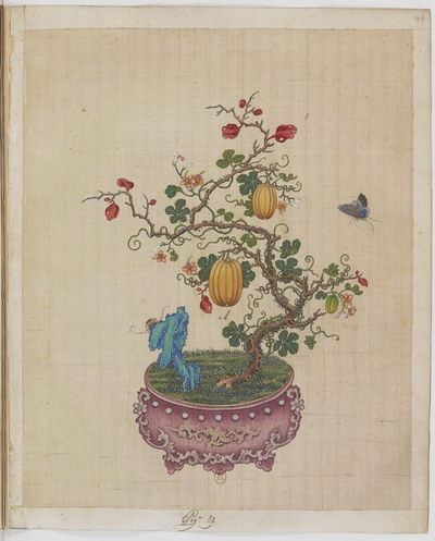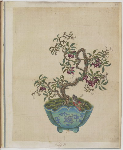 这两册《Fleurs.oiseaux et insectes》(盆景花鸟图册)外销画大约绘制于十八世纪(中国),书内包含插图一百幅:上册以鸟类、花卉为题材营造的中式盆景图样五十幅,下册以昆虫、果木为题材营造的中式盆景图样五十幅。