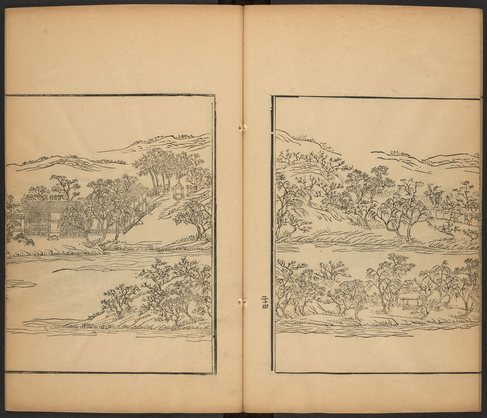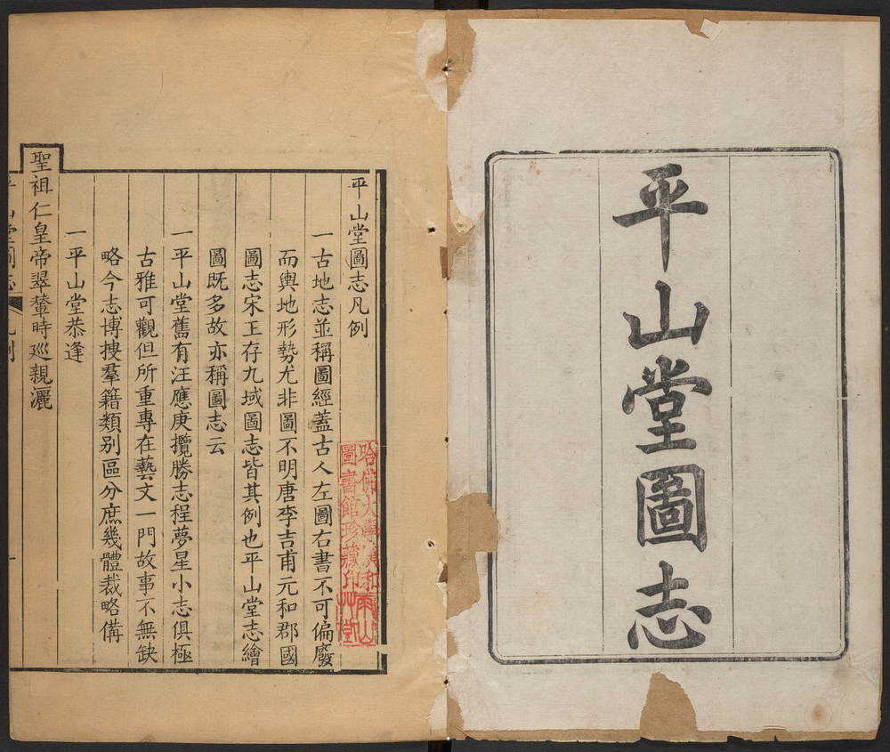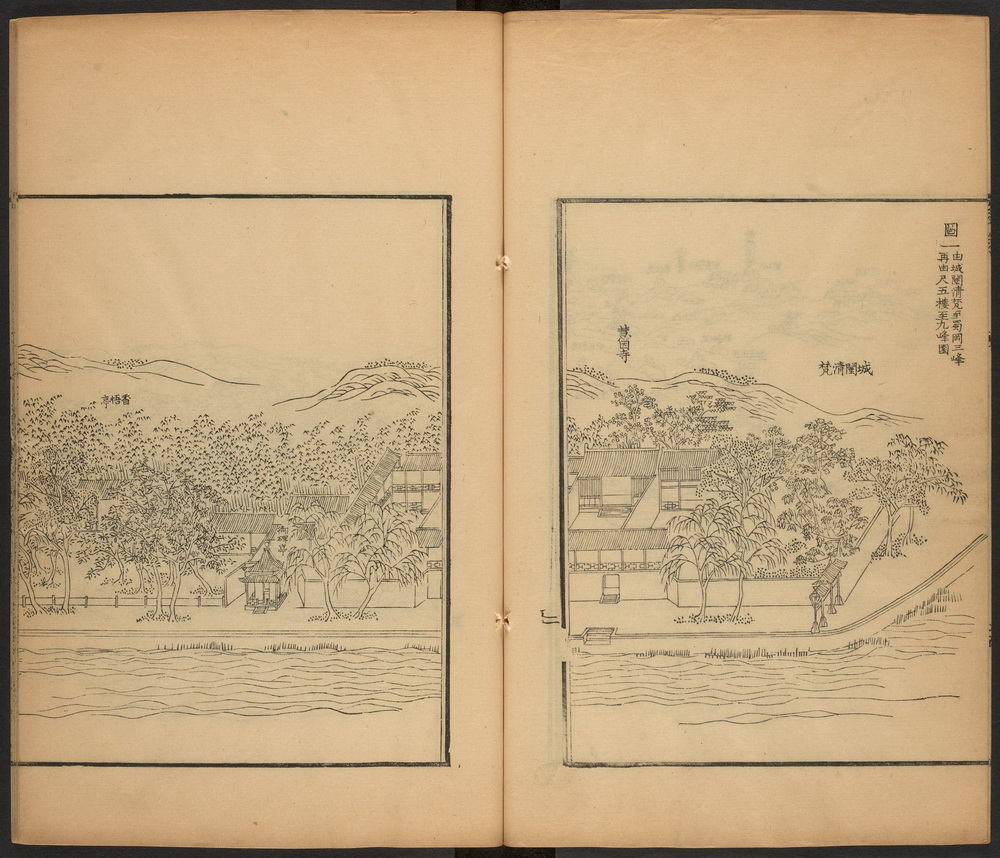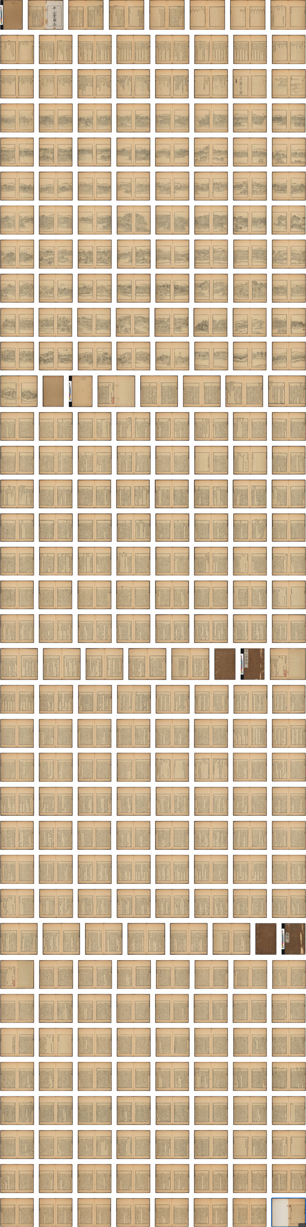 《平山堂图志》十卷卷首一卷,详述了平山堂之景观、沿革、旧闻。卷首附《名胜全图》66幅版画,采用连页式绘图。雕工精美,图画细致,为清代版画代表之作。