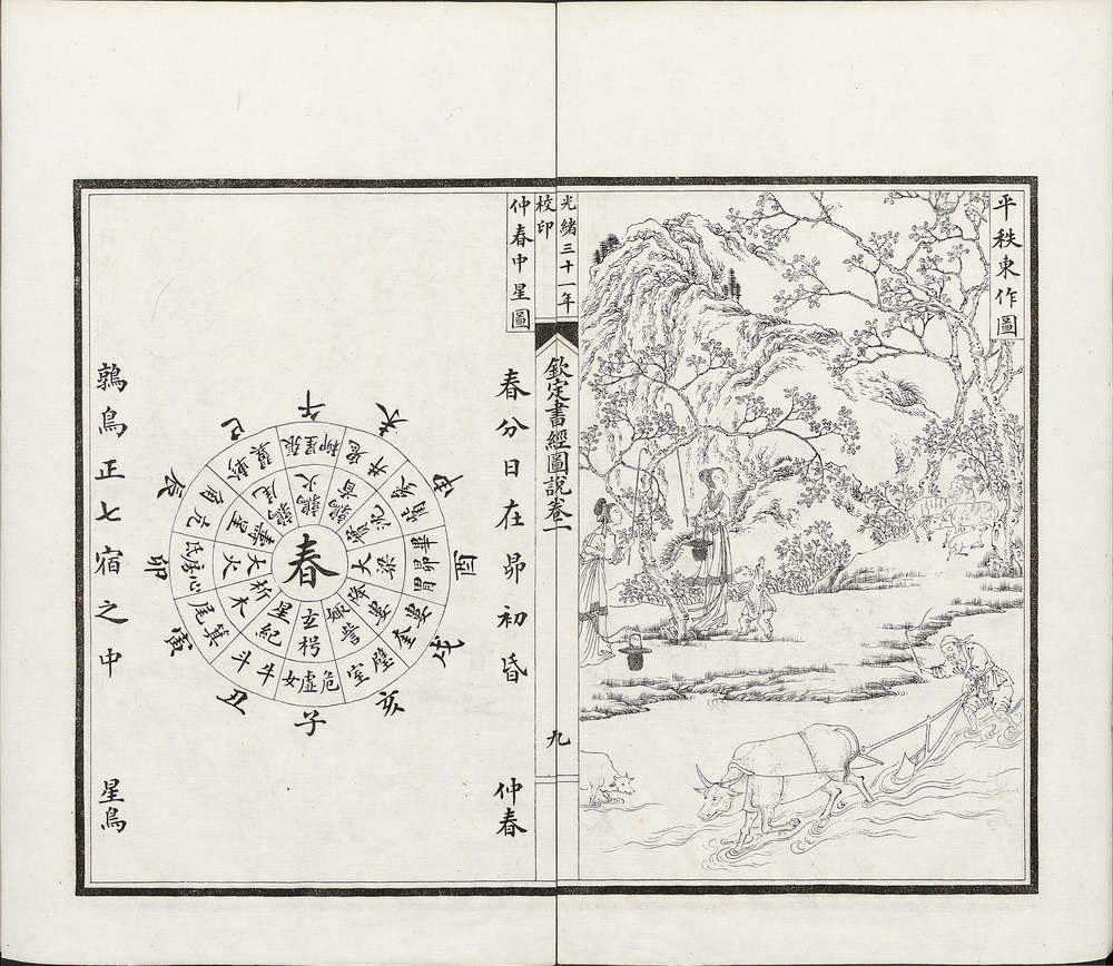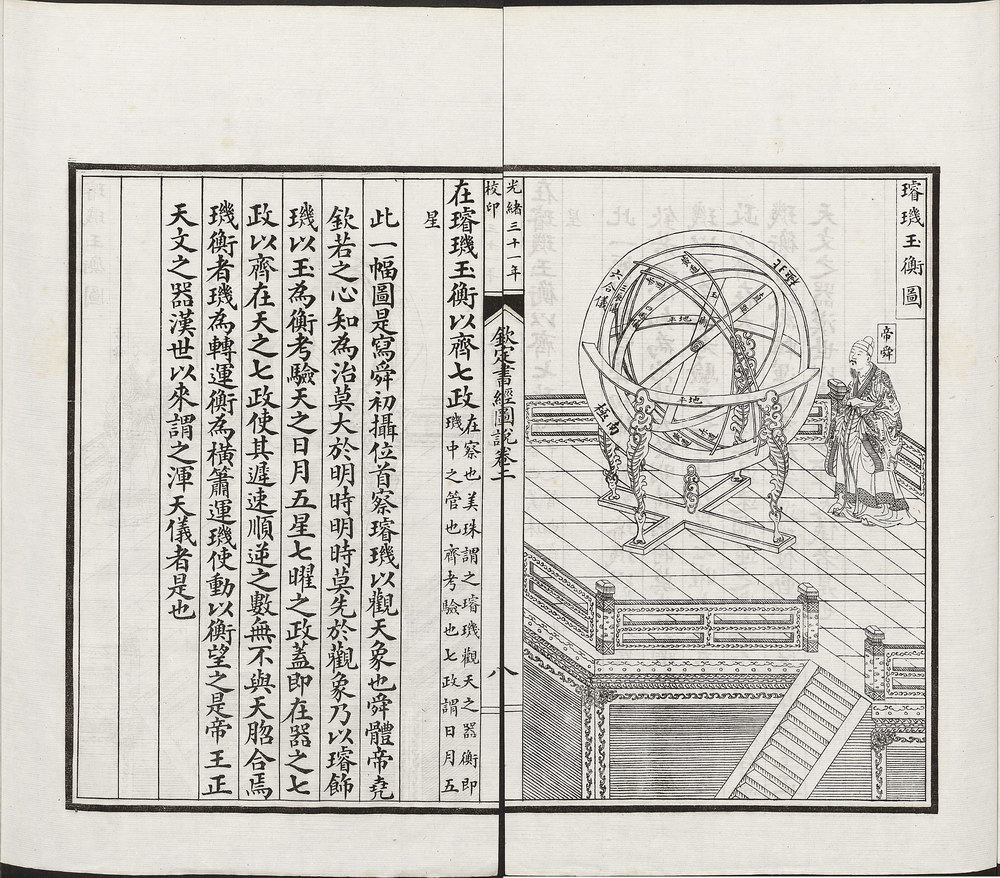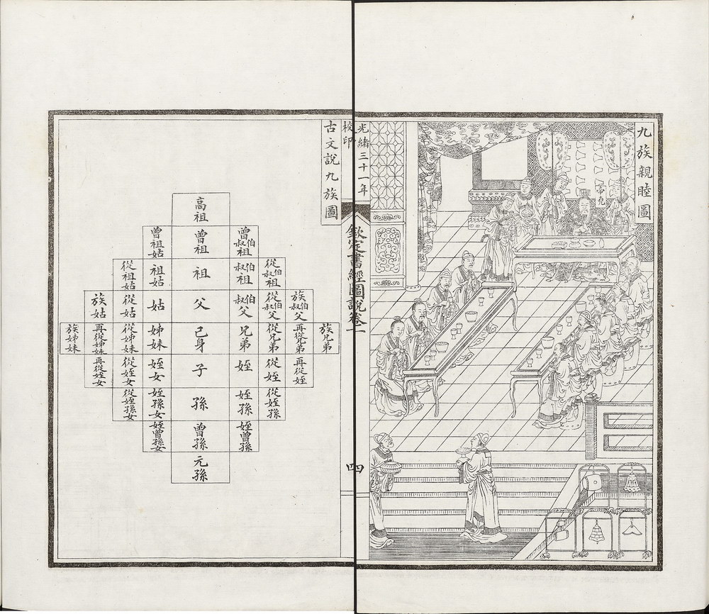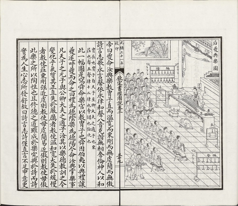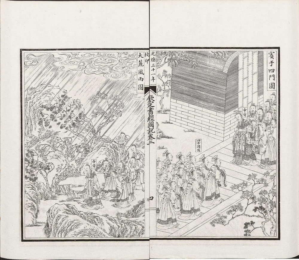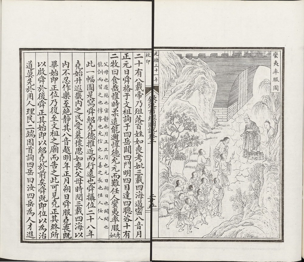 《钦定书经图说》是清光绪年间孙家鼐等奉慈禧太后懿旨编纂。全书两函十六册共五十卷,内容为儒家经典《尚书》全文配绘插图,含版画约五百七十幅。其中一些礼仪场景参考了儒家经典记载,具有文献艺术等多方面的参考价值。图绘工致,版印精能,而楼台界画,人物勾勒,穷态极妍,犹见北宋遗规。