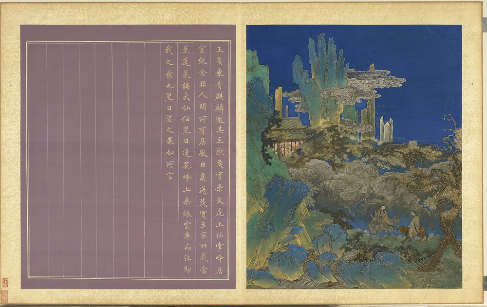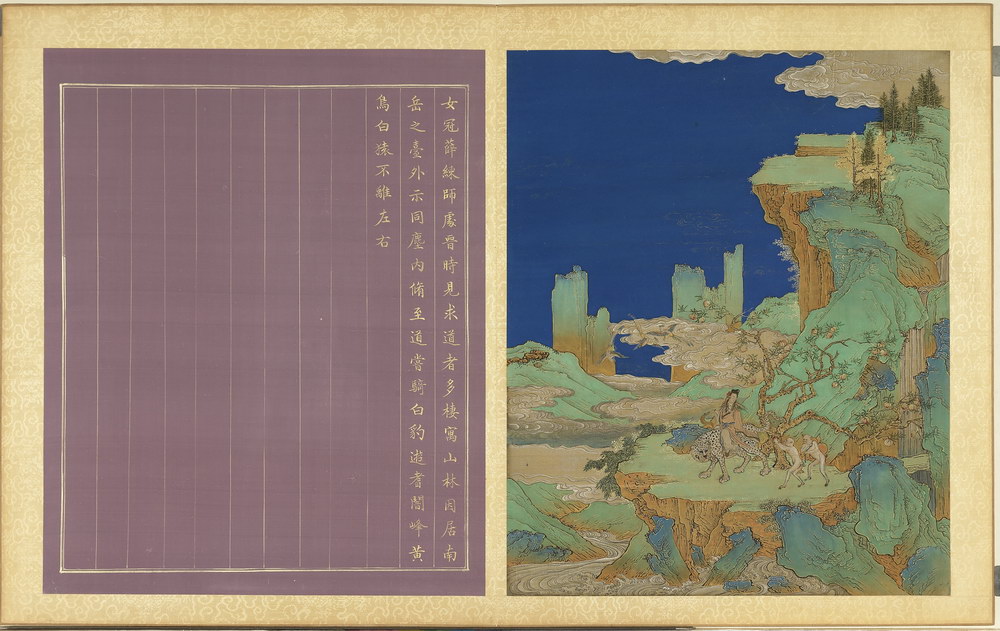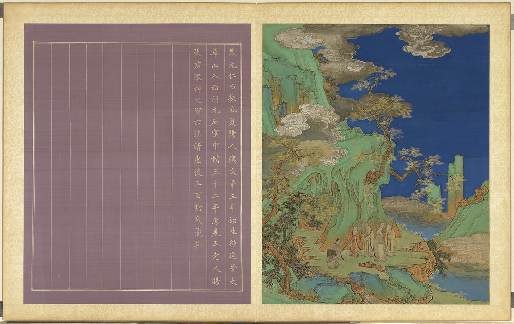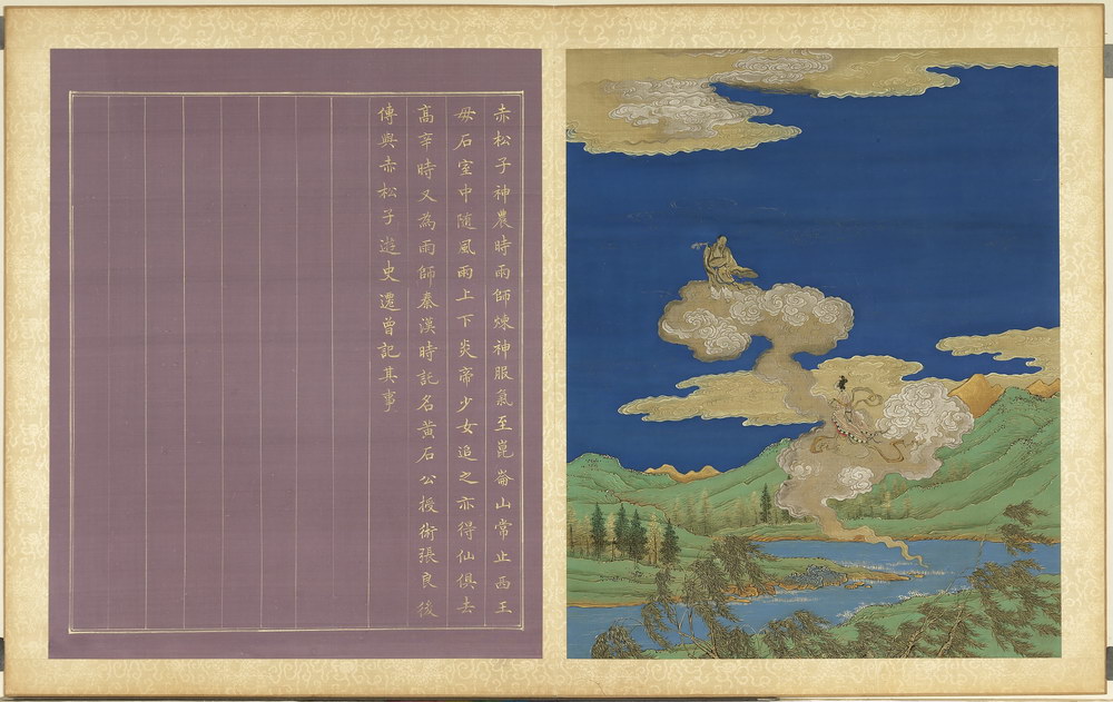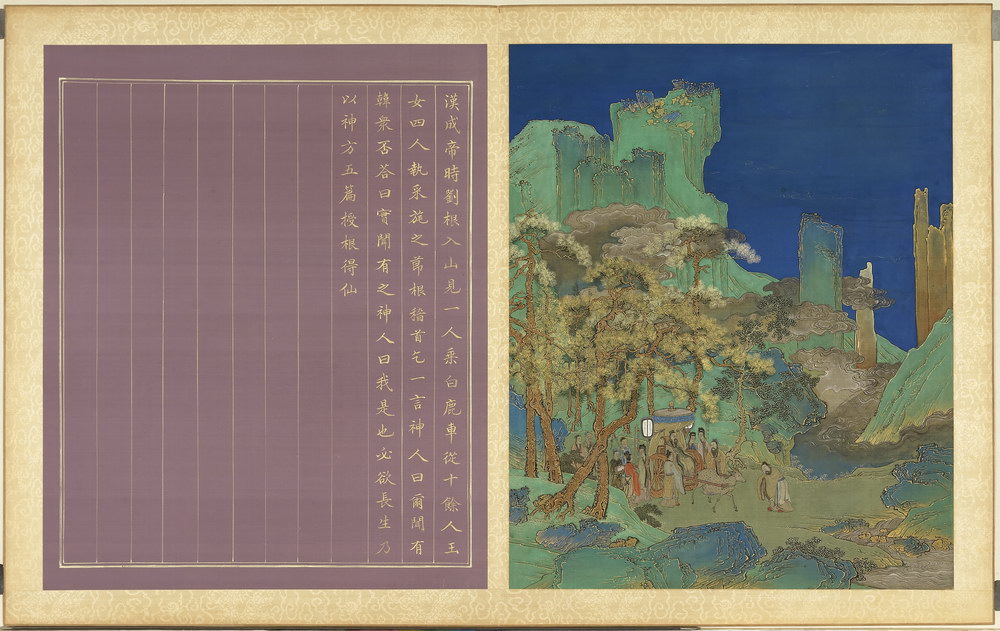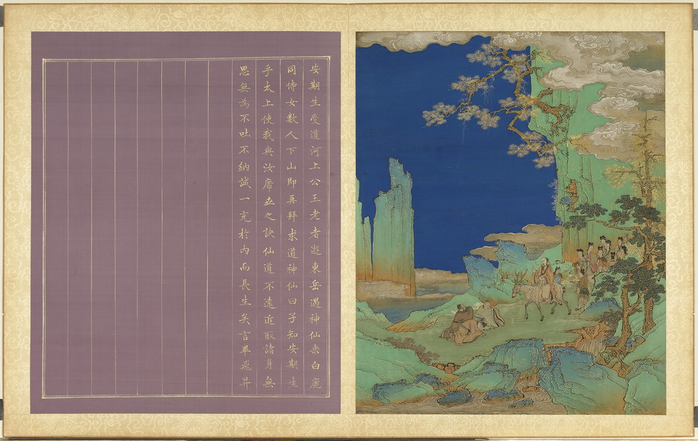 为供内廷祝寿、雅玩之需。内容仿照《列仙传》体例,描绘了二十个得道成仙的故事,始于:老子过函谷关。终于:王琼来乘青麟。每开左图青绿描金,右配释文。