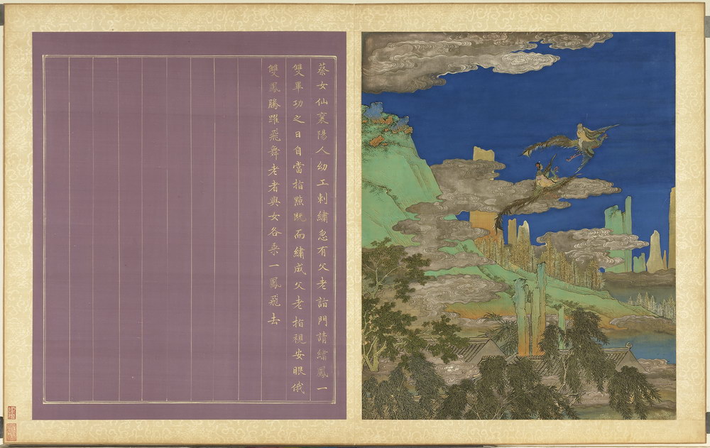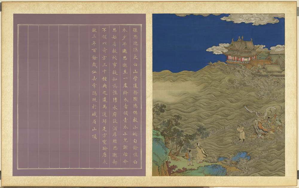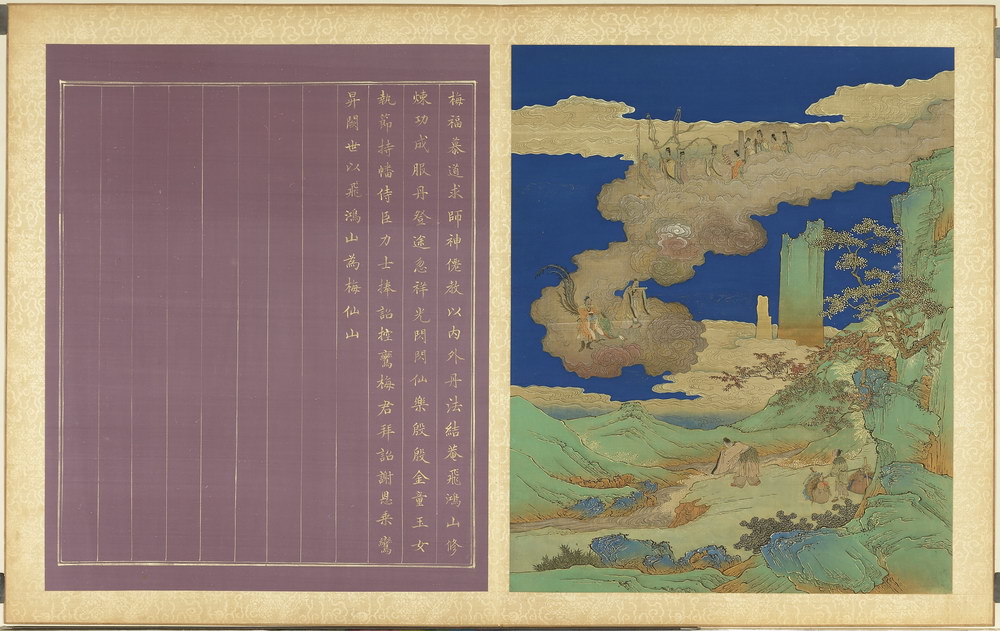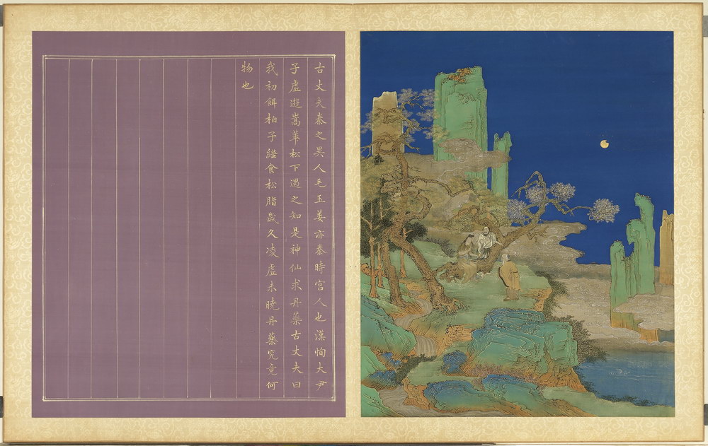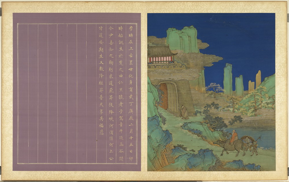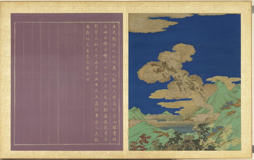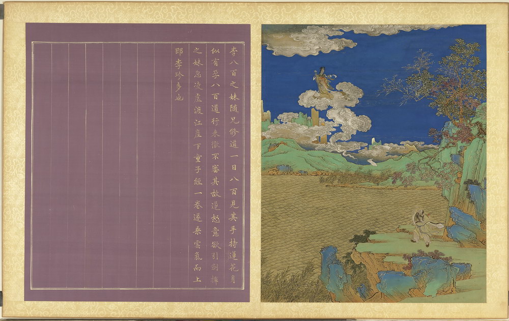 为供内廷祝寿、雅玩之需。内容仿照《列仙传》体例,描绘了二十个得道成仙的故事,始于:老子过函谷关。终于:王琼来乘青麟。每开左图青绿描金,右配释文。