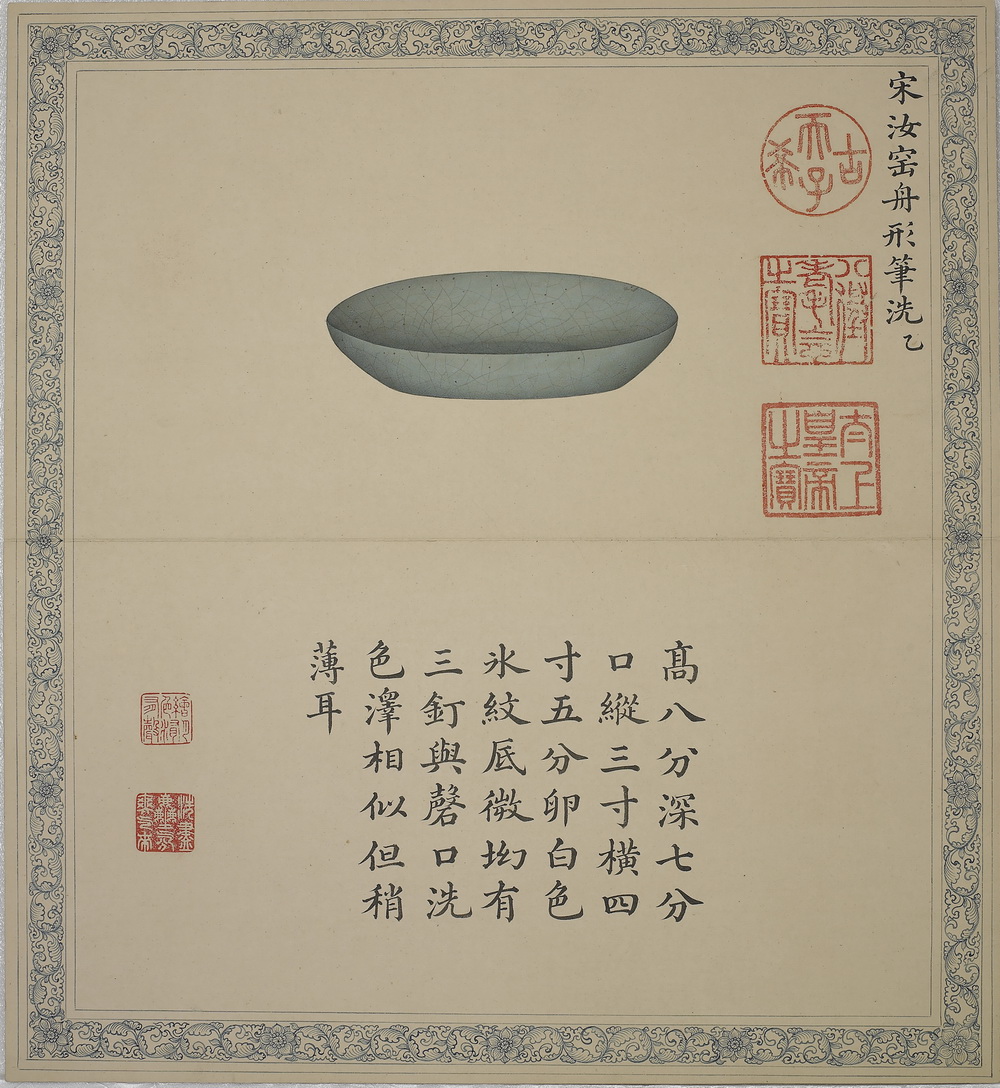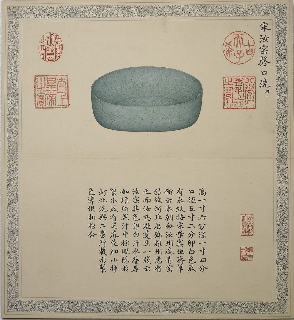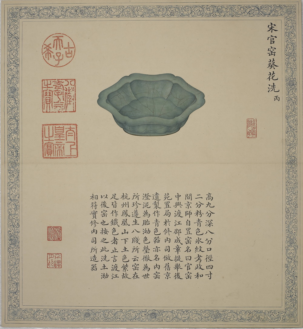 此册以紫檀木为壳面,封面正中题「埏埴流光」四字。「埏埴」两字出自老子《道德经》「埏埴以為器,當其無,有器之用。」指取土制器之意。内为册页十幅,彩绘十件瓷器,包含:宋汝窑磬口洗甲、宋汝窑舟形筆洗乙、宋官窑葵花洗丙、宋官窑菱花碟丁、宋哥窑乳爐戊、宋官窑葵花碟己、宋定窑蓮花盞庚、宋定窑方碟辛、明宣窑霽紅把椀壬、明成窑五彩碟癸。每页绘有花边框,上半为器名、器物彩绘图像及款识,下半详载器物尺寸及说明。钤乾隆皇帝品鉴章。