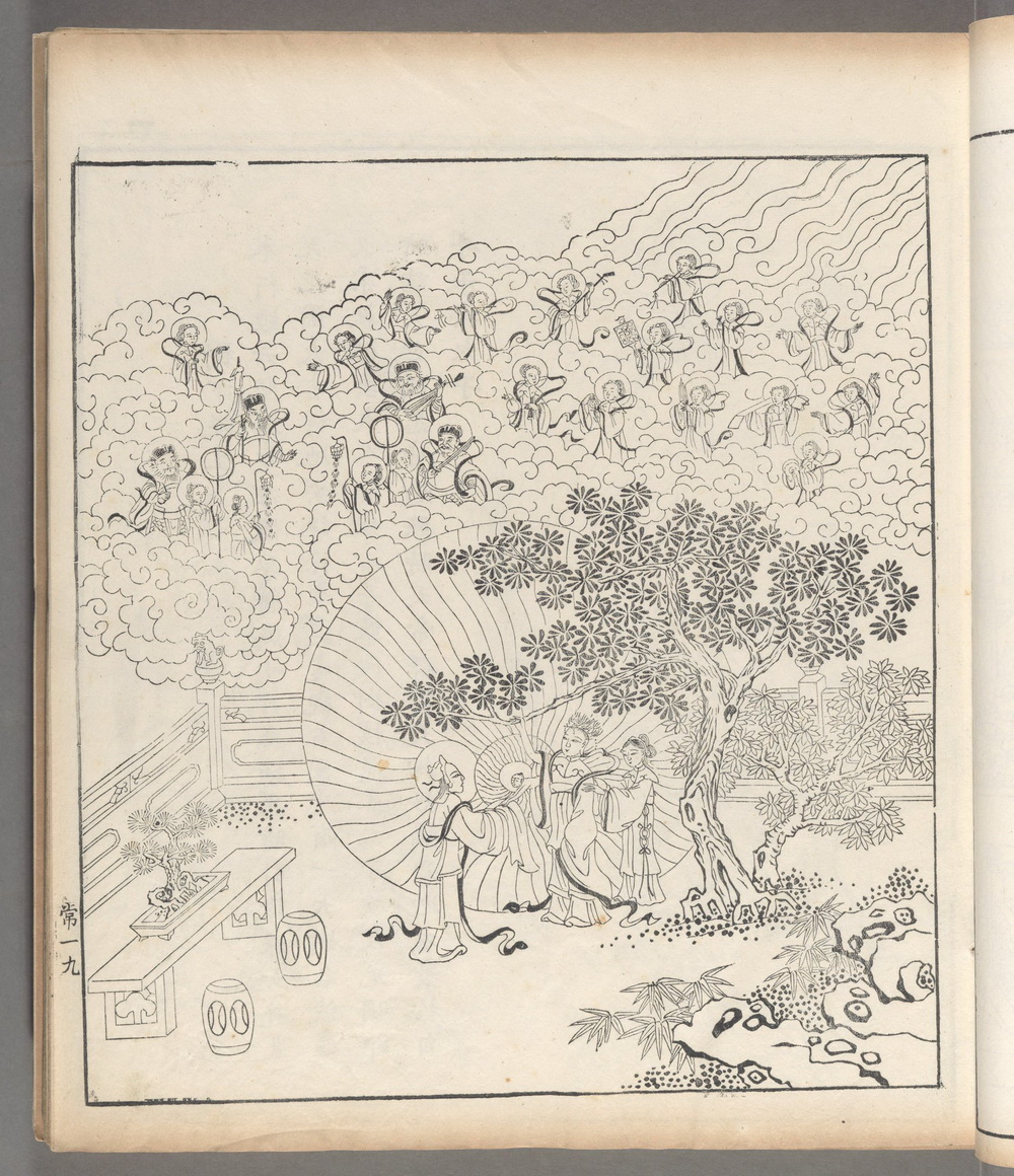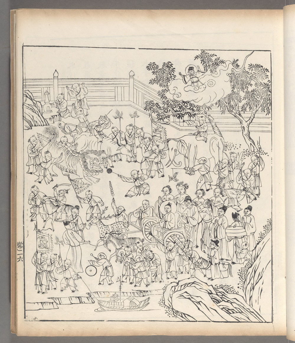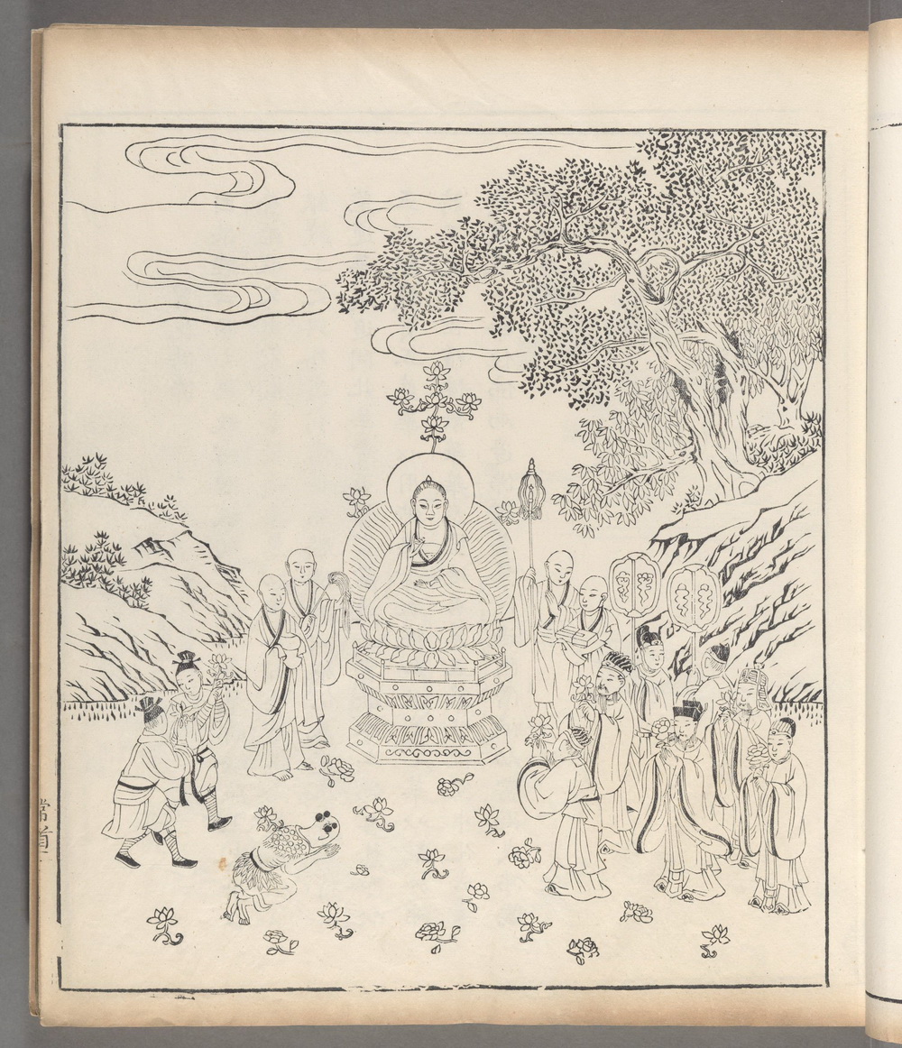 《释迦如来应化事迹》由清代永珊撰绘,全套共四册,描绘了释迦如来的生平事迹:诞生、出家、修行、成道、说法、涅盘、传承等应化事迹,一图一题,共二百余幅,所题文字引佛教经典,如《释迦谱》、《佛行本集经》。此为清嘉庆十三年和硕豫亲王裕丰刊,同治年间刊本。