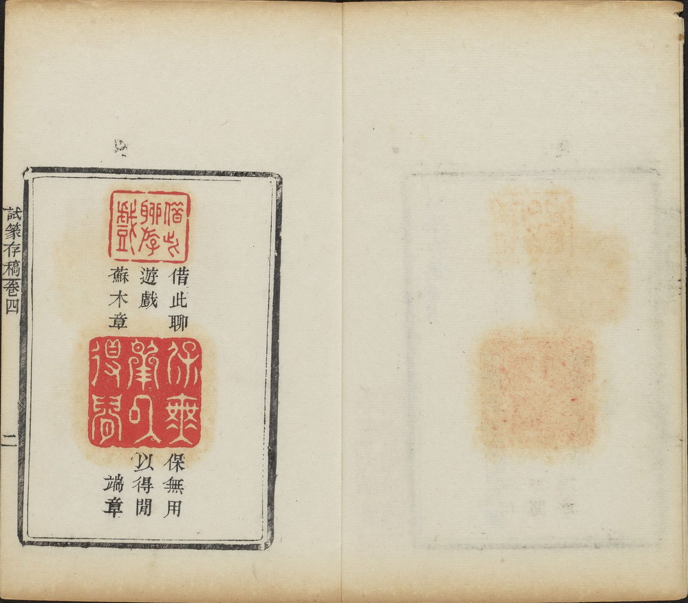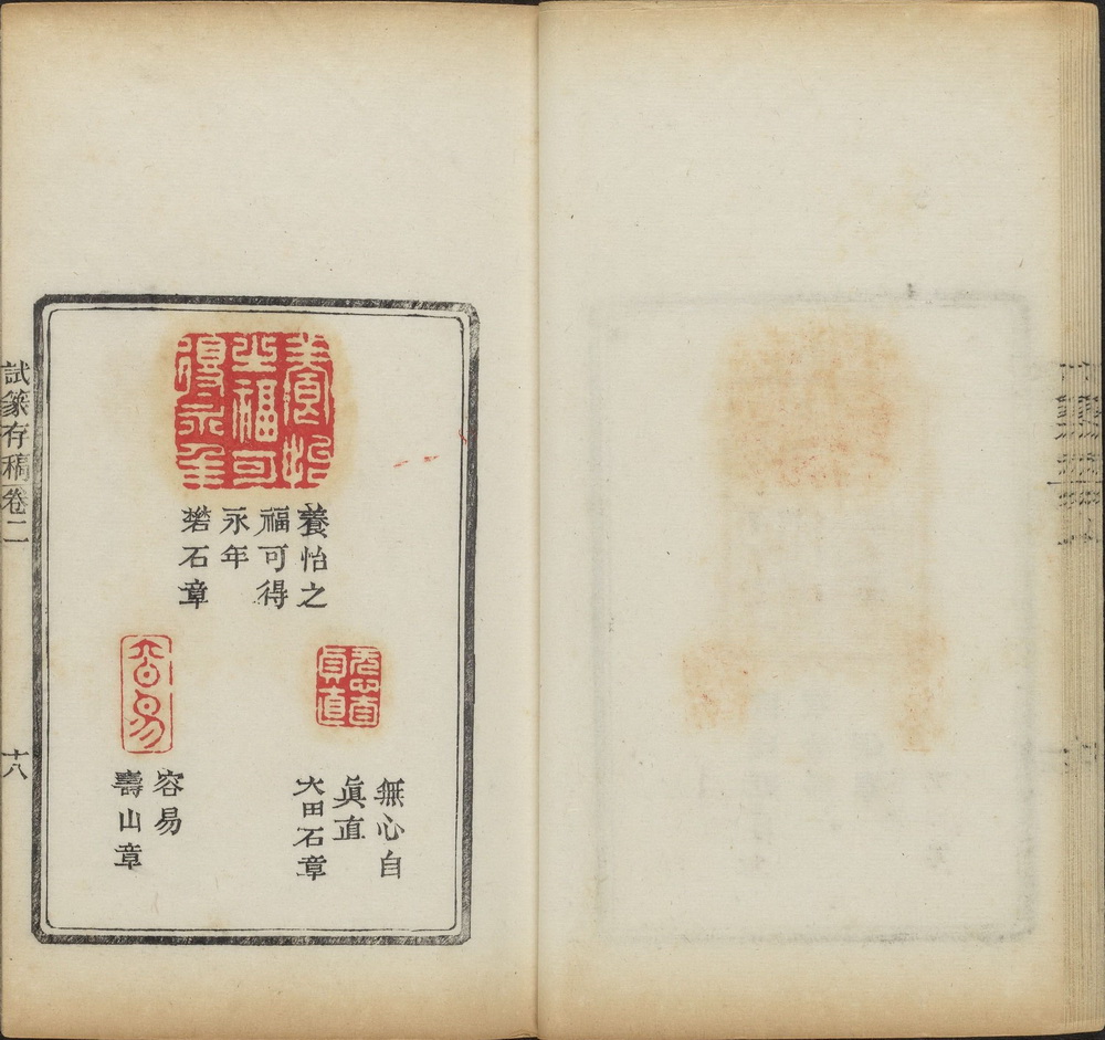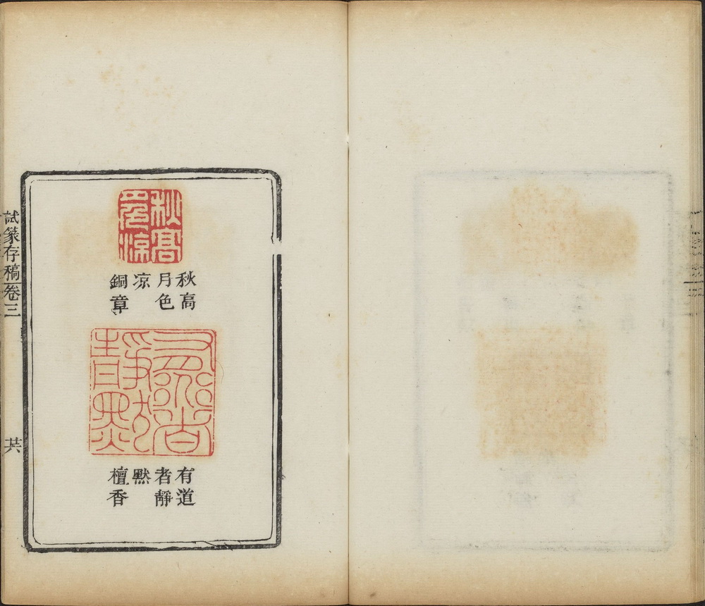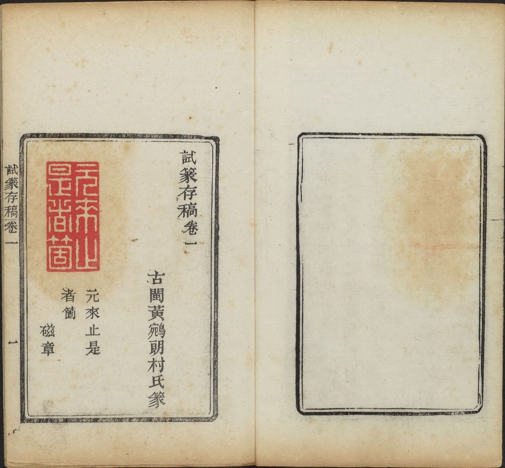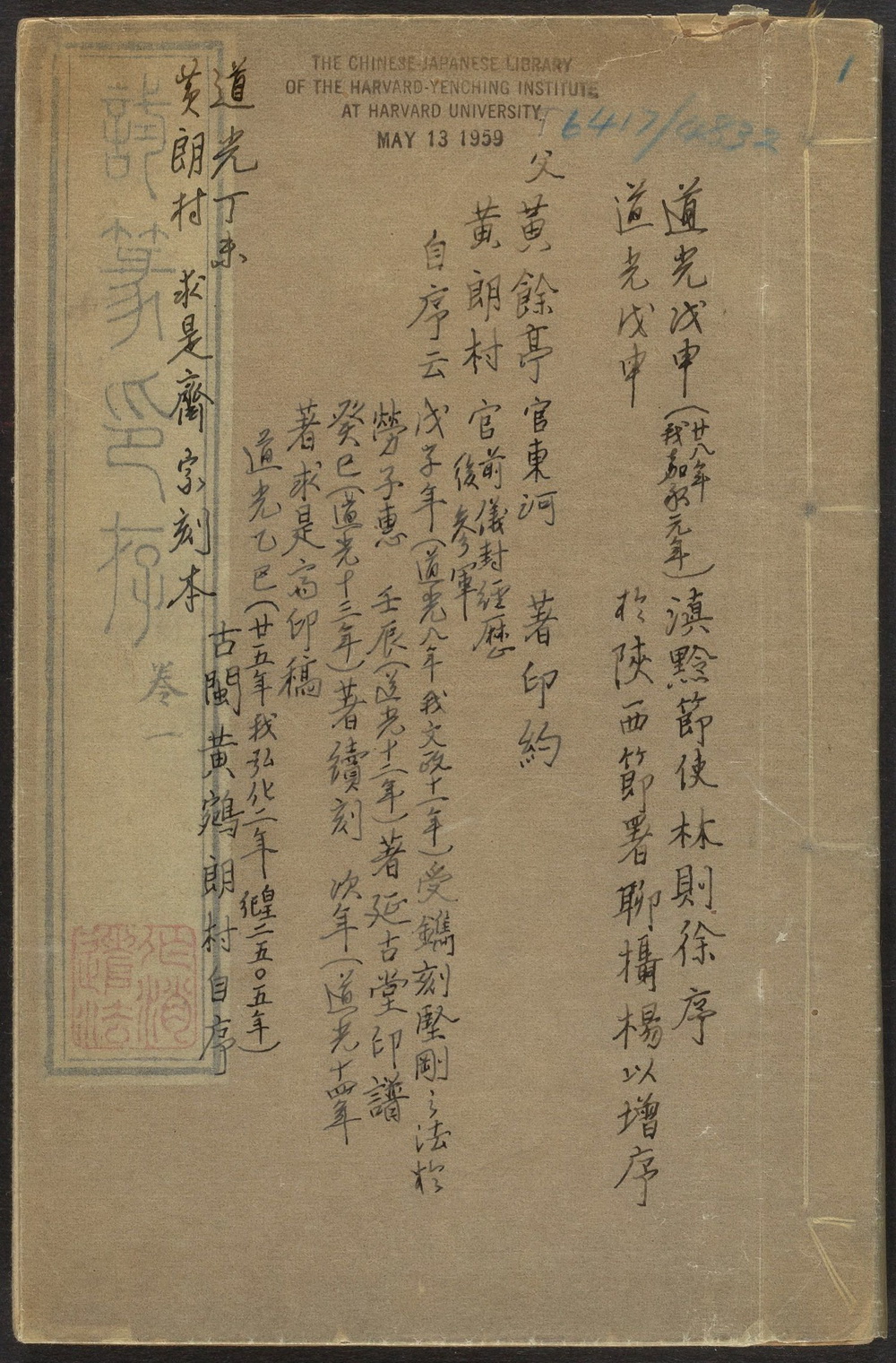 《试篆存稿》为清代篆刻家黄鹓印辑,封面题:试篆印存。全书共八卷,收其自刻印,每页一至三印不等,下注释文及材质,收印数百方。此为清道光二十七年黄氏求是斋钤印本,书前有林则徐(时任云贵总督)、杨以增及自序。