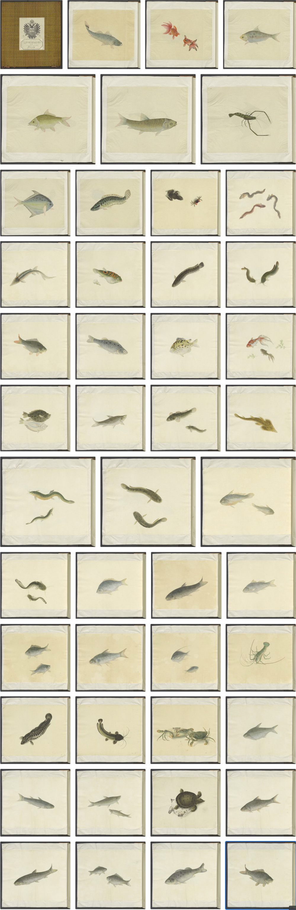 水族生物,包含插图45幅,描绘各类鱼类、虾蟹等。